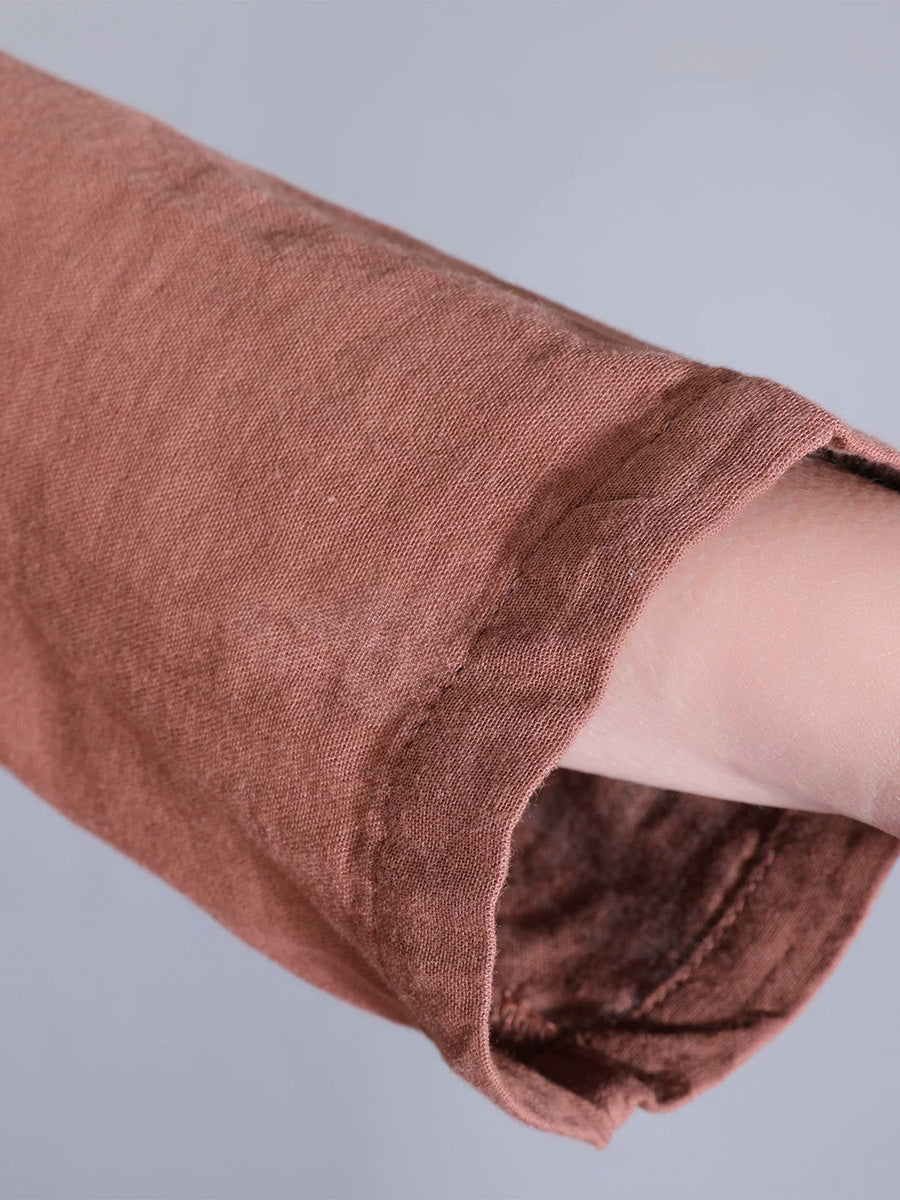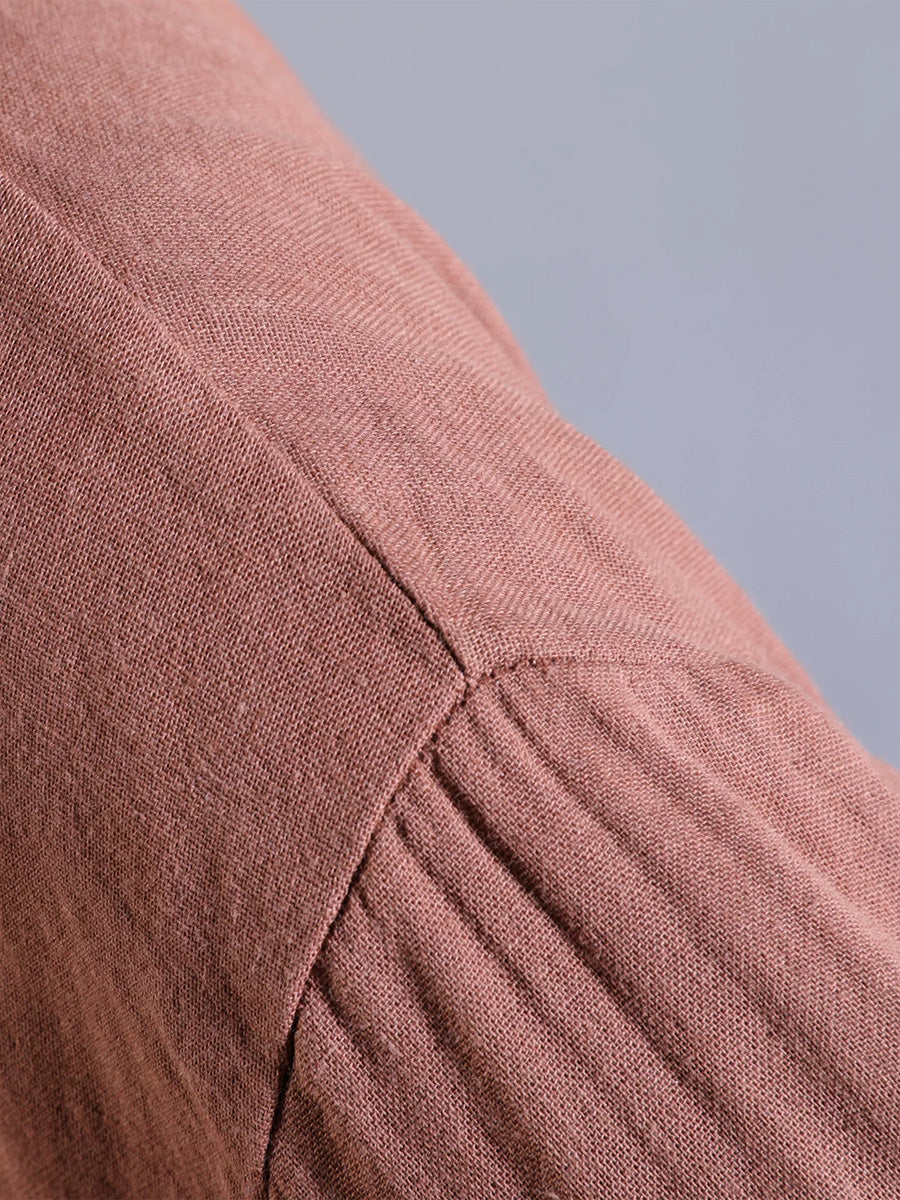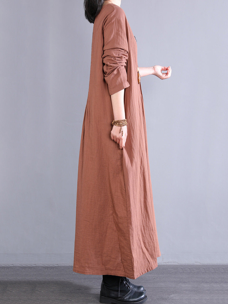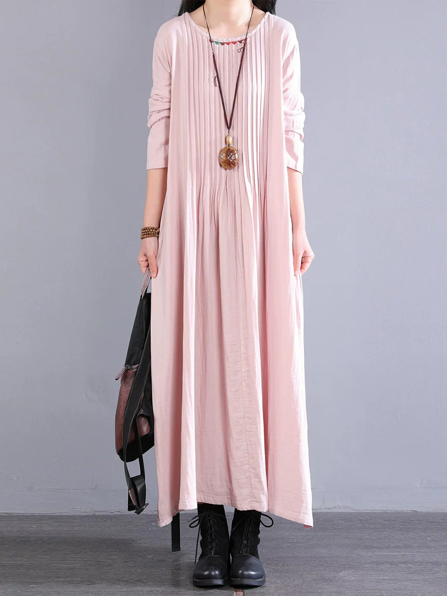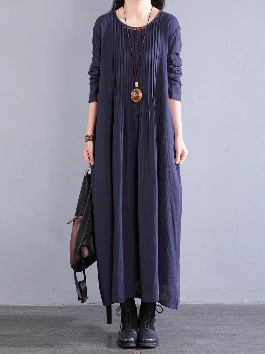 Women Artsy Pure Color Shirred 100%Cotton O-Neck Dress