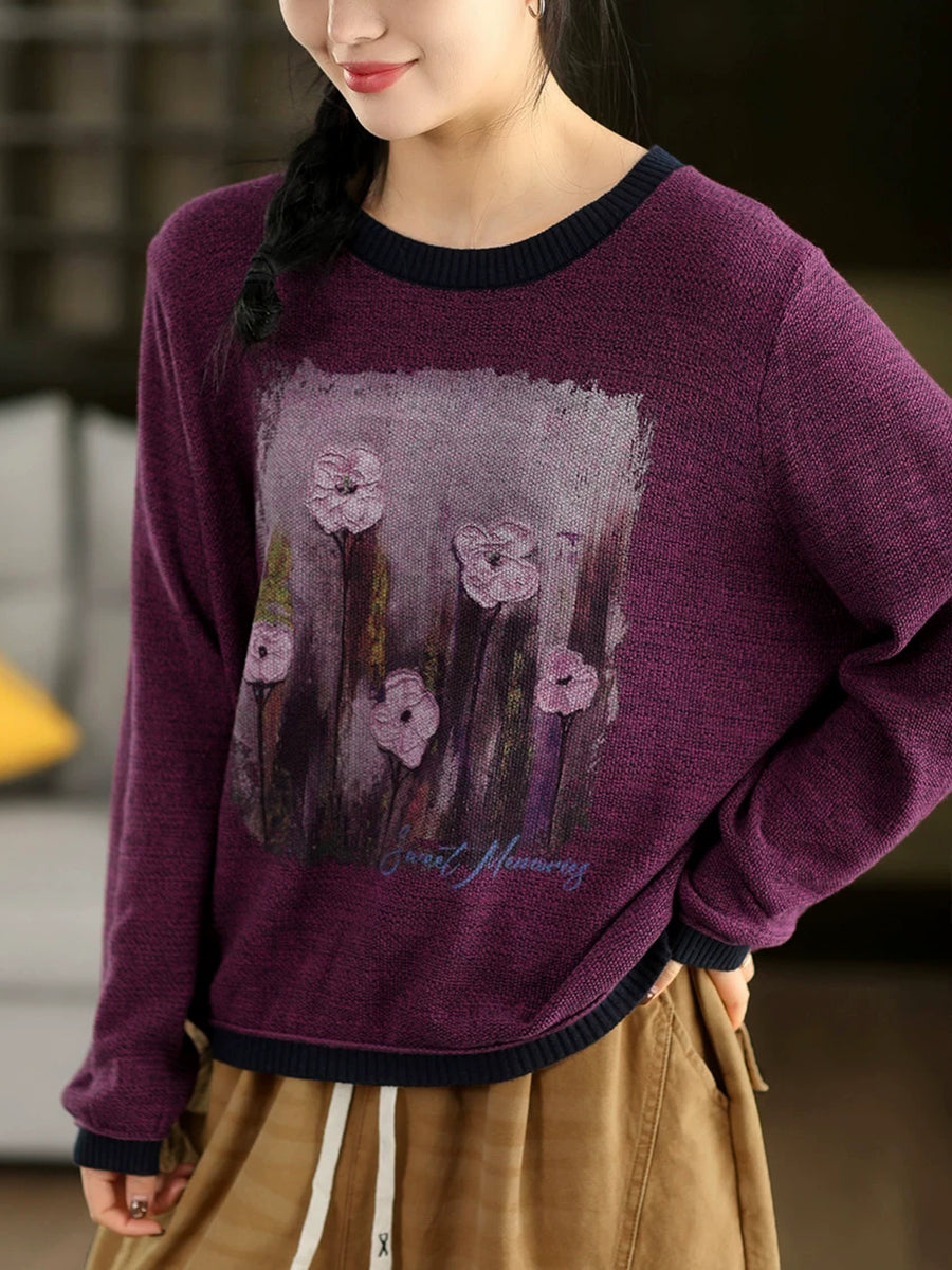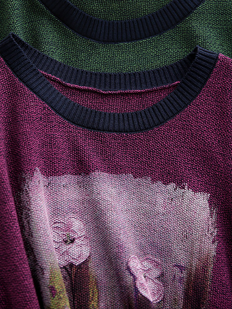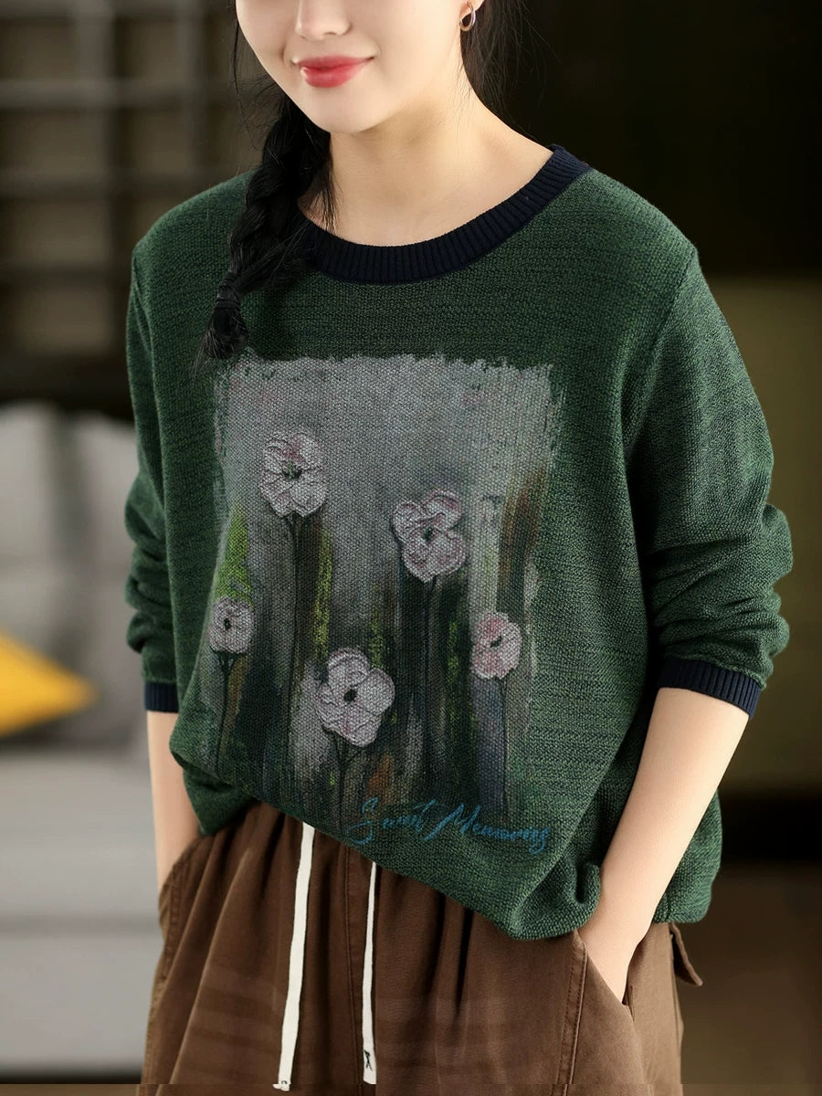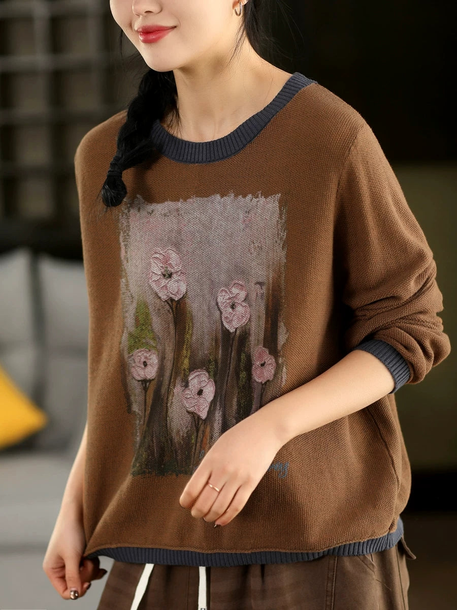 Women Artsy Spring Flower O-Neck Colorblock Sweater