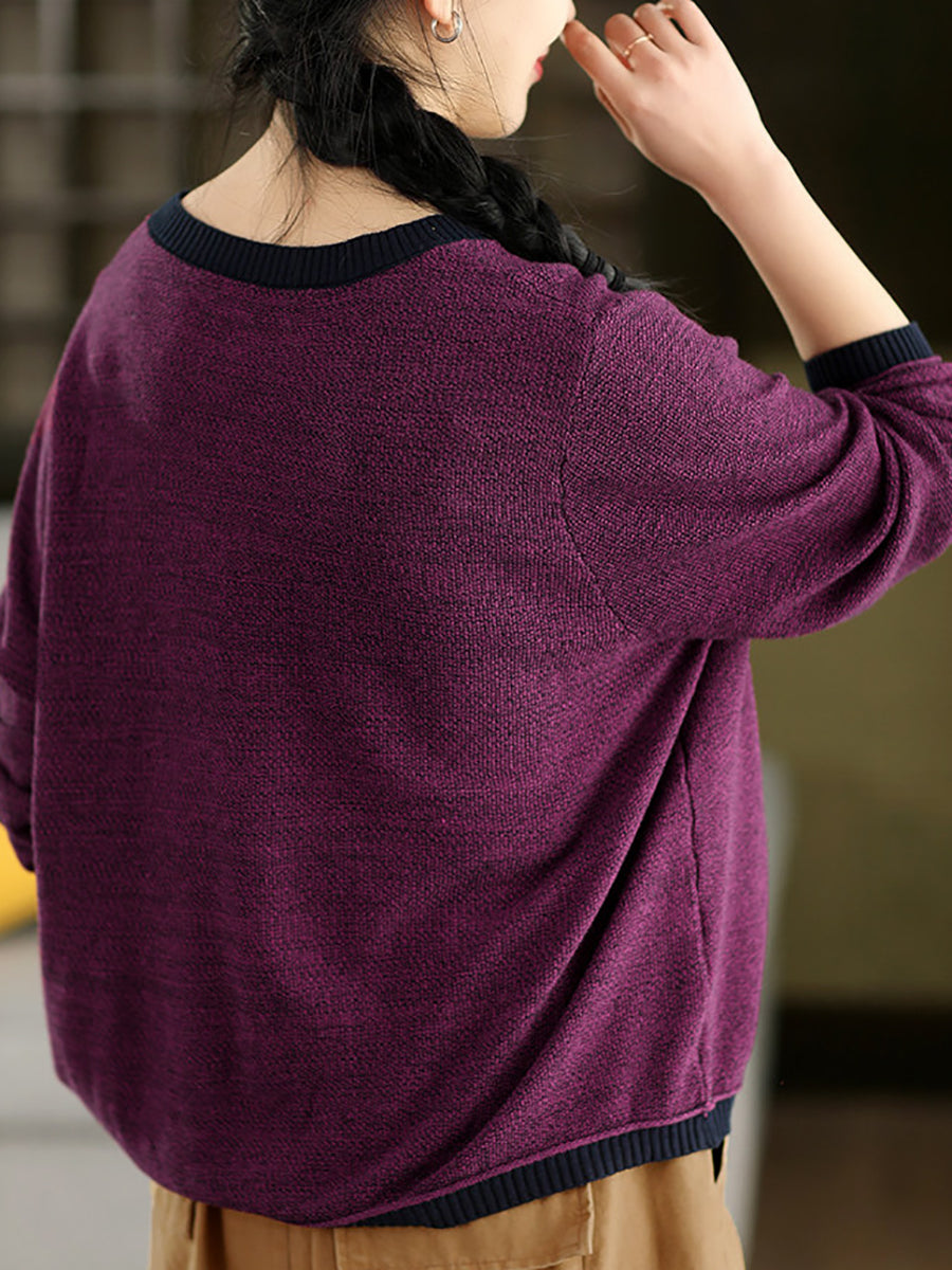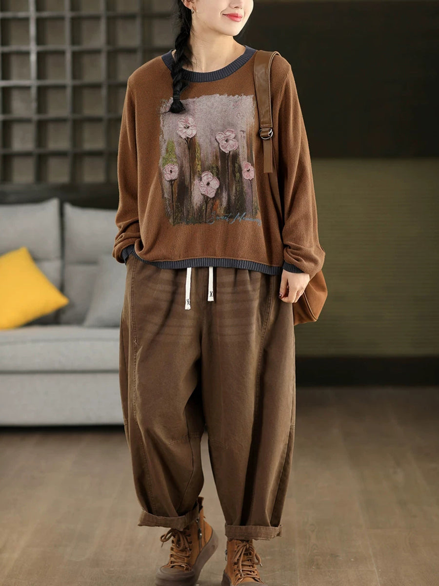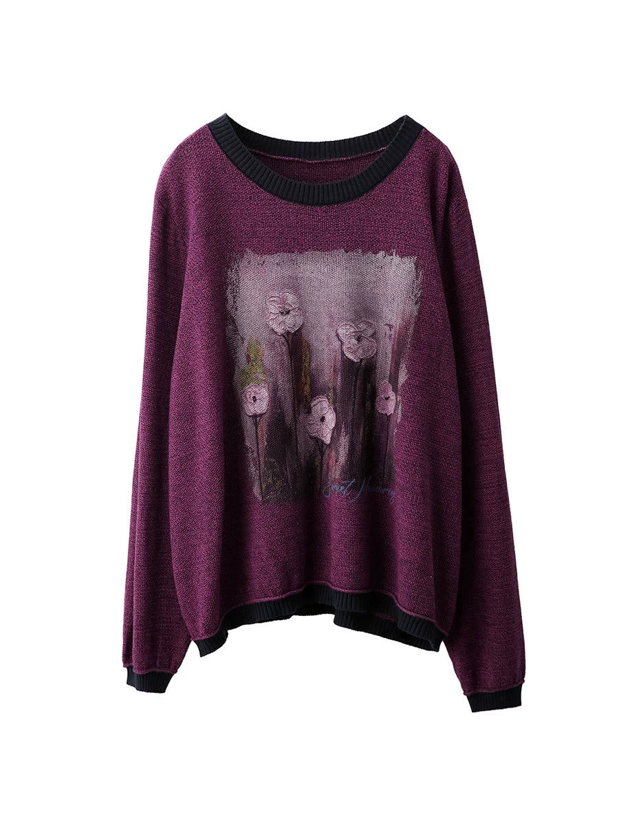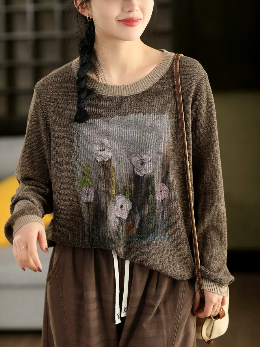 Women Artsy Spring Flower O-Neck Colorblock Sweater