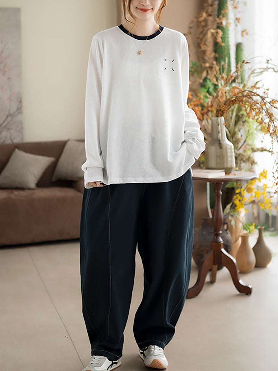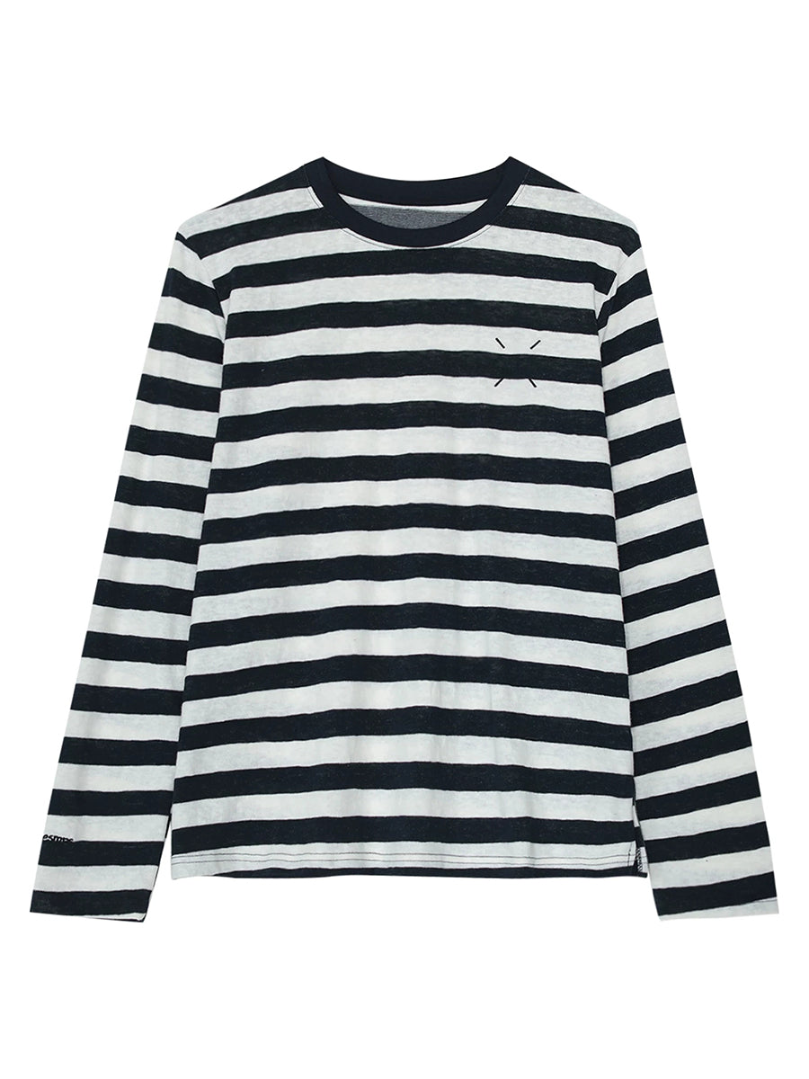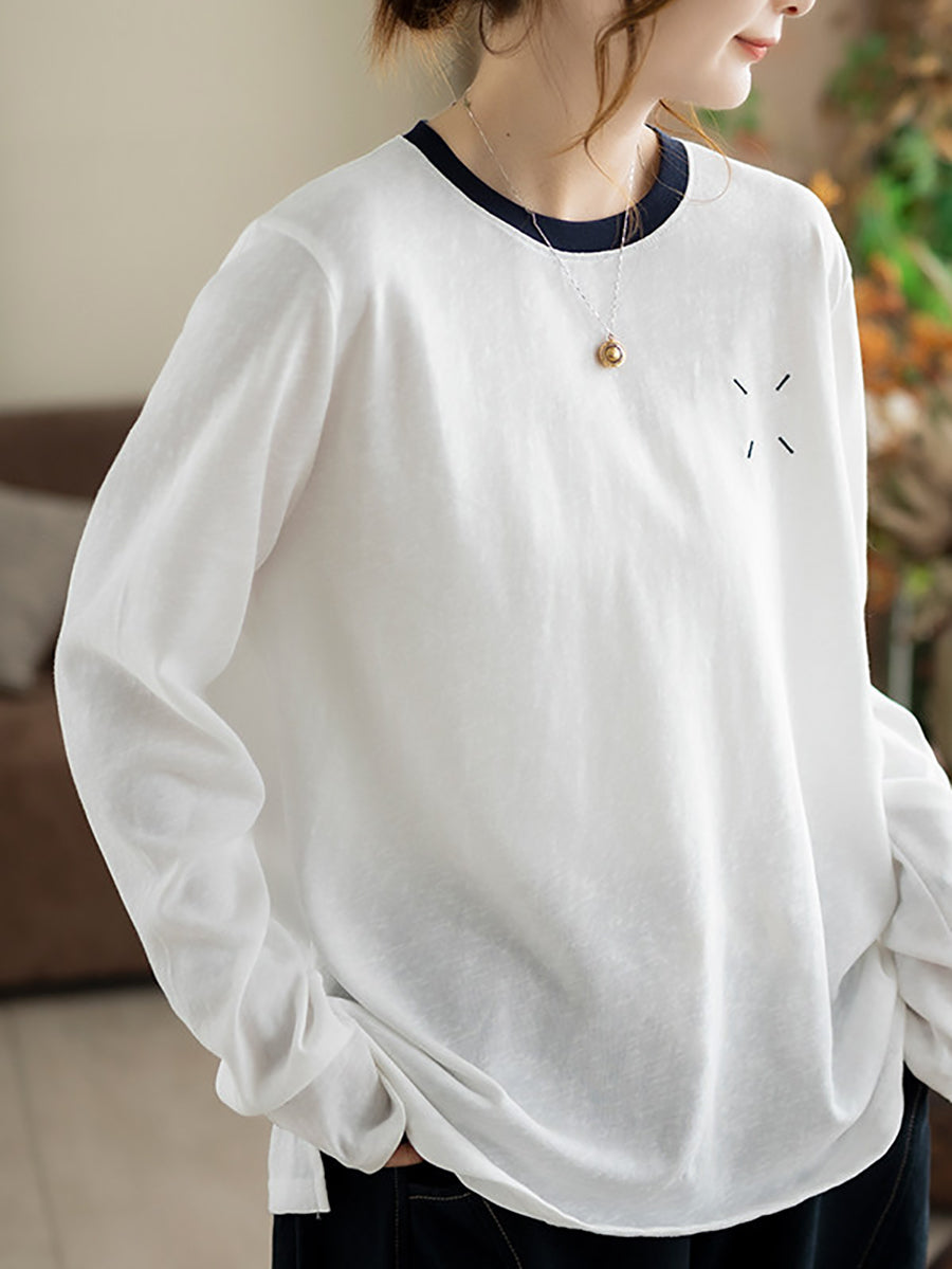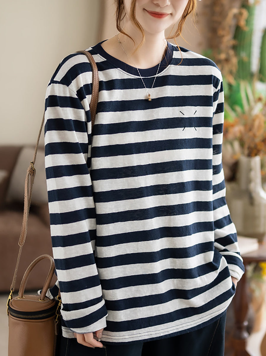 Women Artsy Spring Stripe O-Neck Cotton Blouse