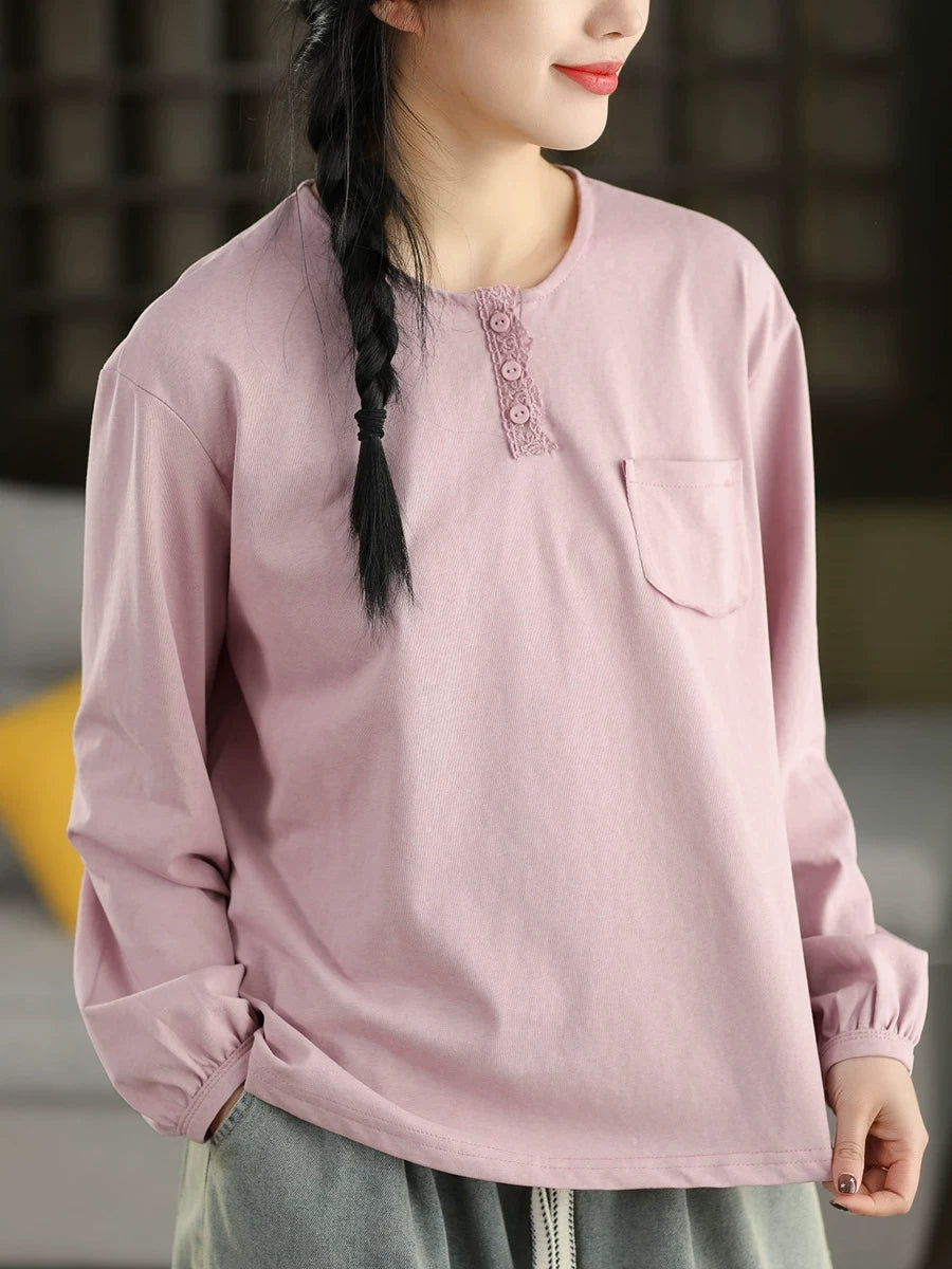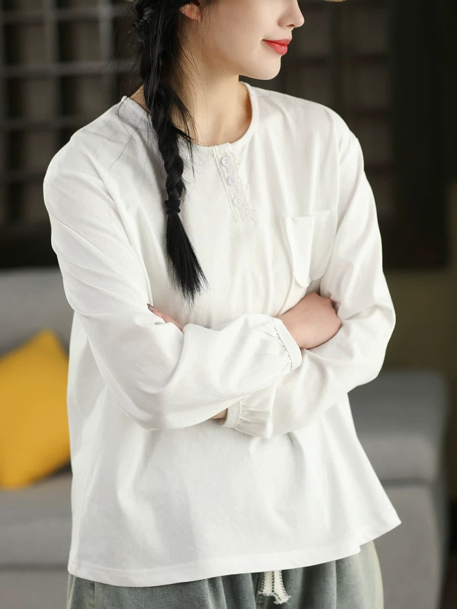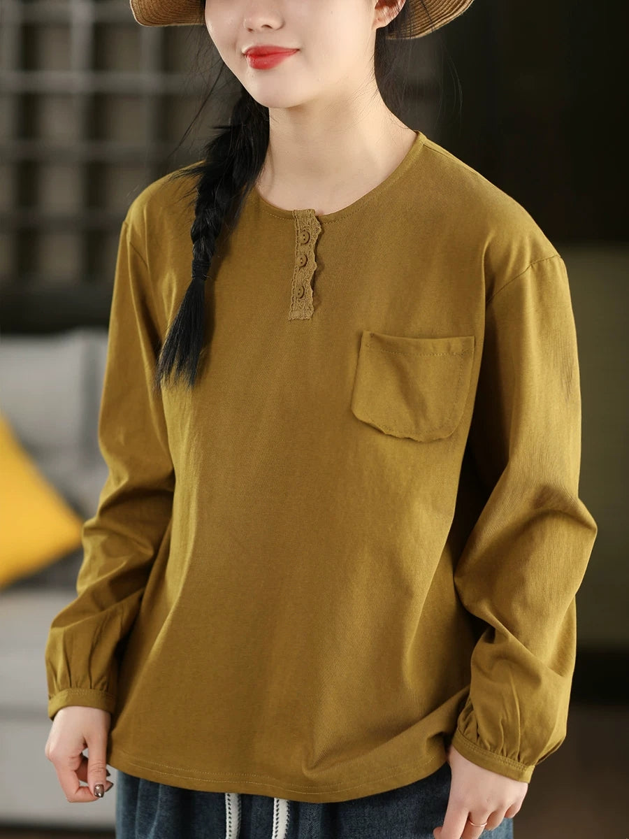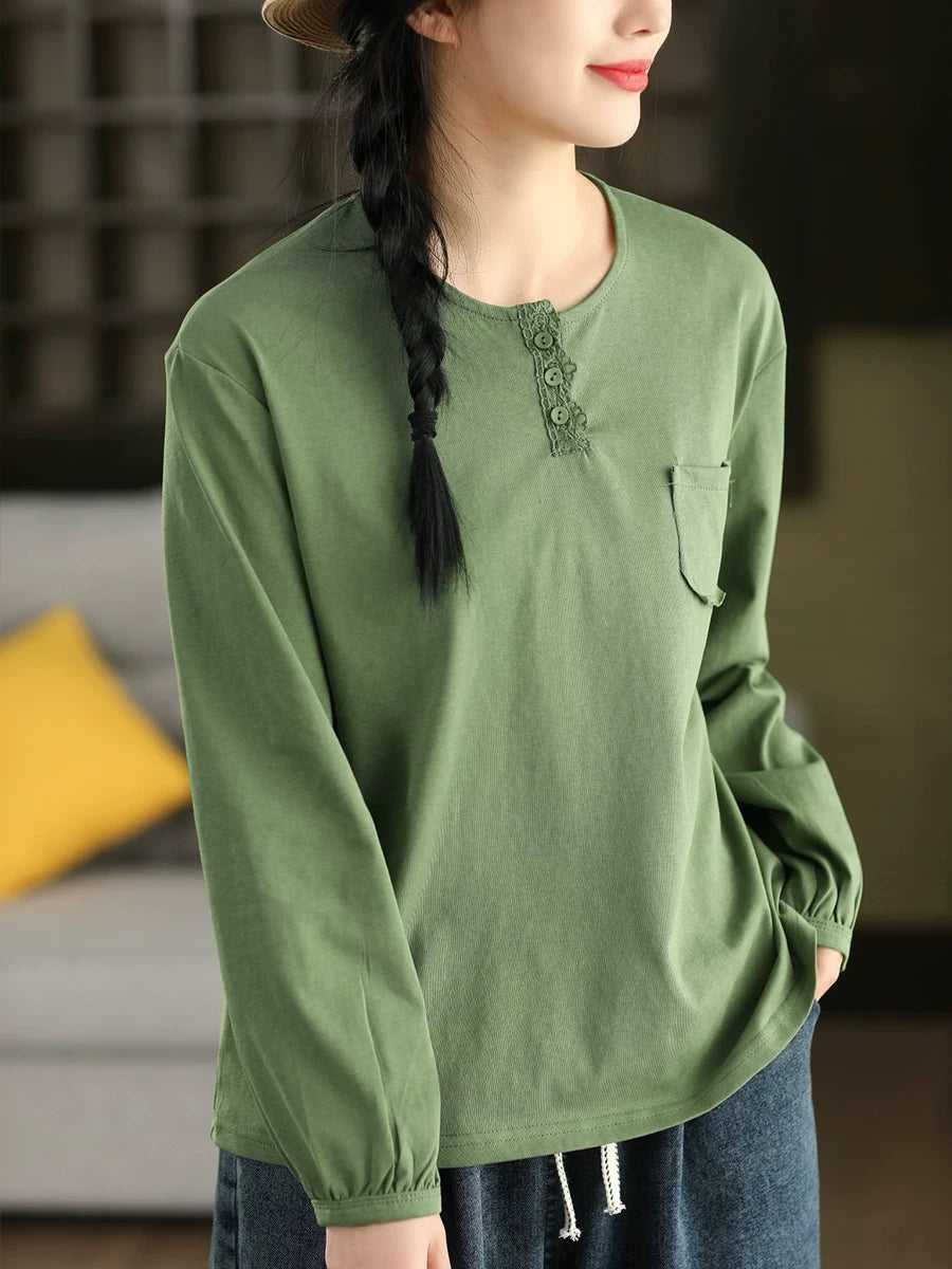Women Artsy Spring Pure Color Cotton O-Neck Blouse