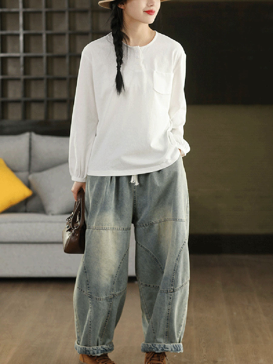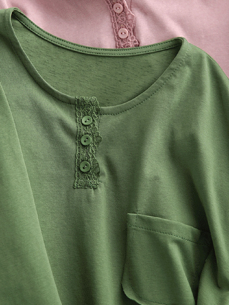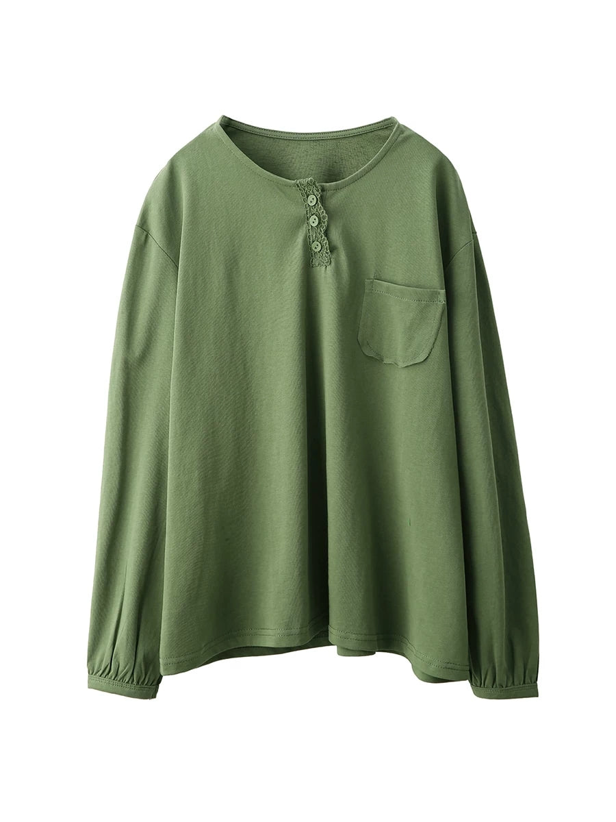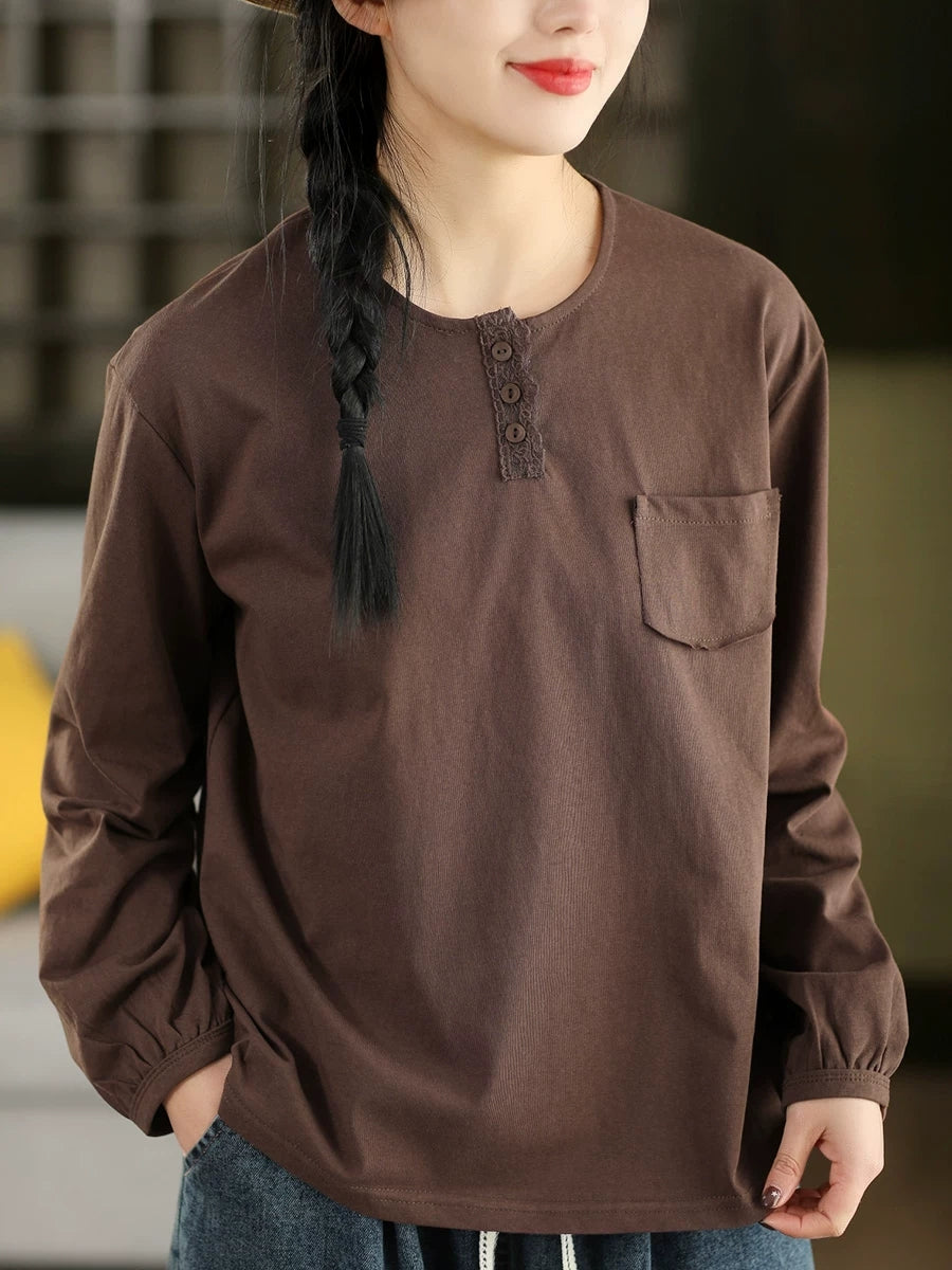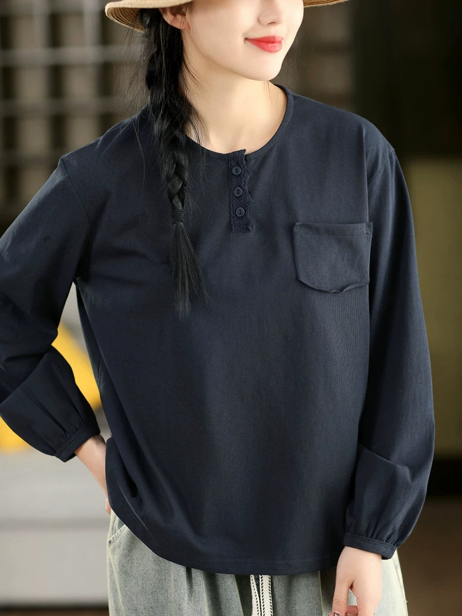 Women Artsy Spring Pure Color Cotton O-Neck Blouse