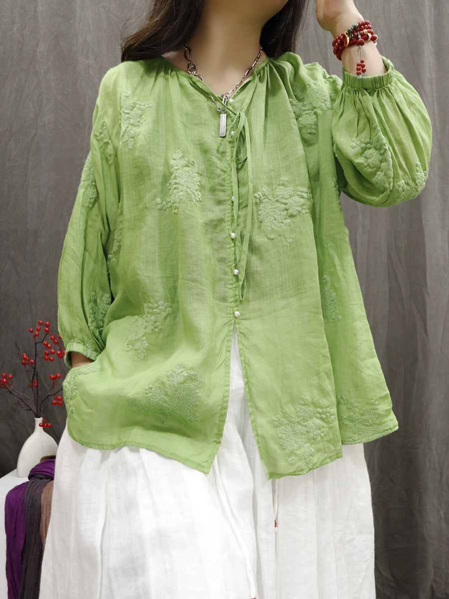 Women Artsy Summer Embroidery V-Neck 100%Ramie Blouse