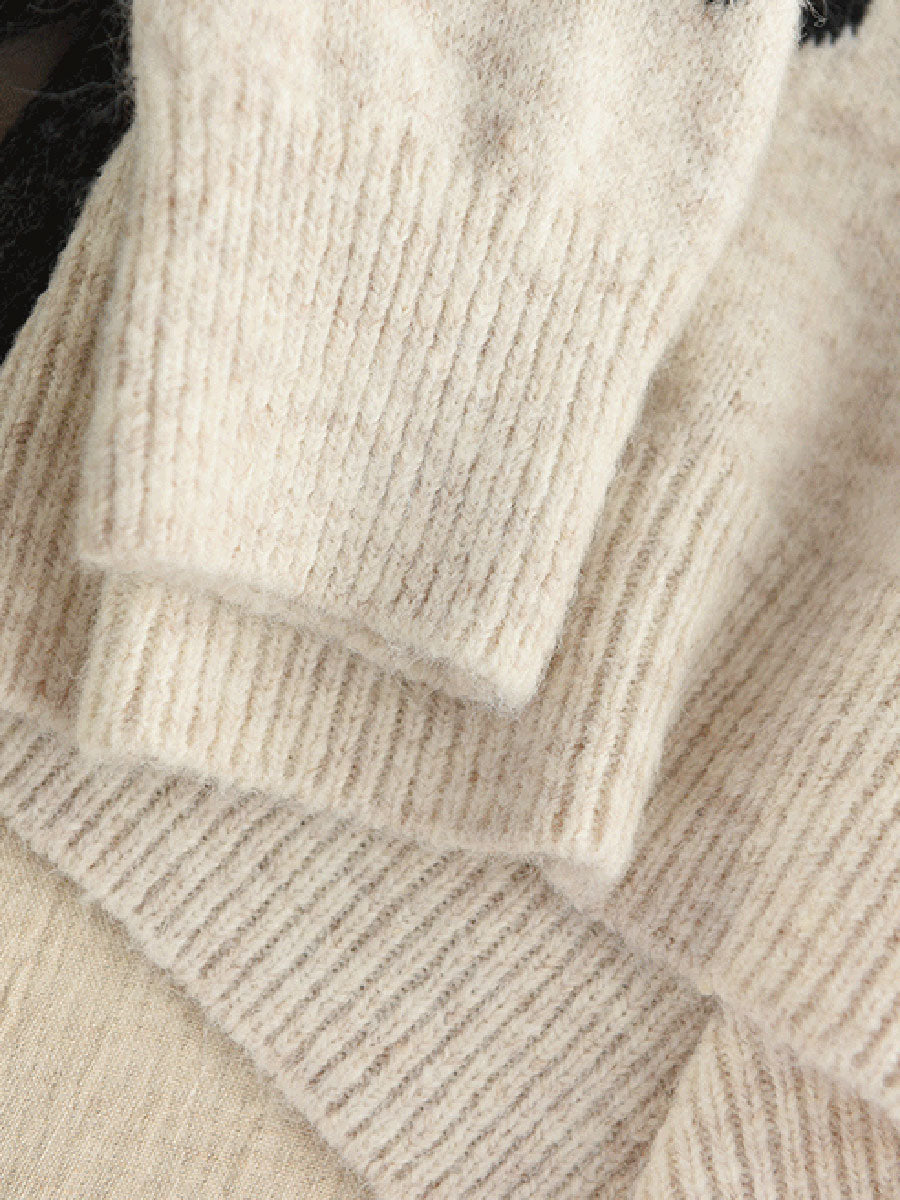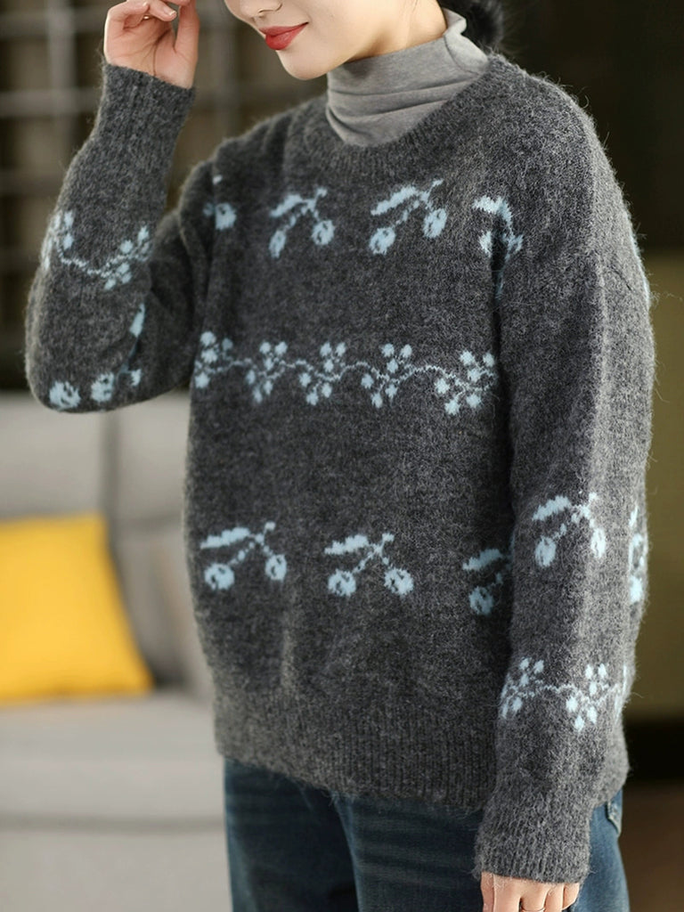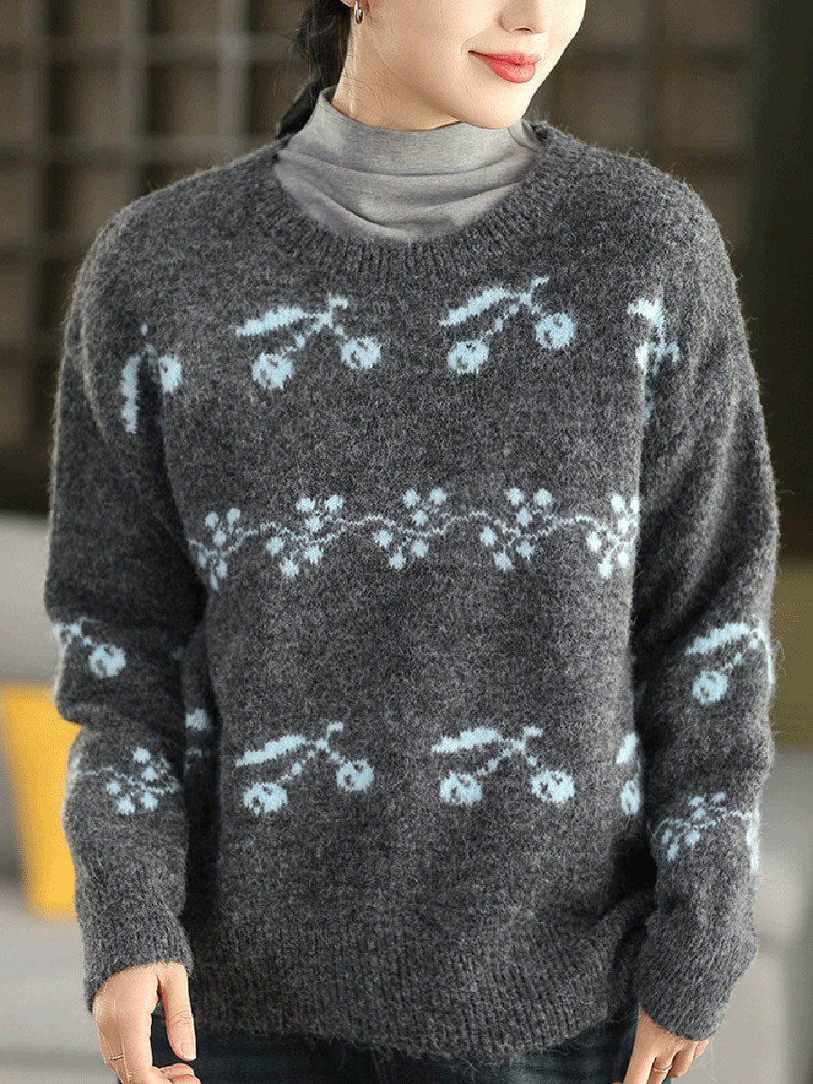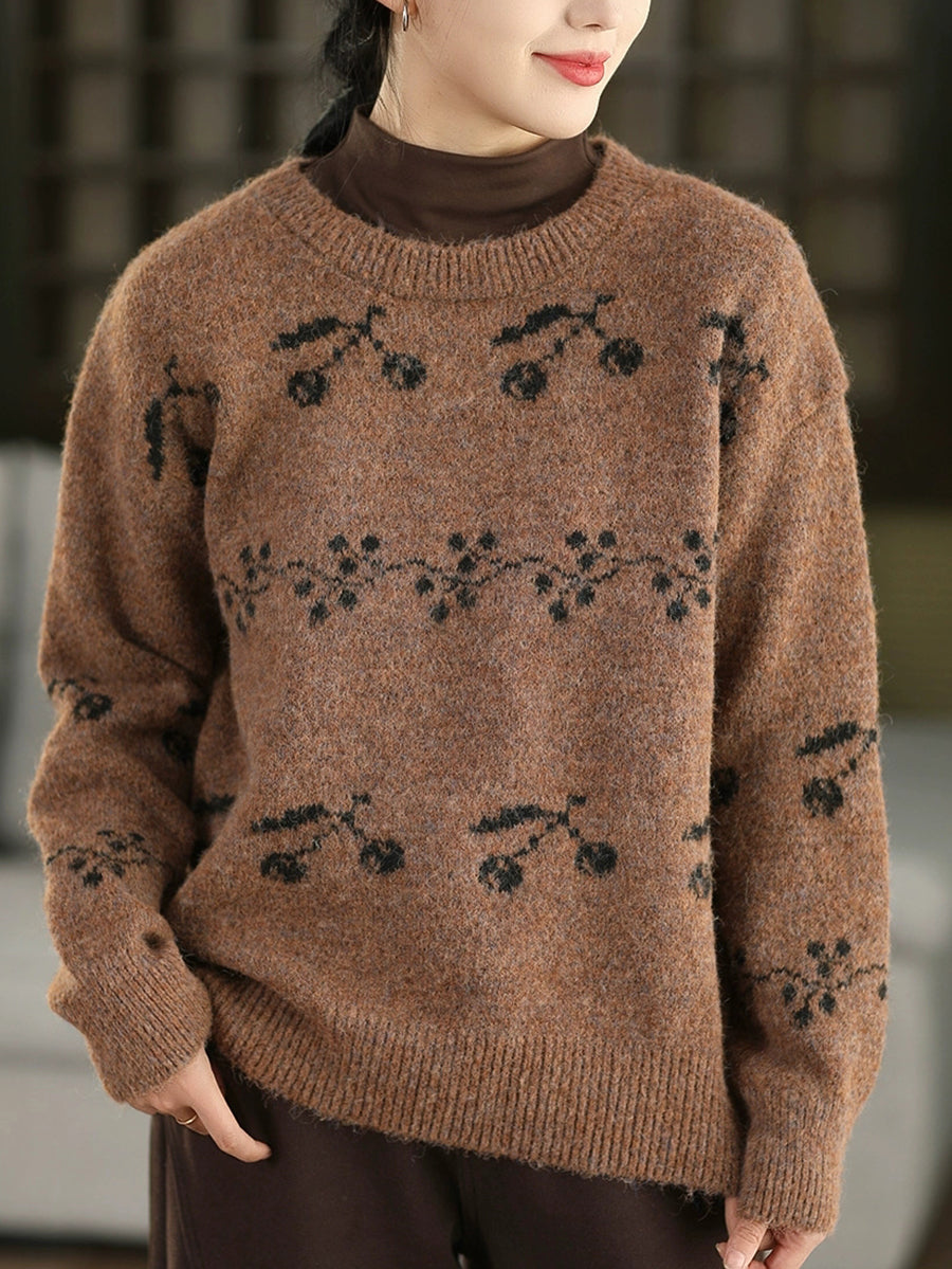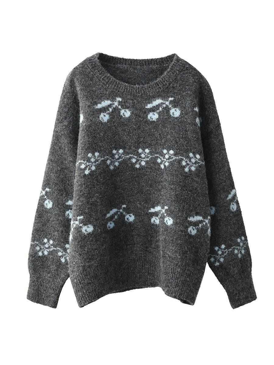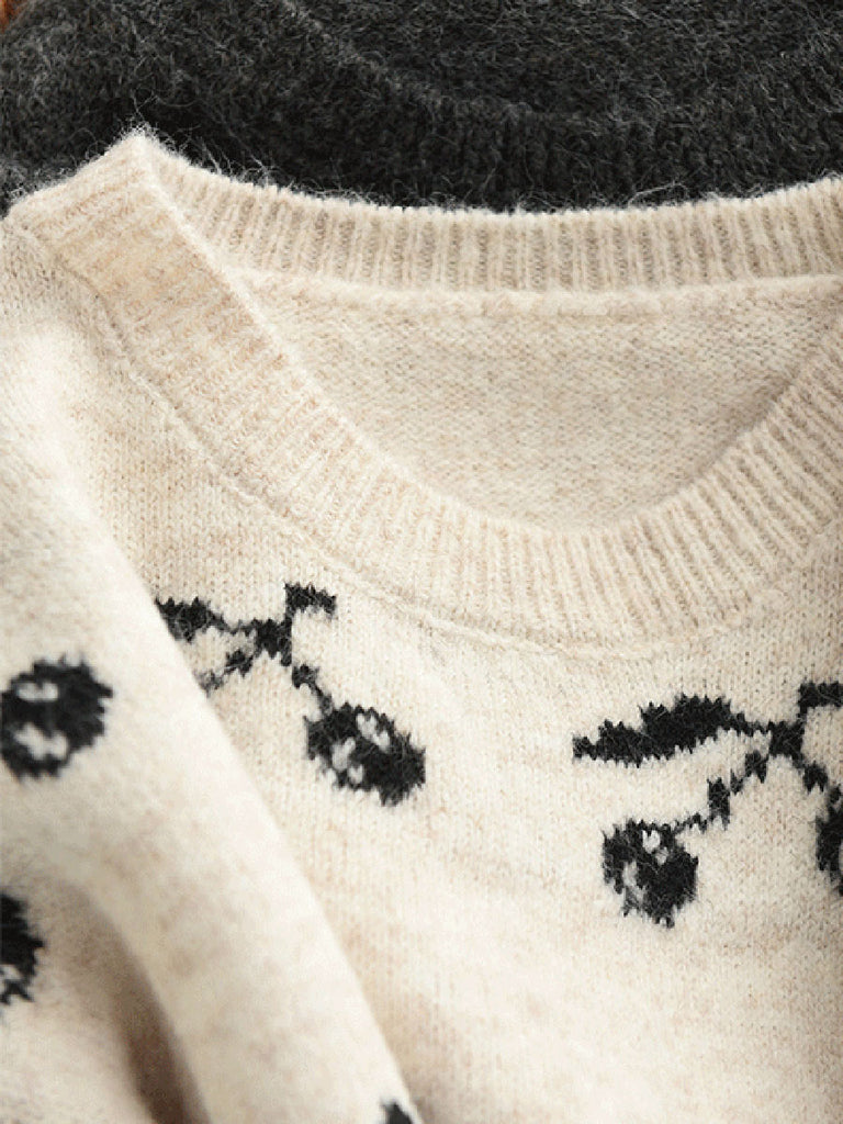 Women Autumn Artsy Cherry Jacquard O-Neck Sweater