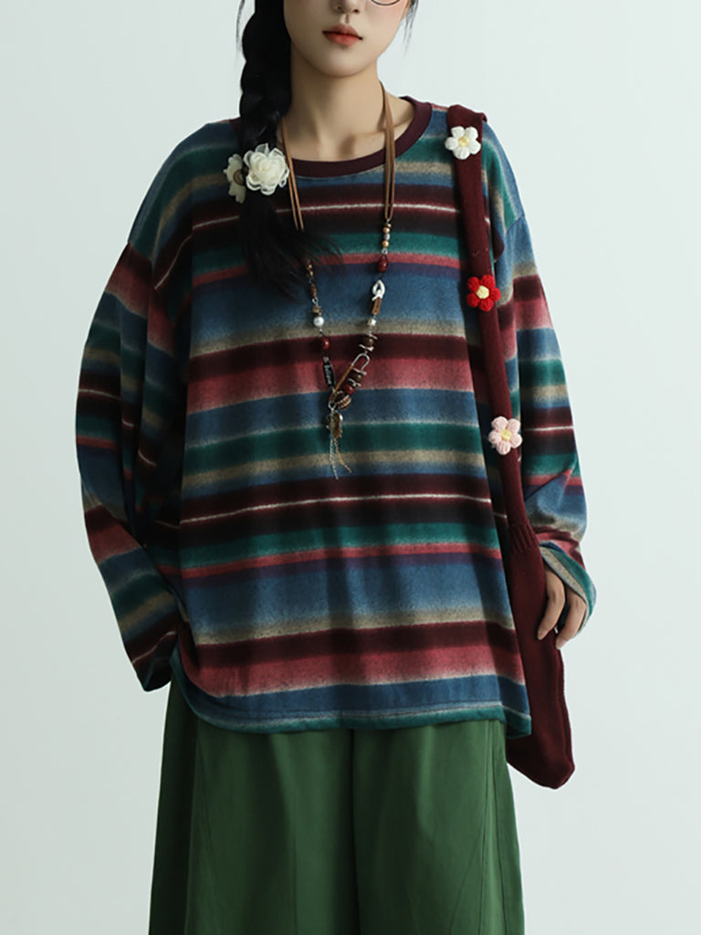 Women Autumn Artsy Stripe Cotton O-Neck Blouse