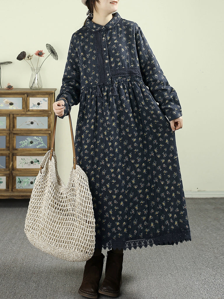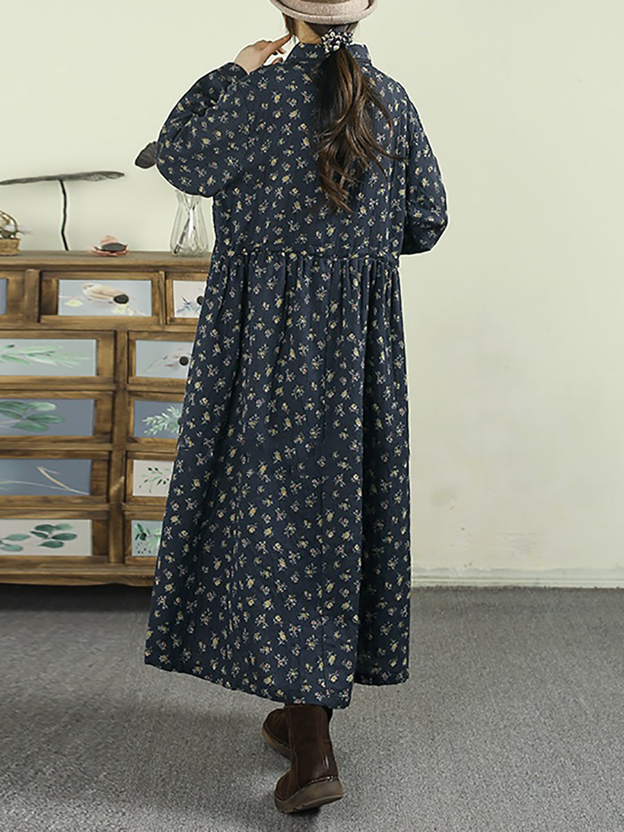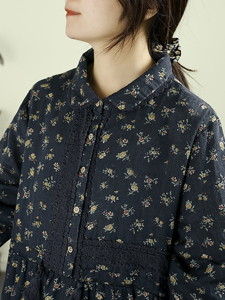 Women Autumn Vintage Floral Turn-down Collar 100%Cotton Dress