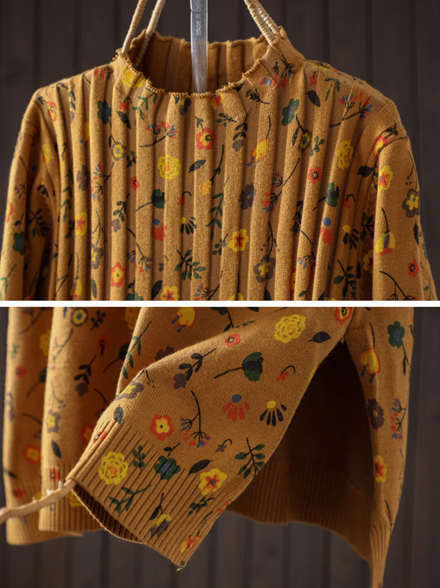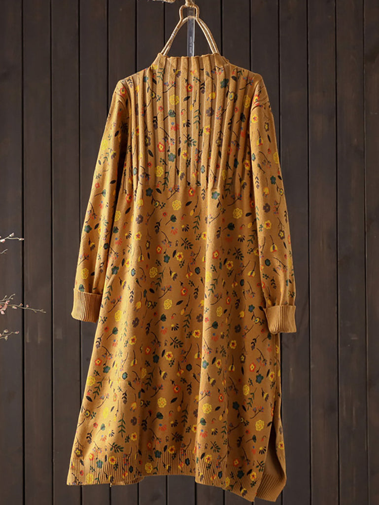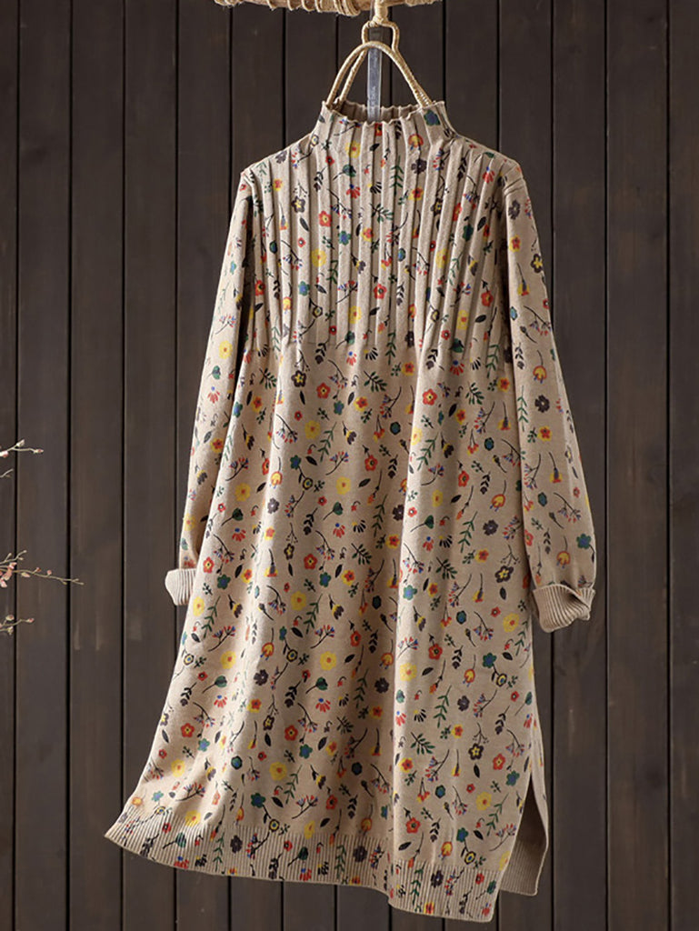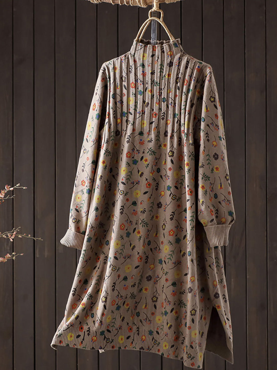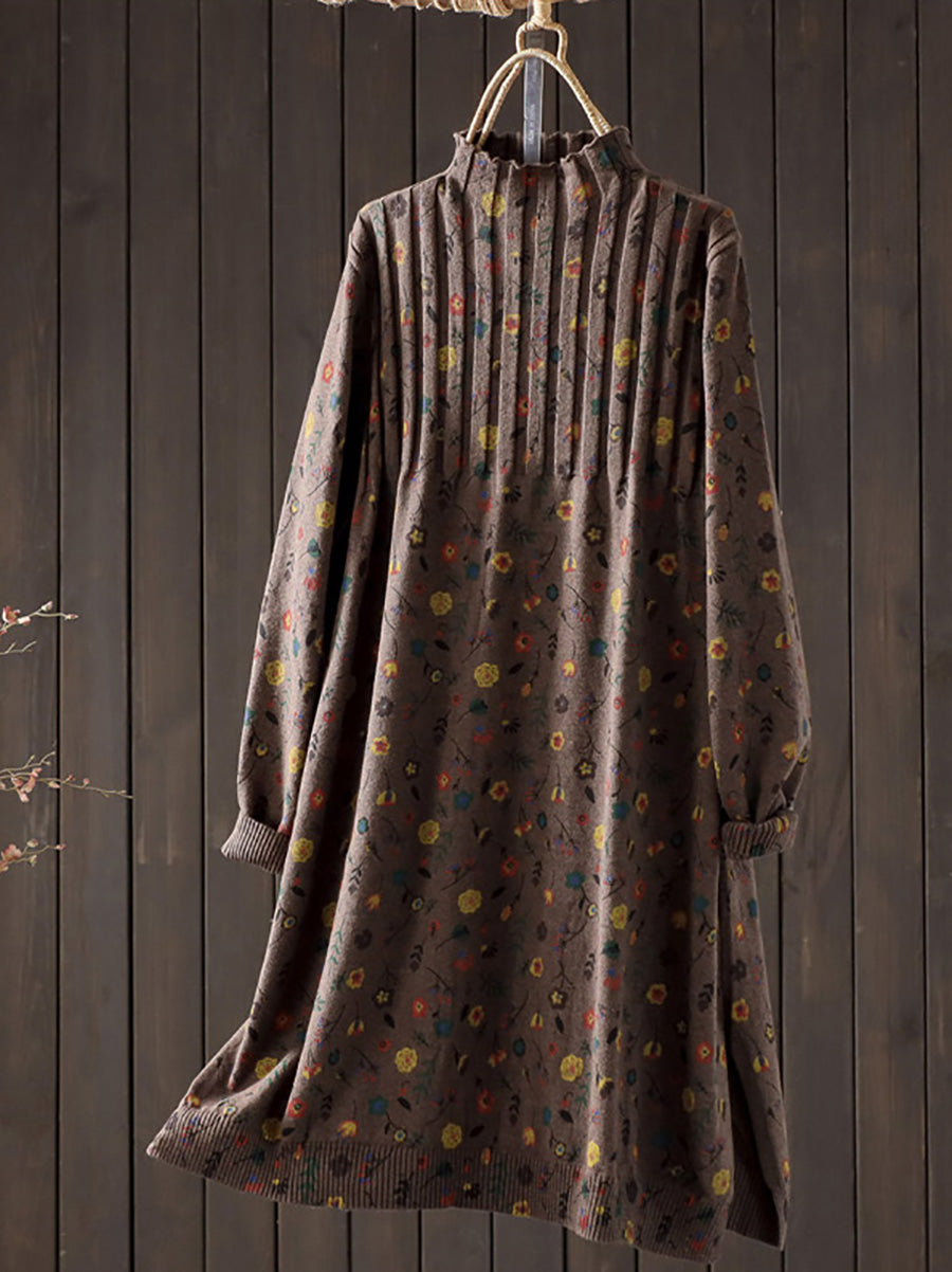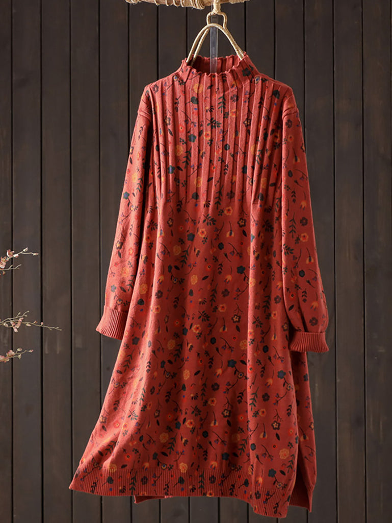 Women Autumn Vintage Flower Half-Turtleneck Knitted Dress