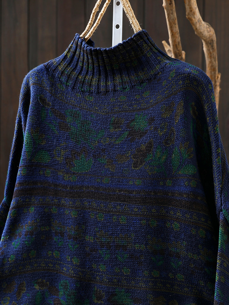Women Autumn Vintage Flower Half-Turtleneck Sweater