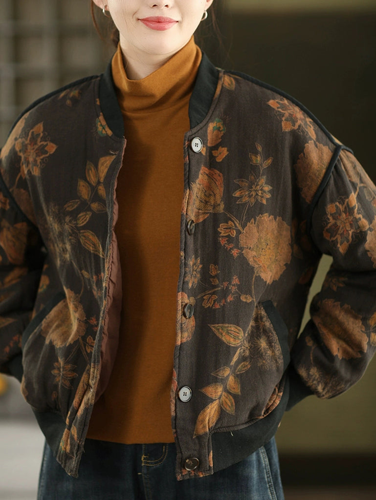 Women Autumn Vintage Flower Stand Collar Cotton Padded Jacket