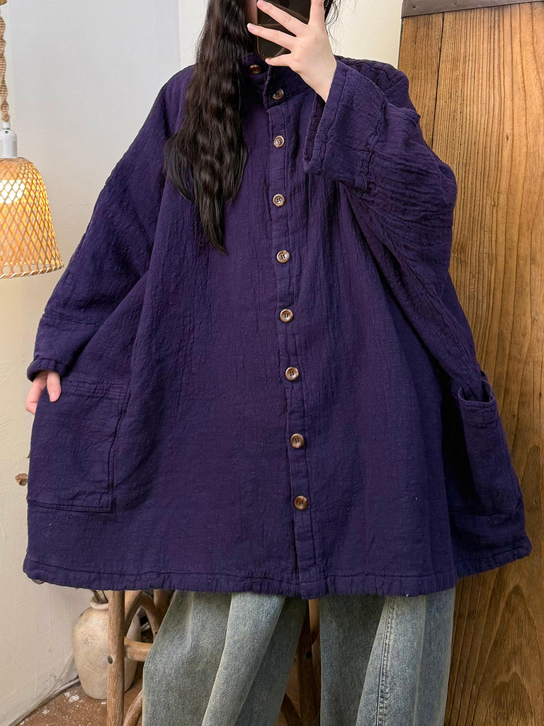 Women Autumn Vintage Pure Color Stand Collar Padded Coat