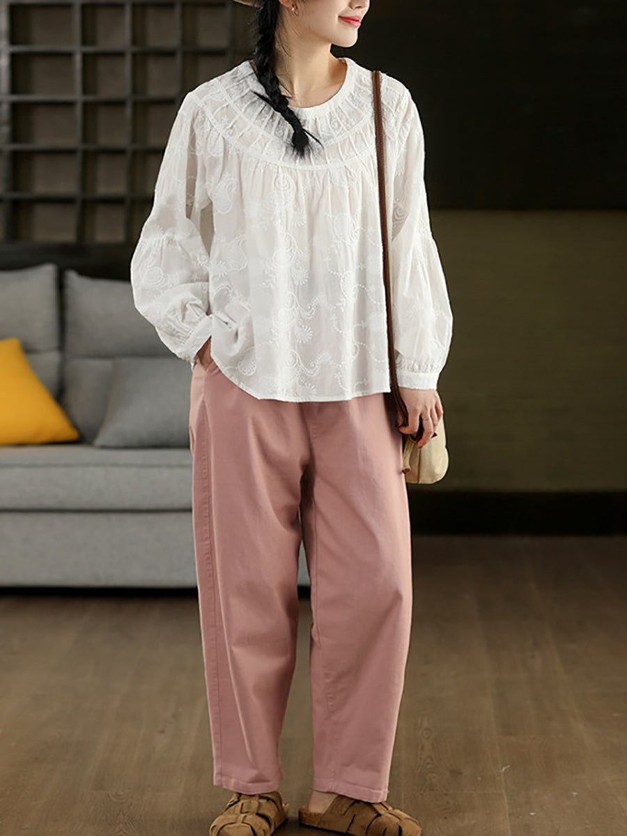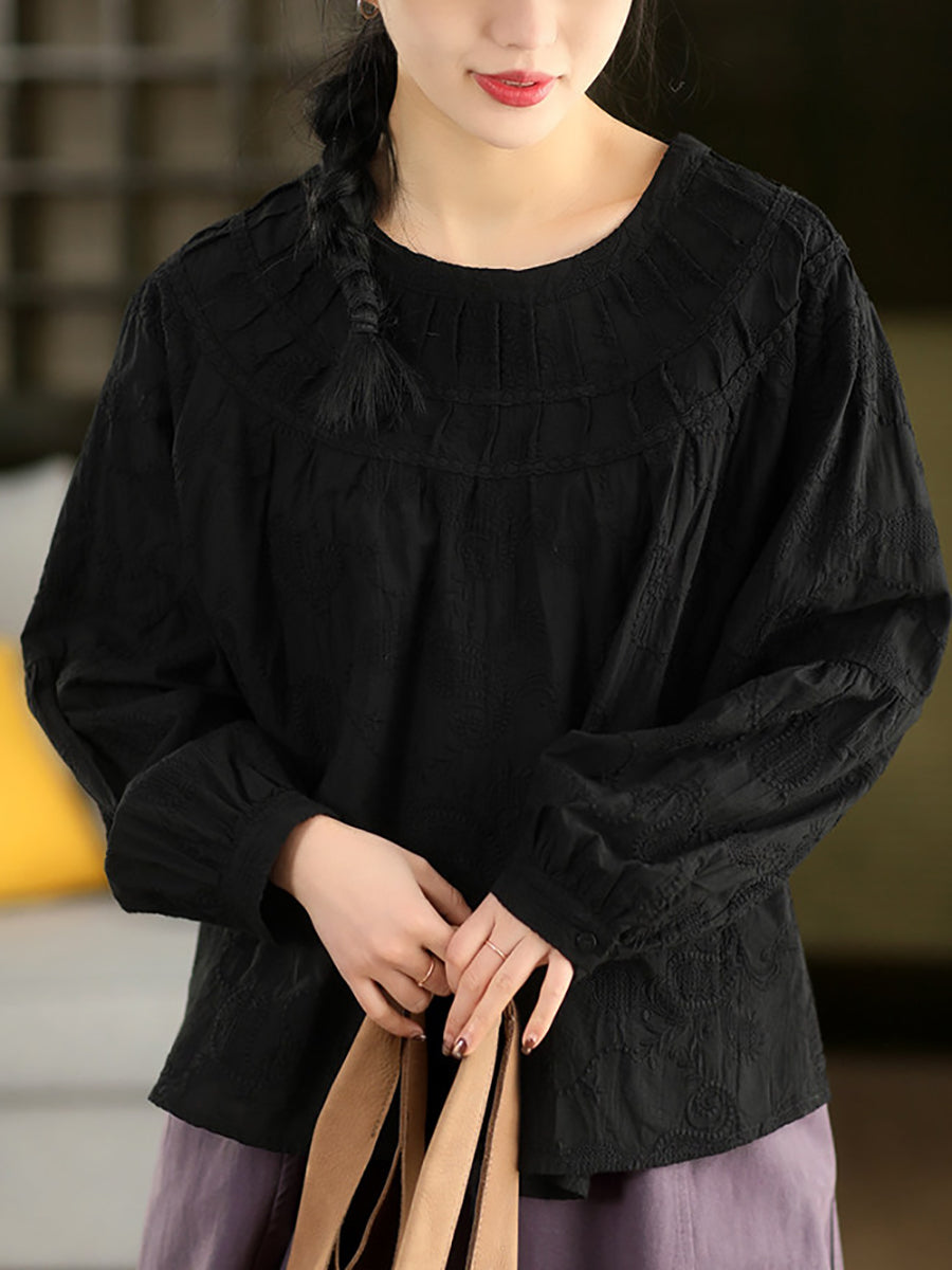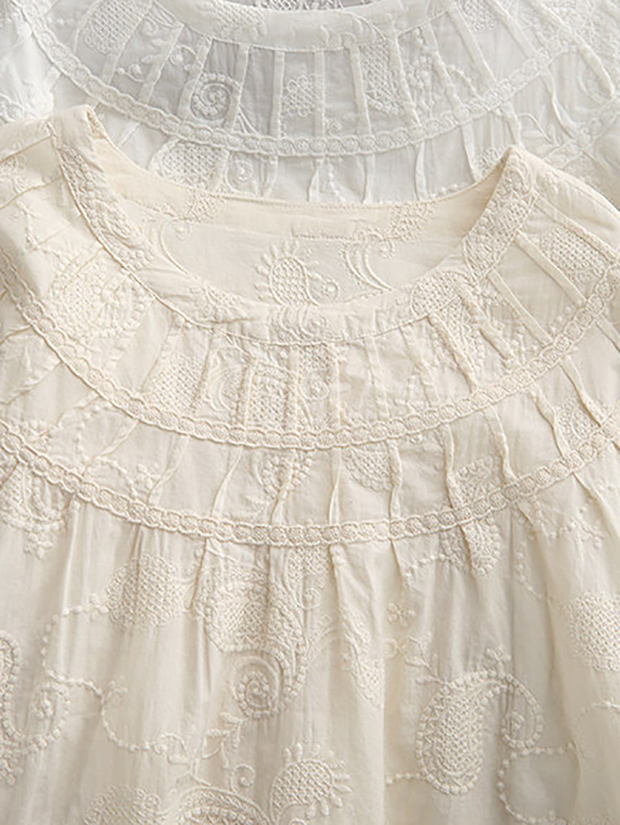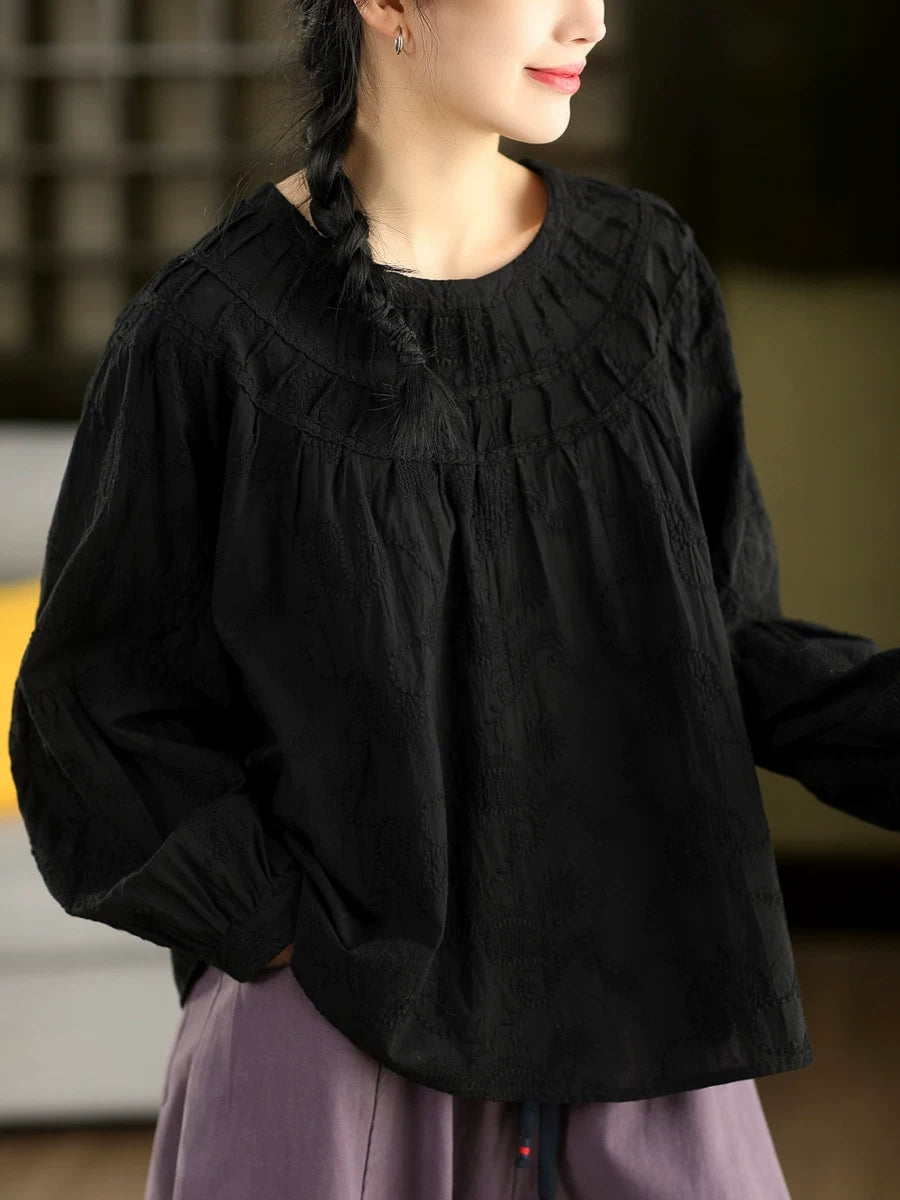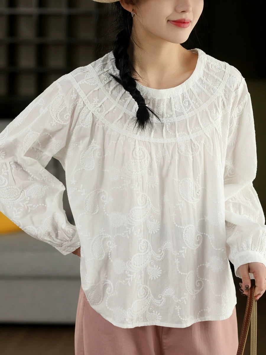 Women Spring Artsy Embroidery 100%Cotton O-Neck Shirt