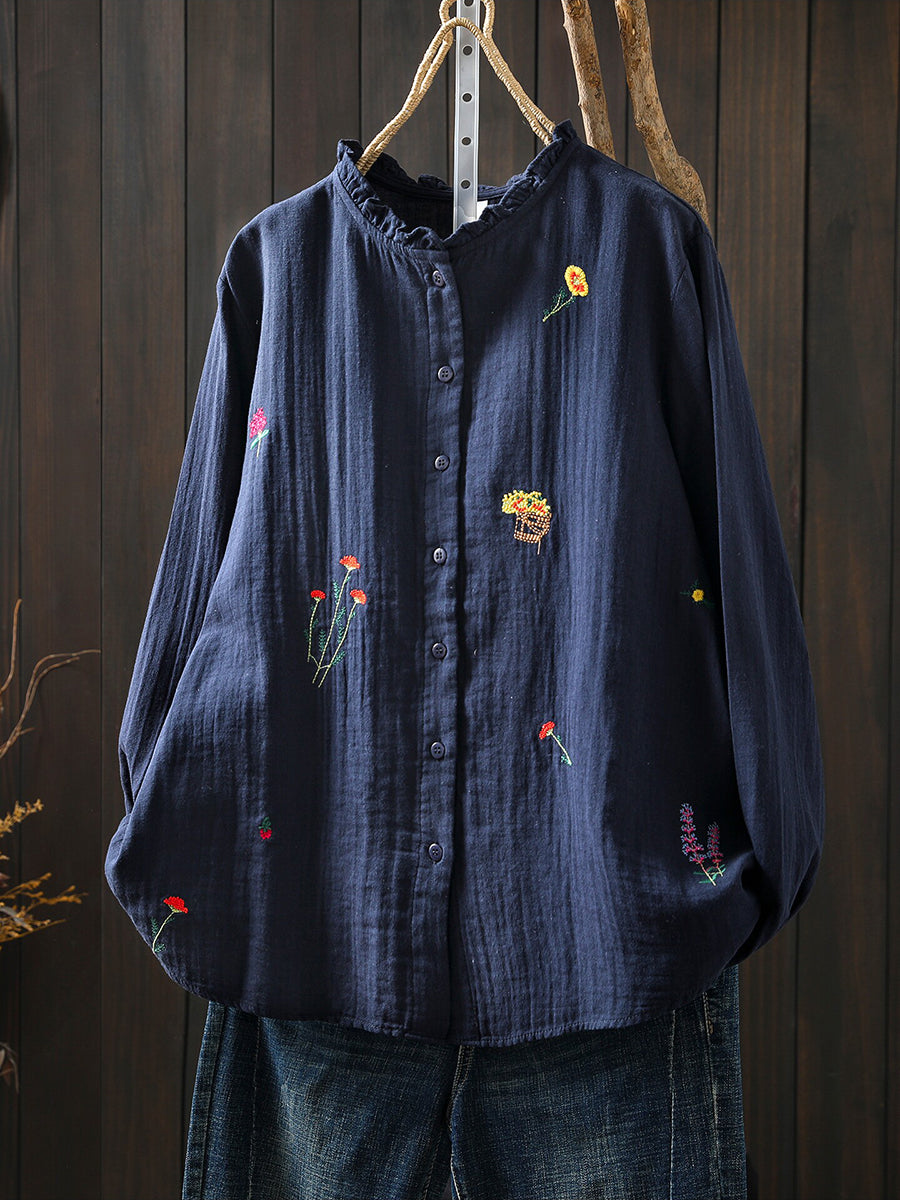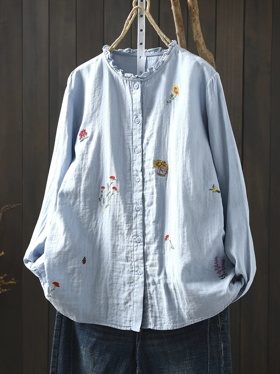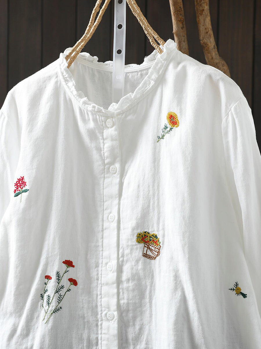 Women Spring Artsy Flower Embroidery 100%Cotton Shirt