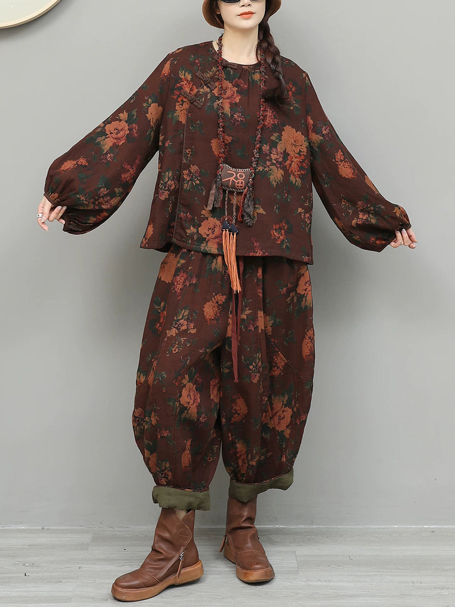 Women Spring Ethnic Flower Spliced O-Neck Suits