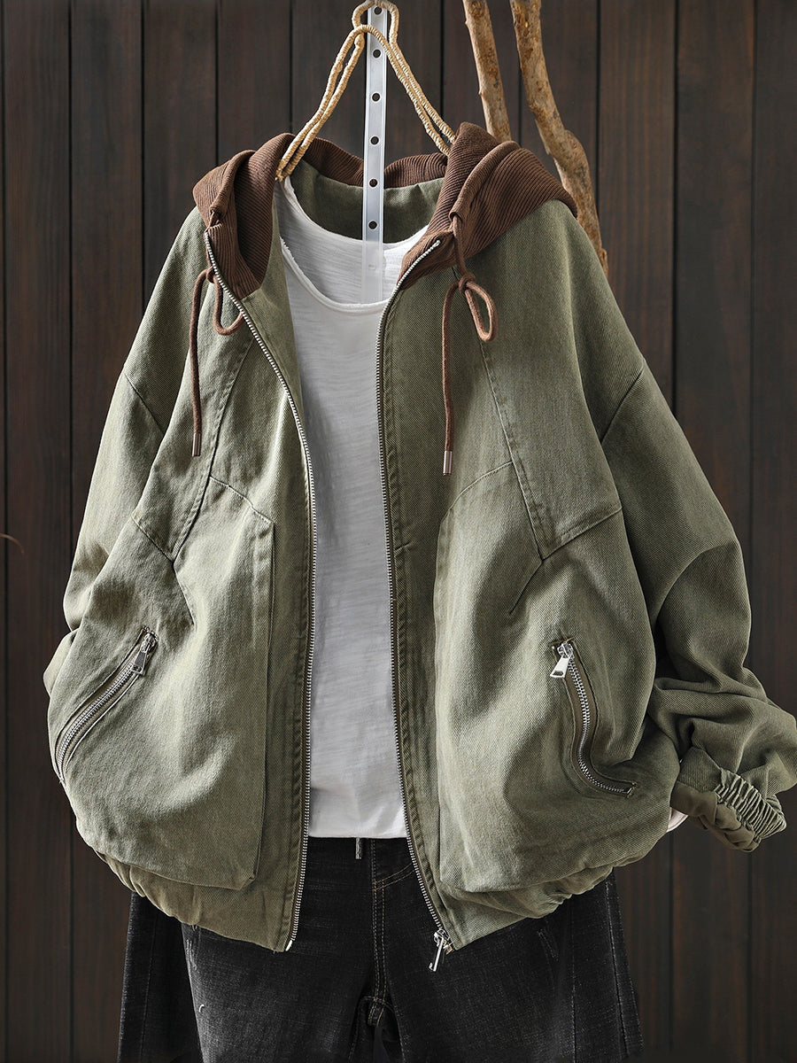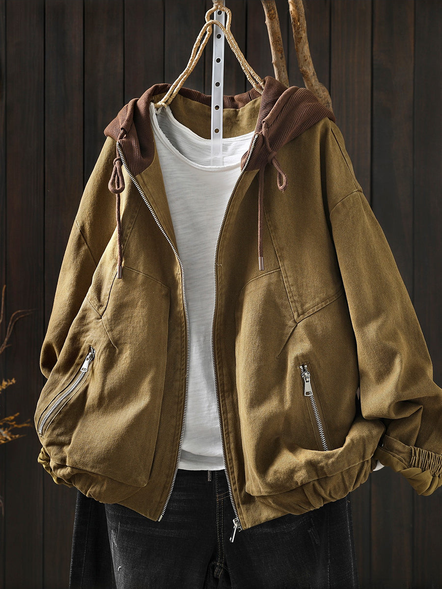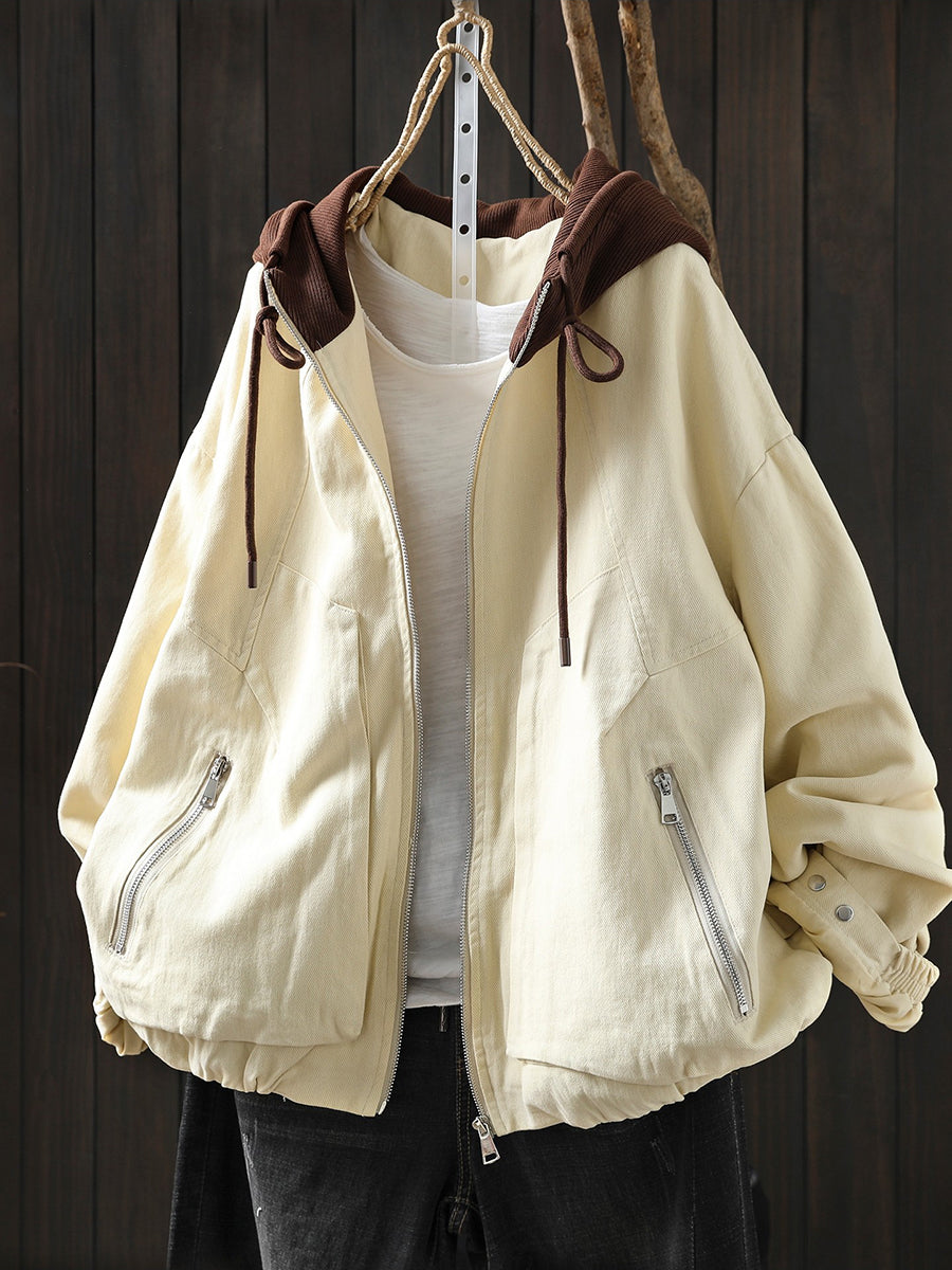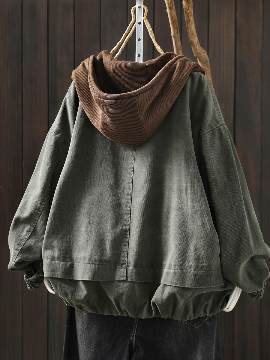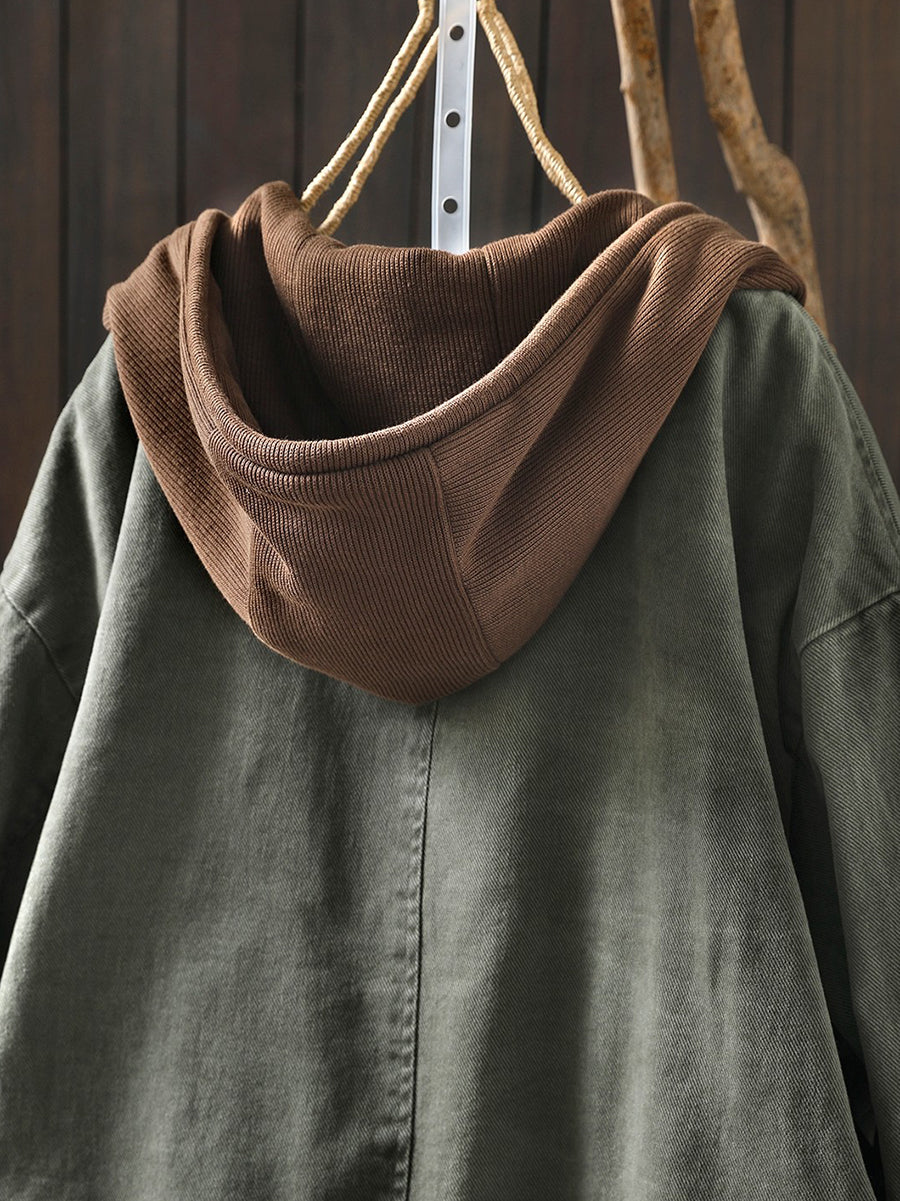 Women Spring Retro Colorblock Cotton Hooded Jacket