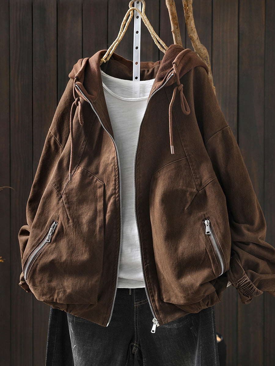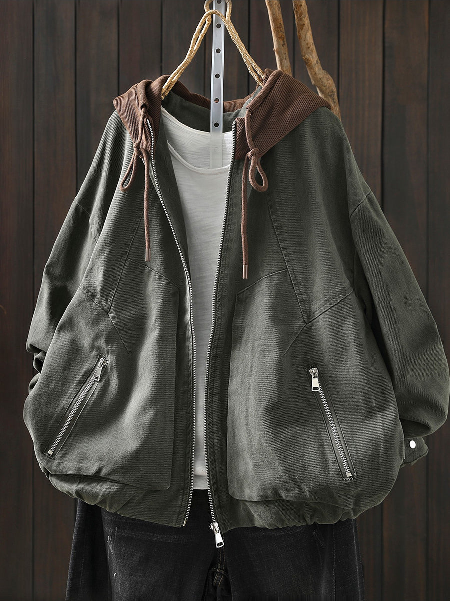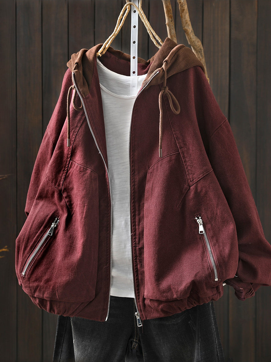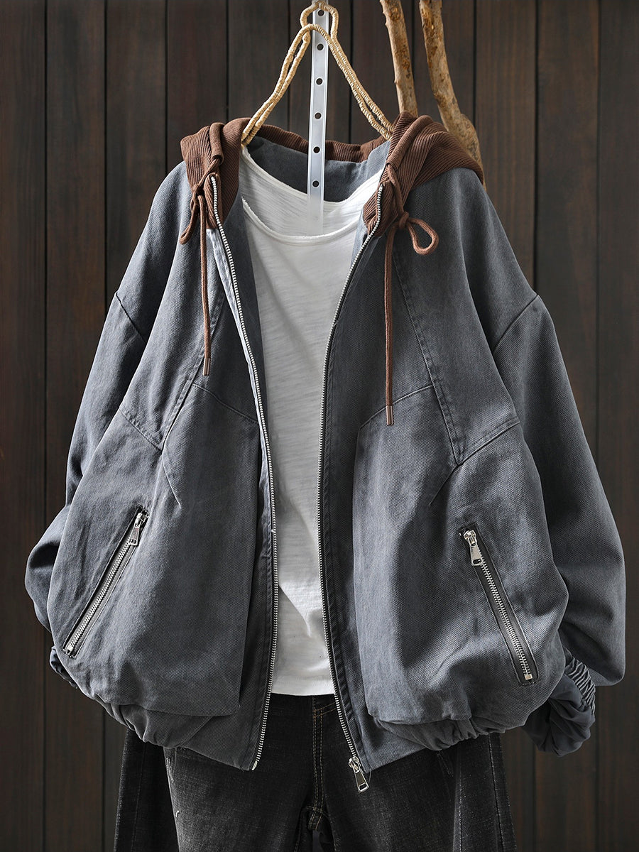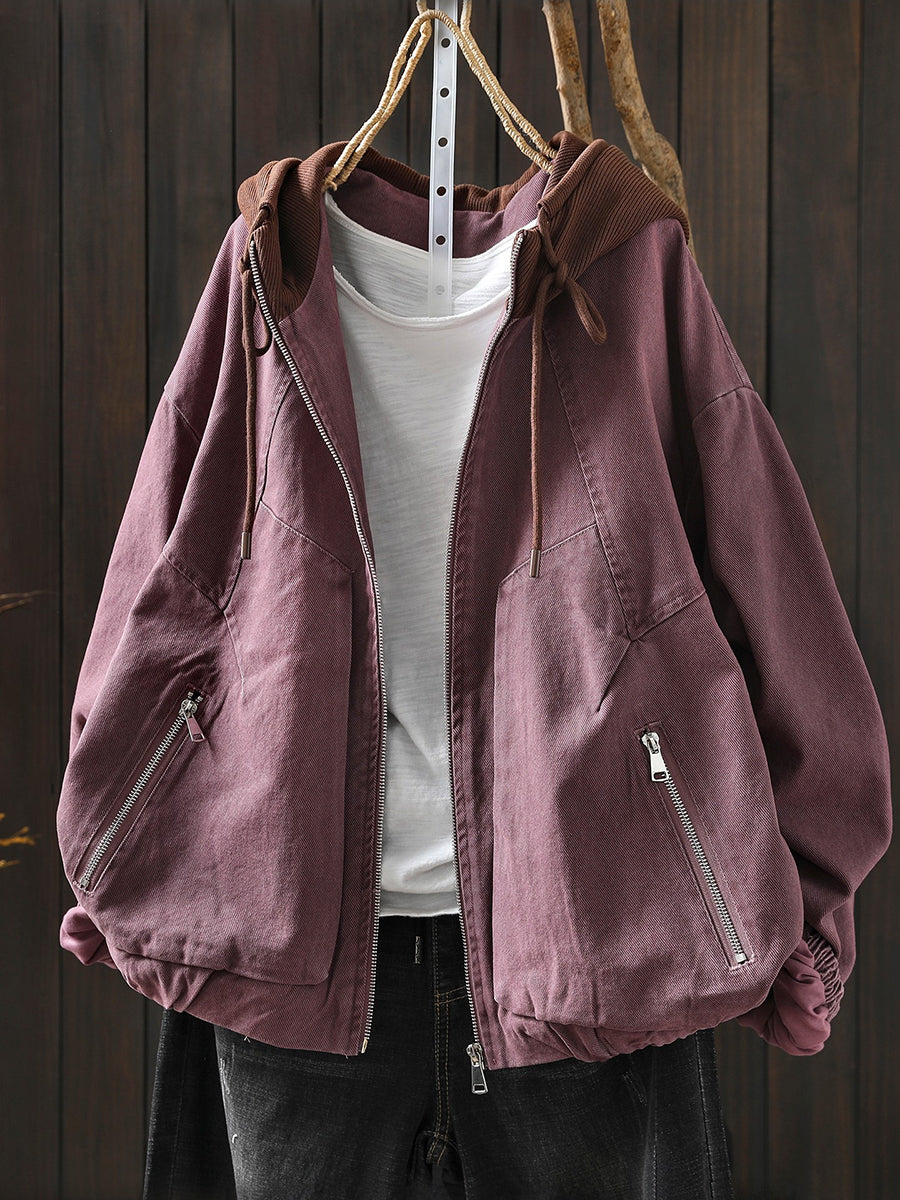Women Spring Retro Colorblock Cotton Hooded Jacket
