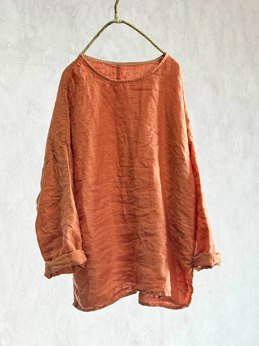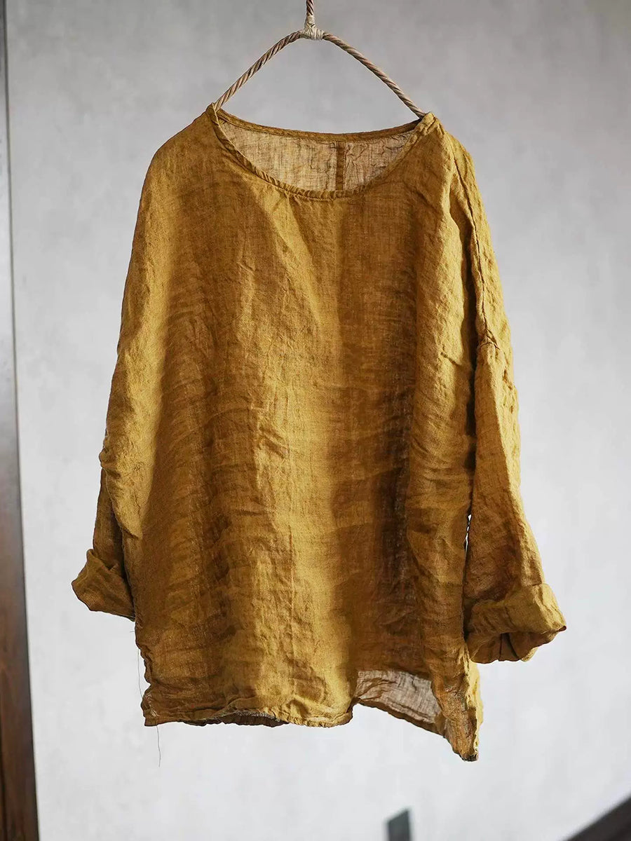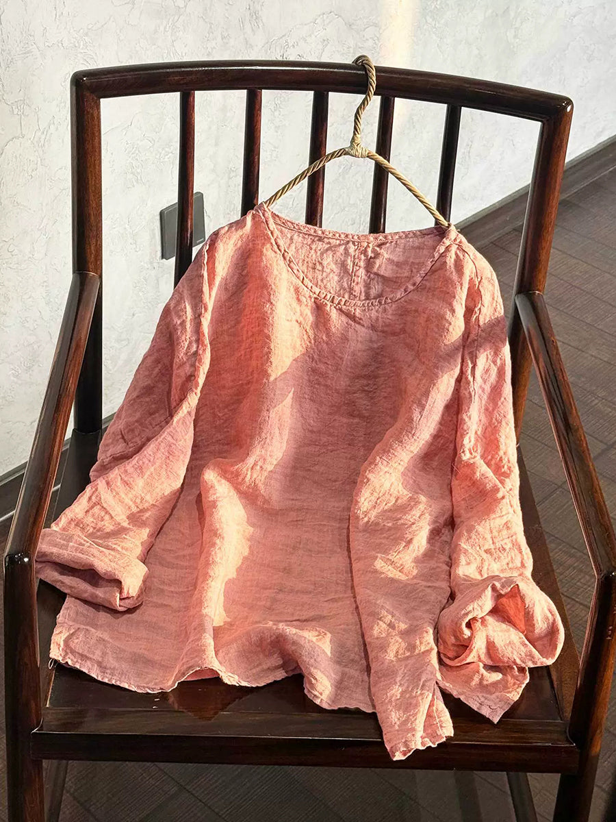 Women Spring Retro Pure Color O-Neck Linen Shirt
