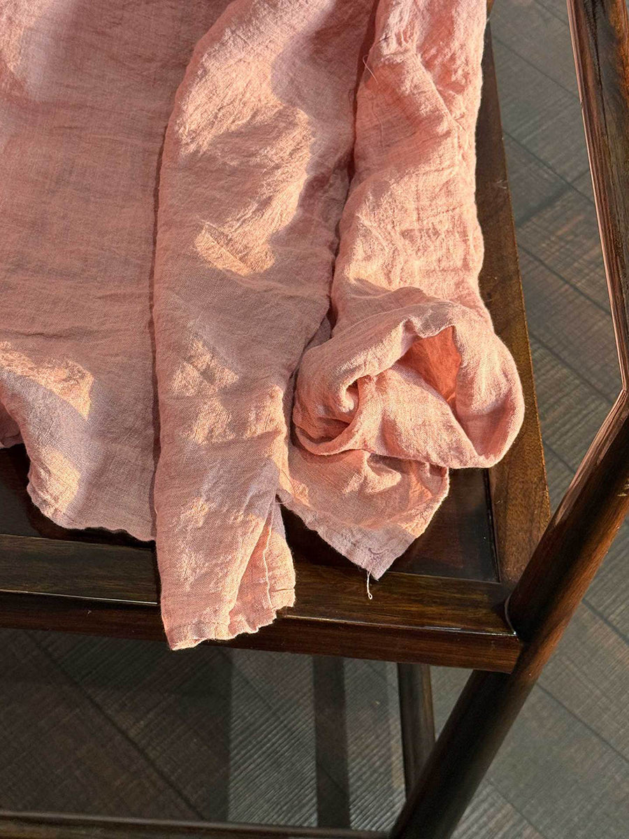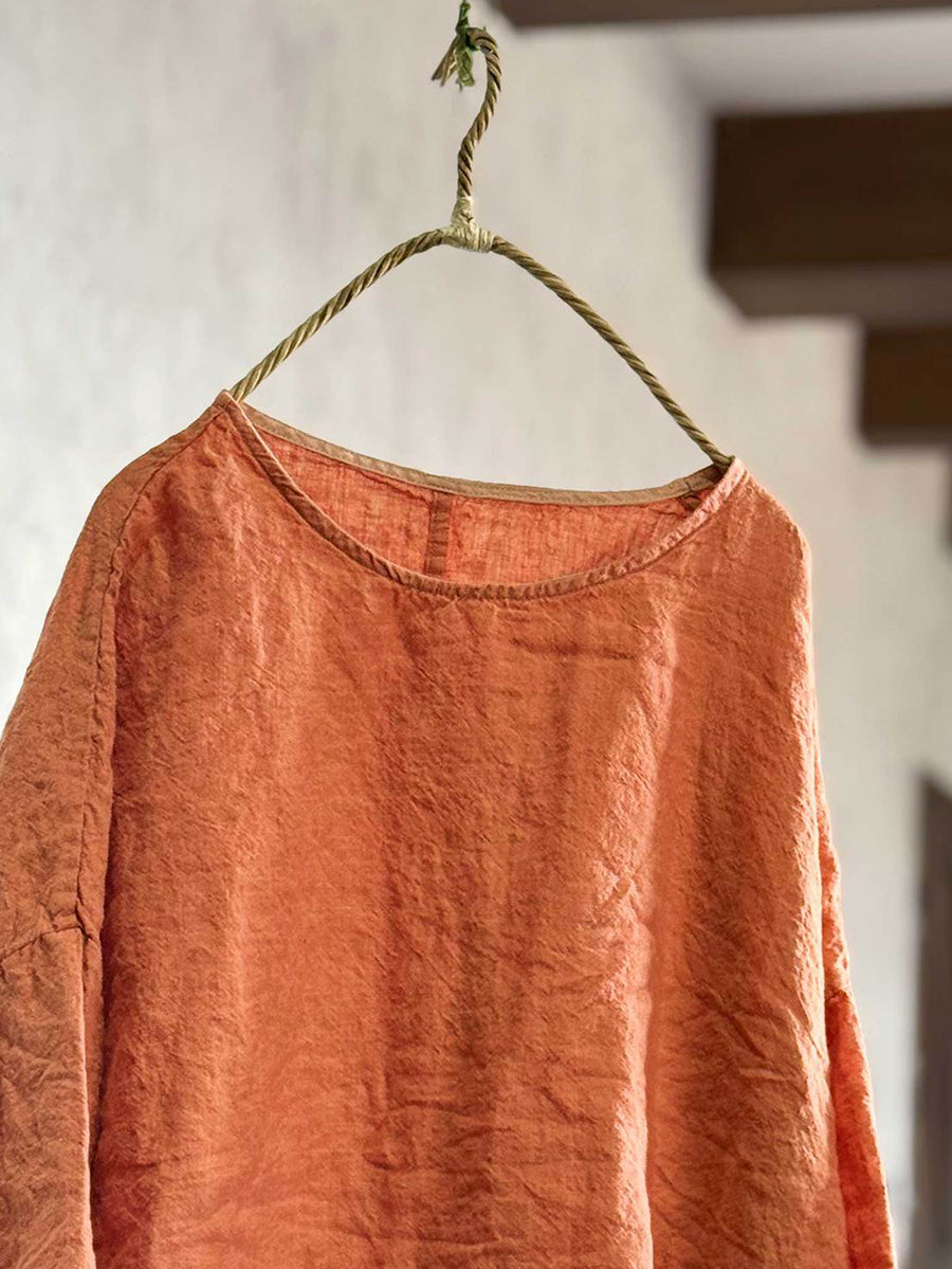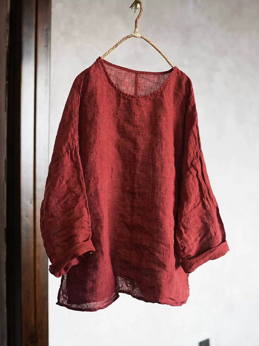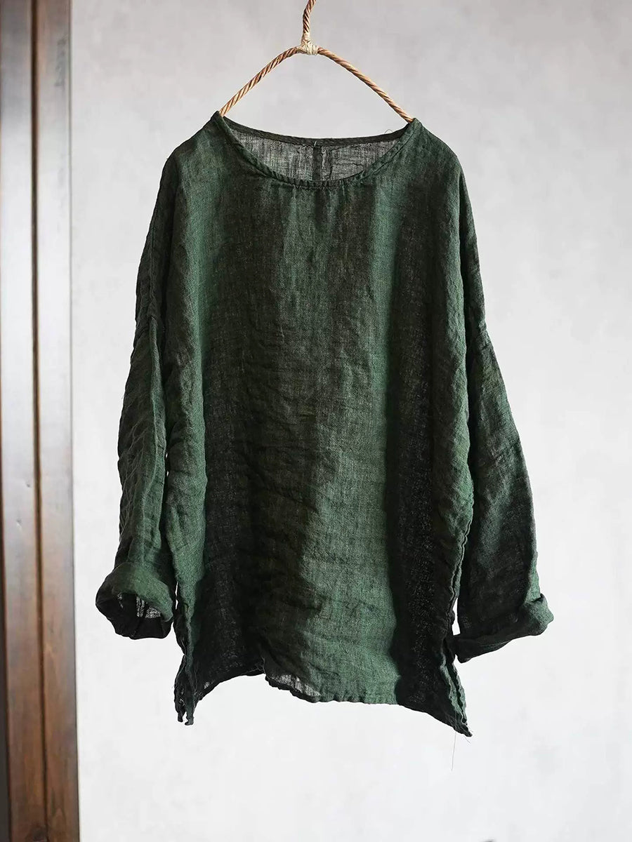 Women Spring Retro Pure Color O-Neck Linen Shirt