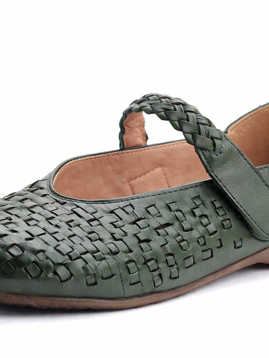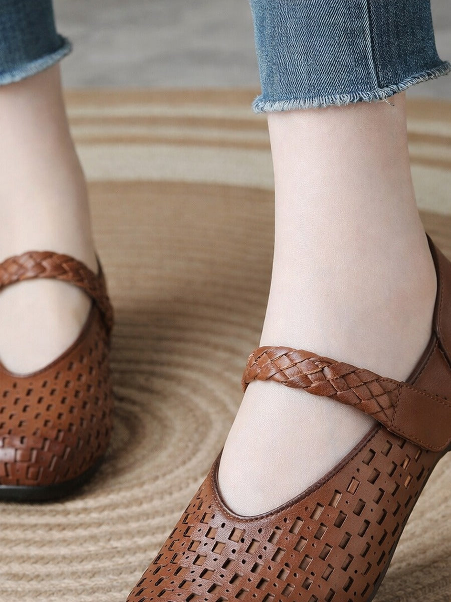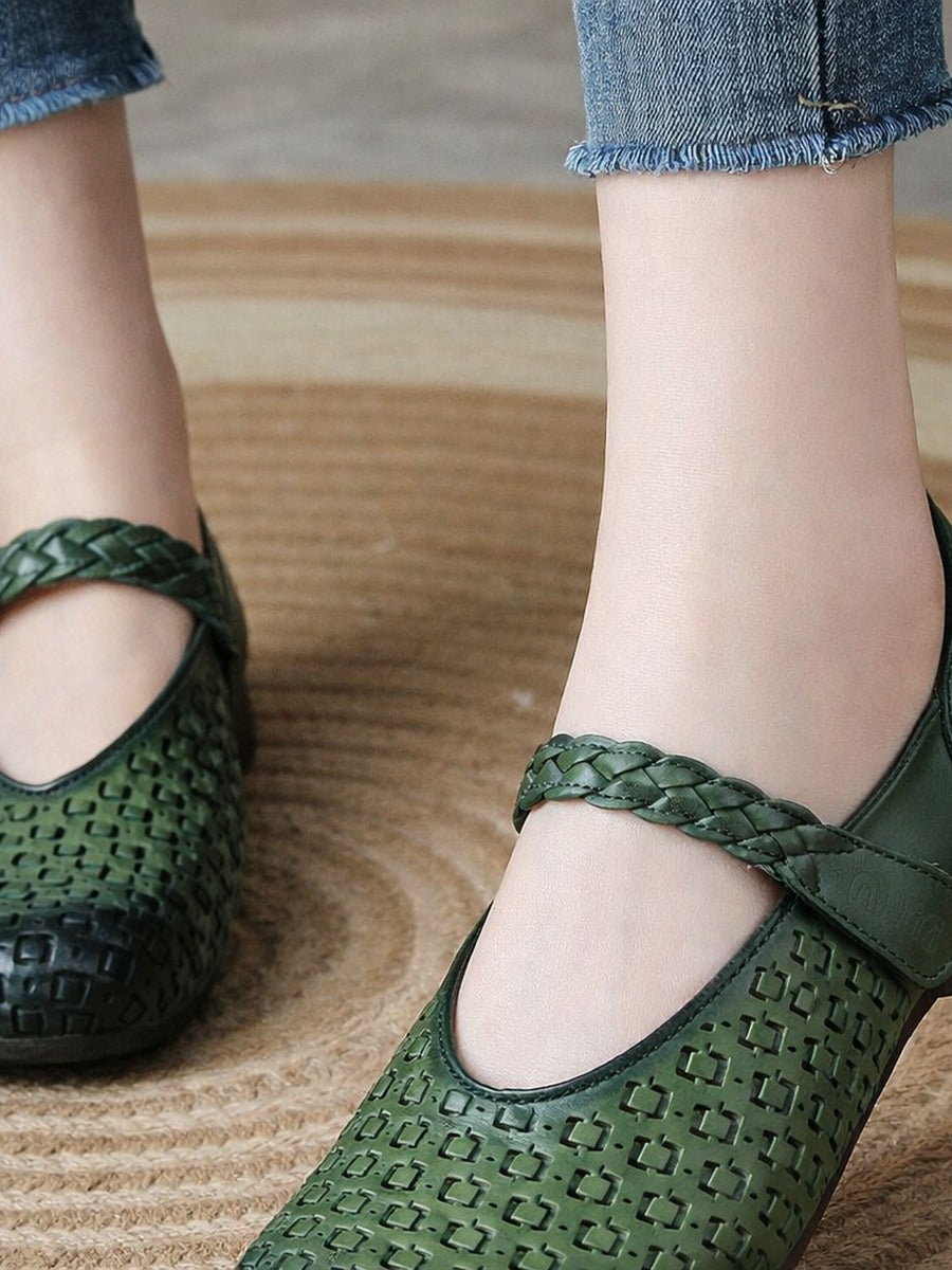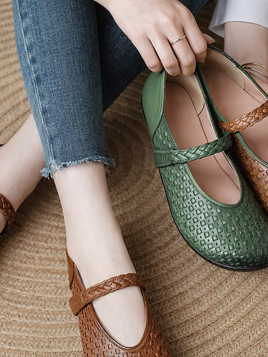 Handcrafted vintage Mary Jane flats in genuine full-grain cowhide leather. Featuring an elegant cutout design and braided strap for a unique artistic touch. Soft latex insole and flexible rubber sole for all-day comfort.