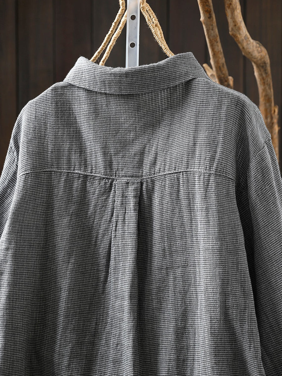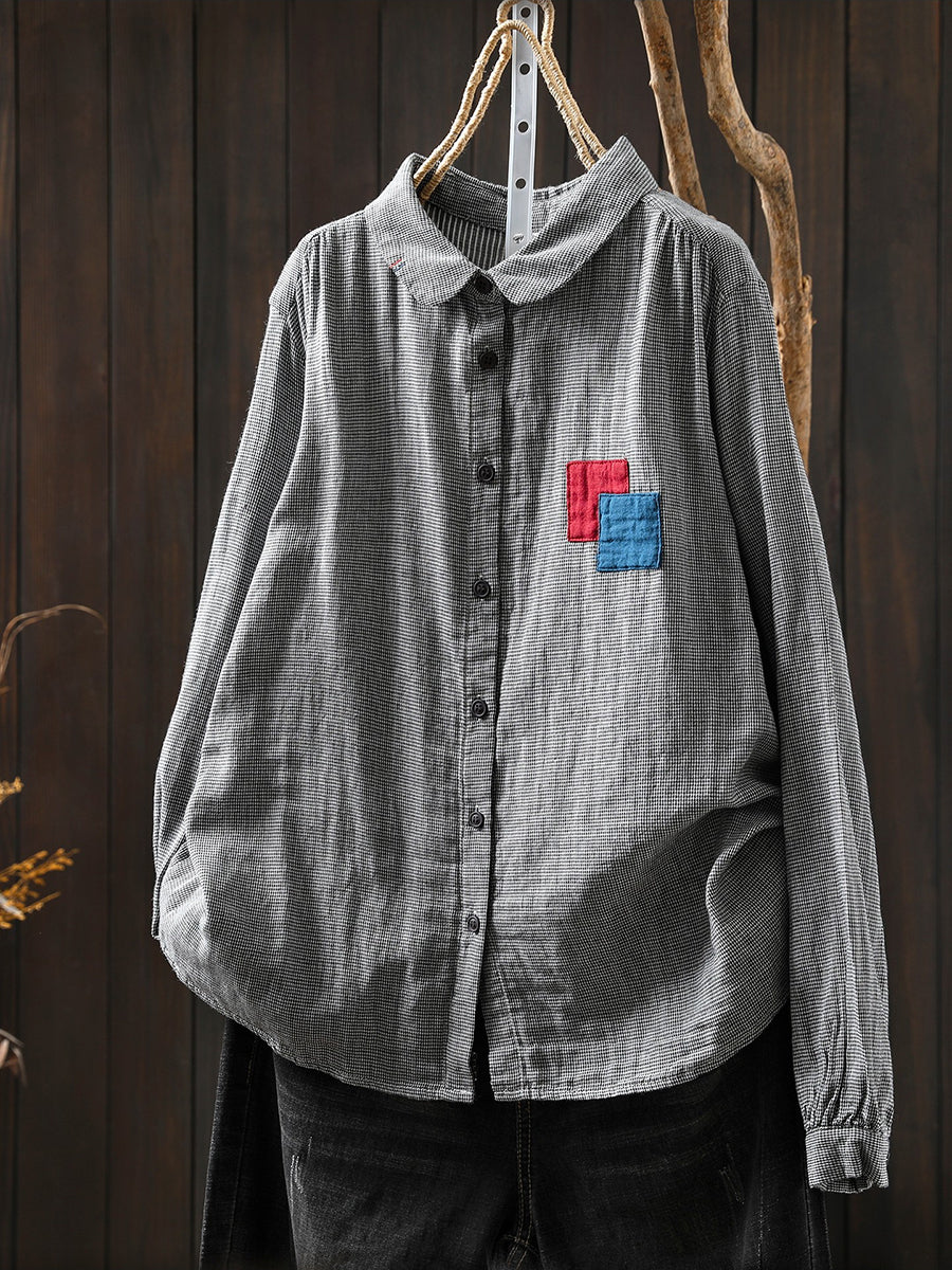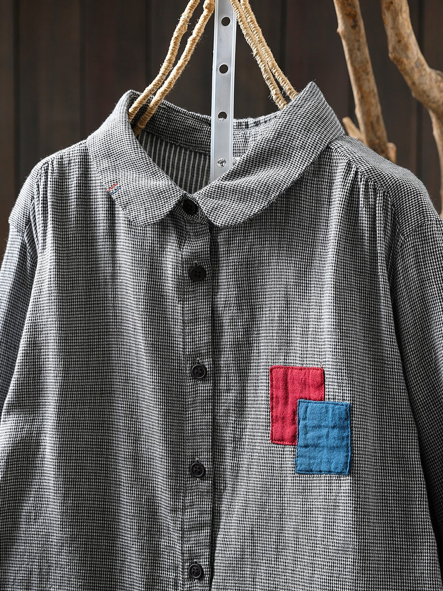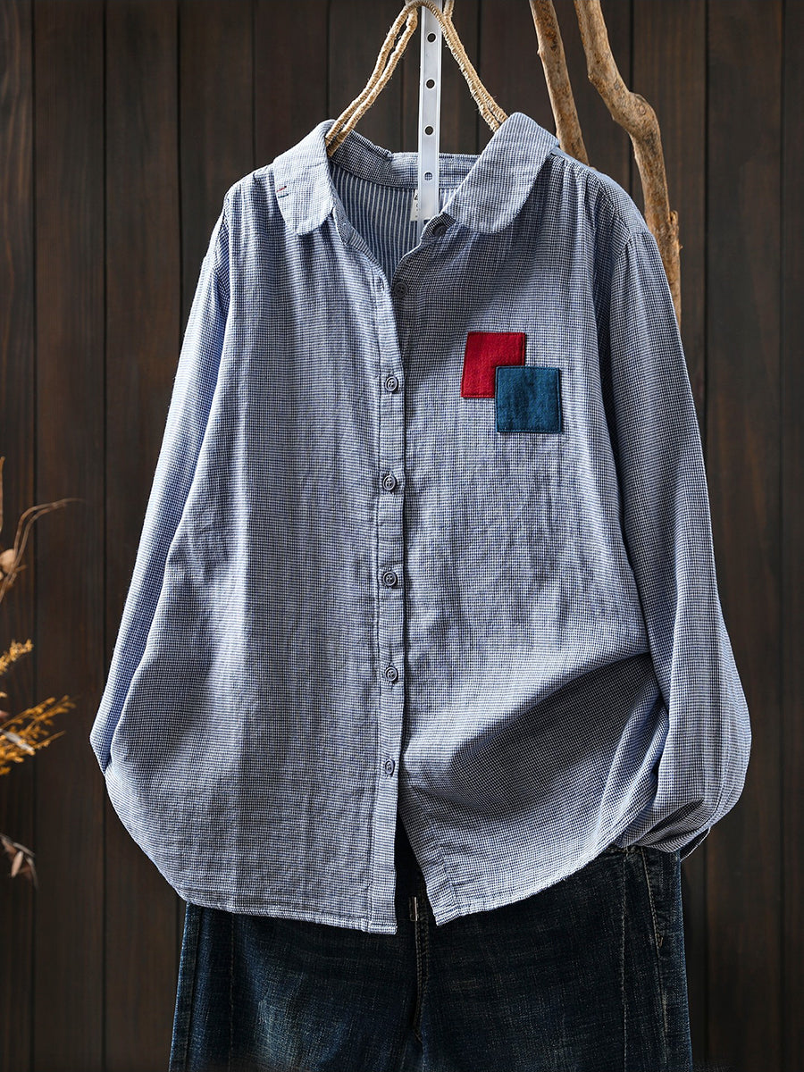 Women Spring Vintage Lattice Patchwork 100%Cotton Shirt