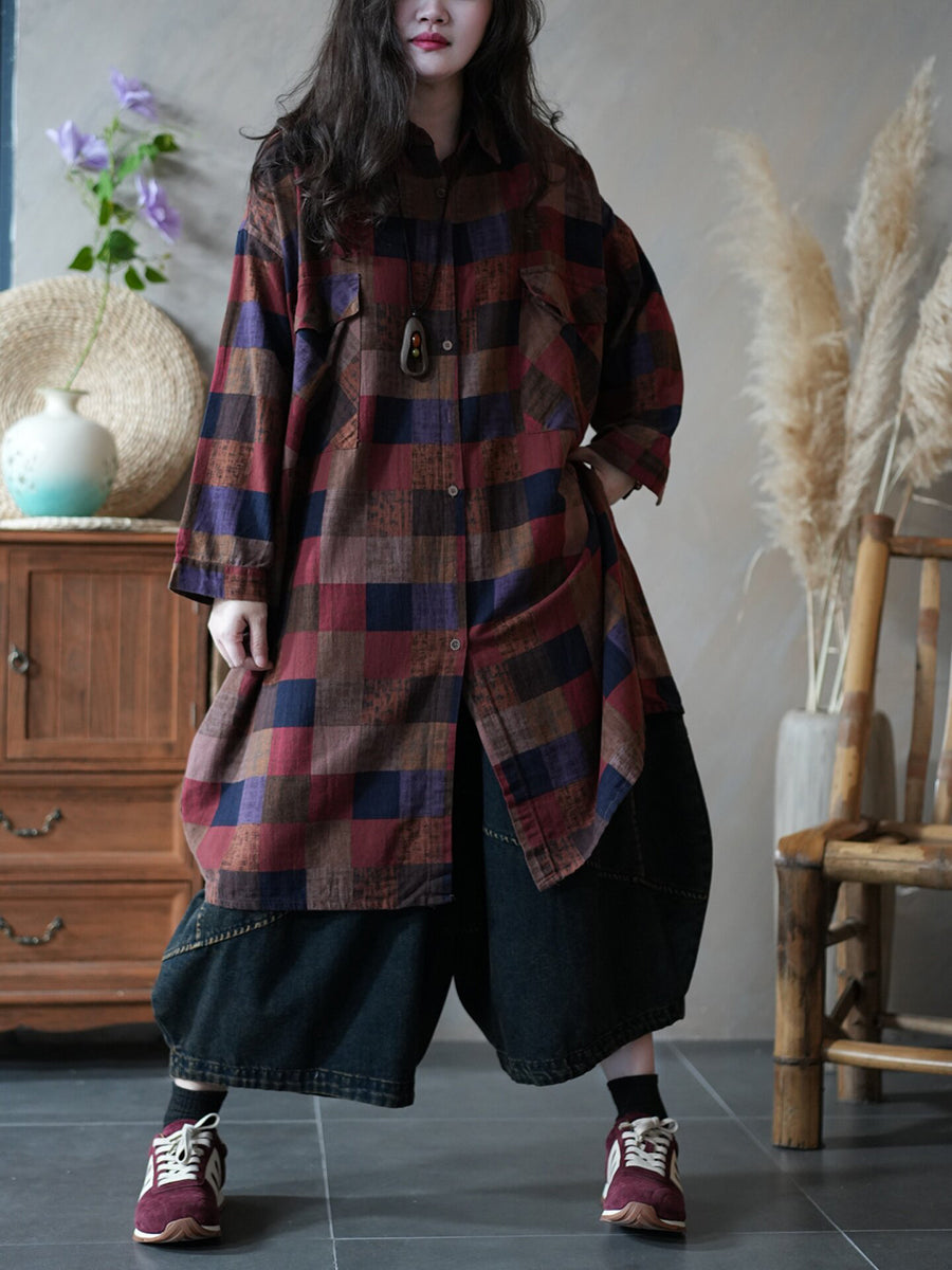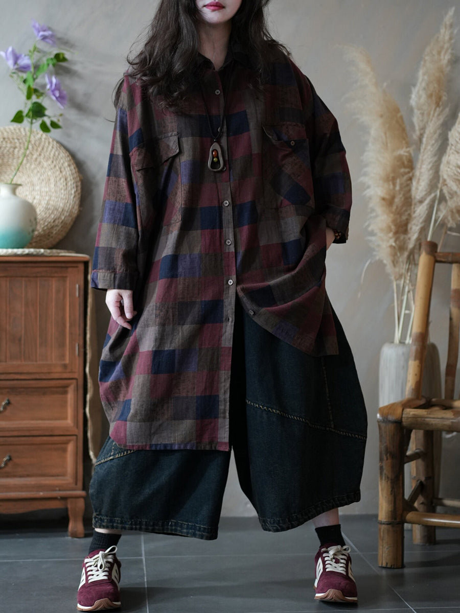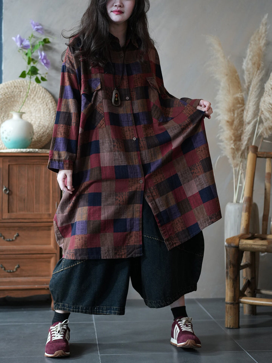 Women Spring Vintage Plaid Shirt Dress