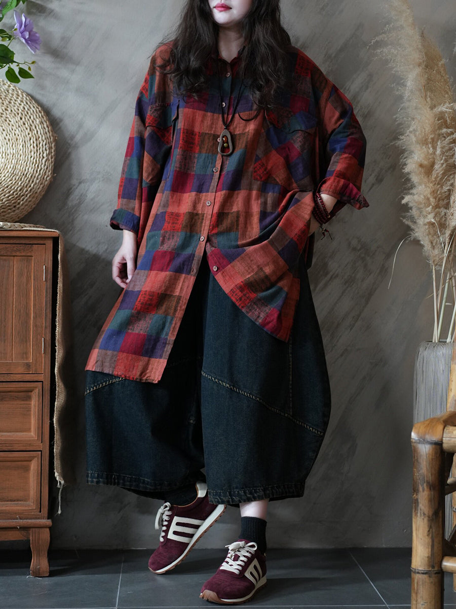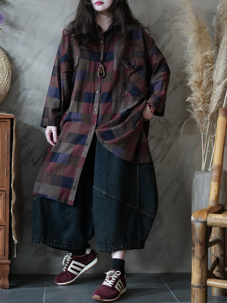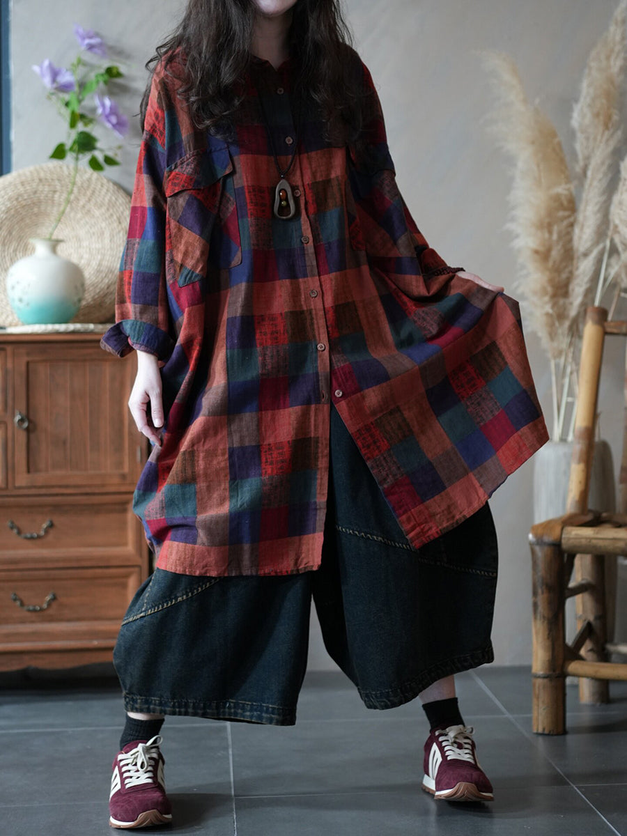 Women Spring Vintage Plaid Shirt Dress