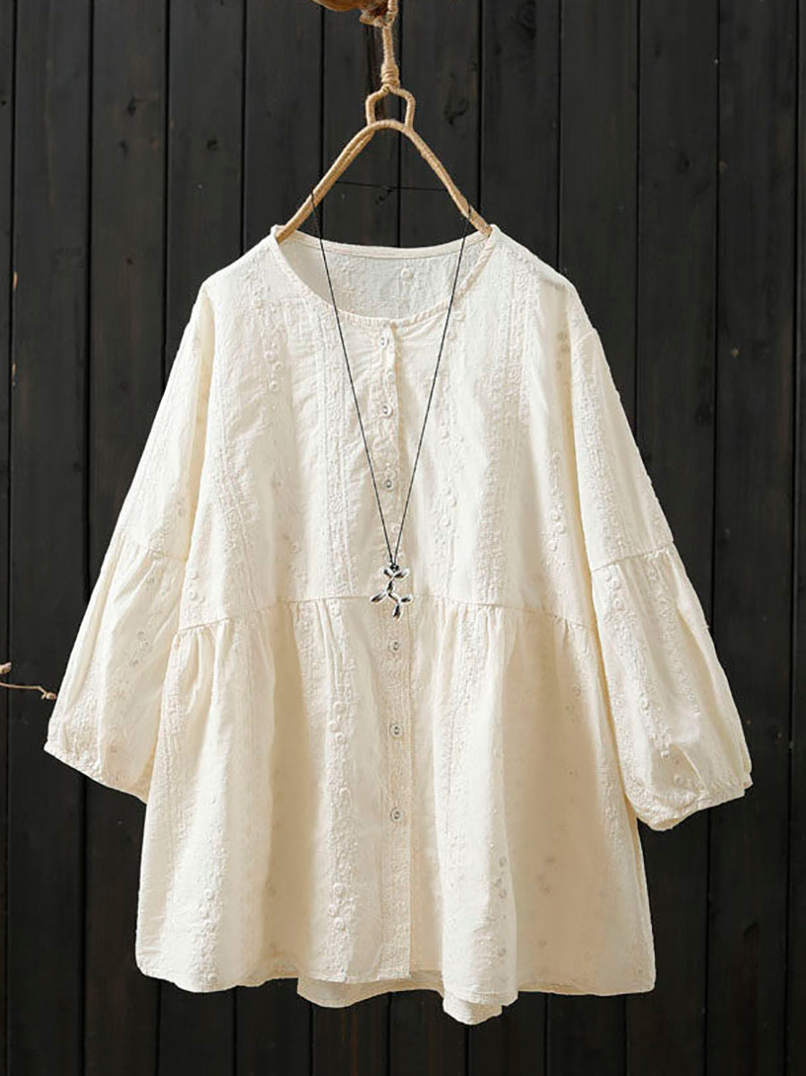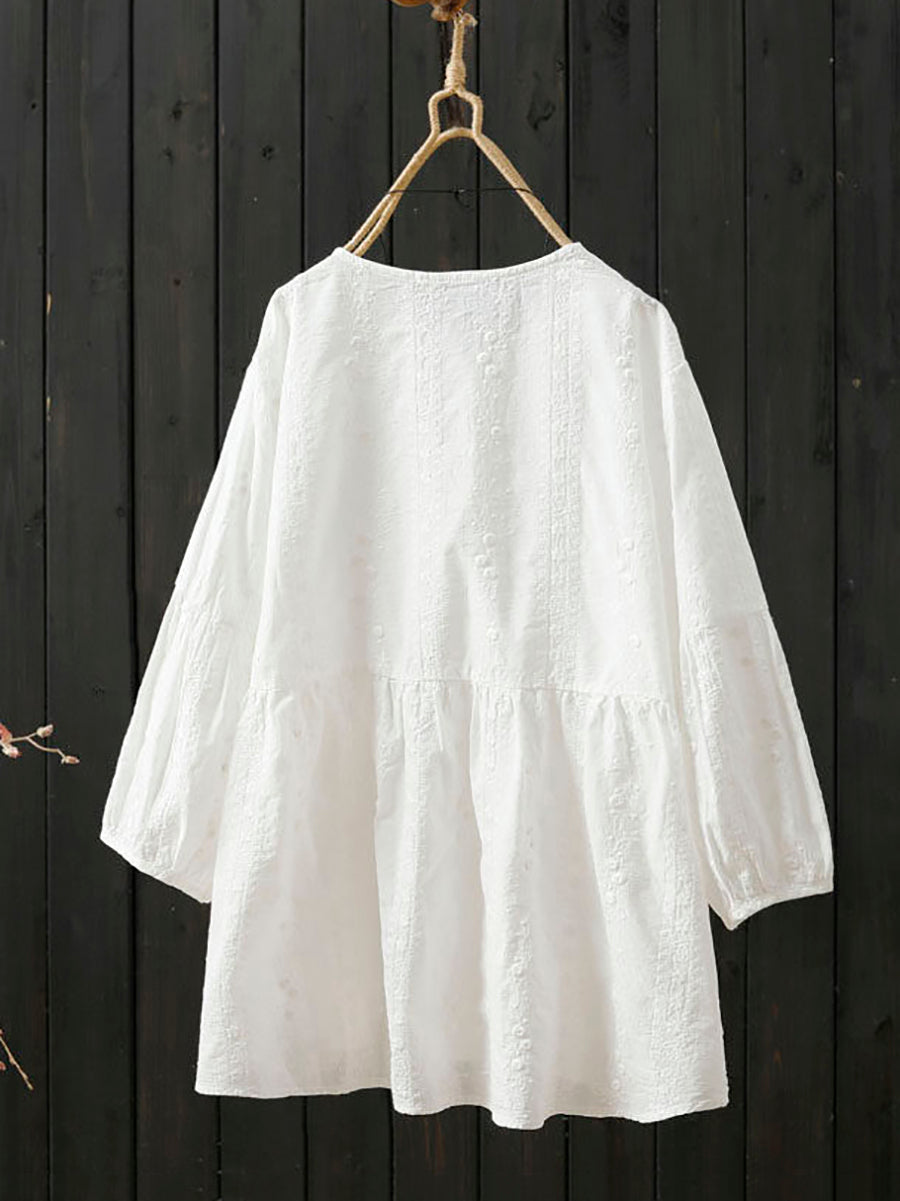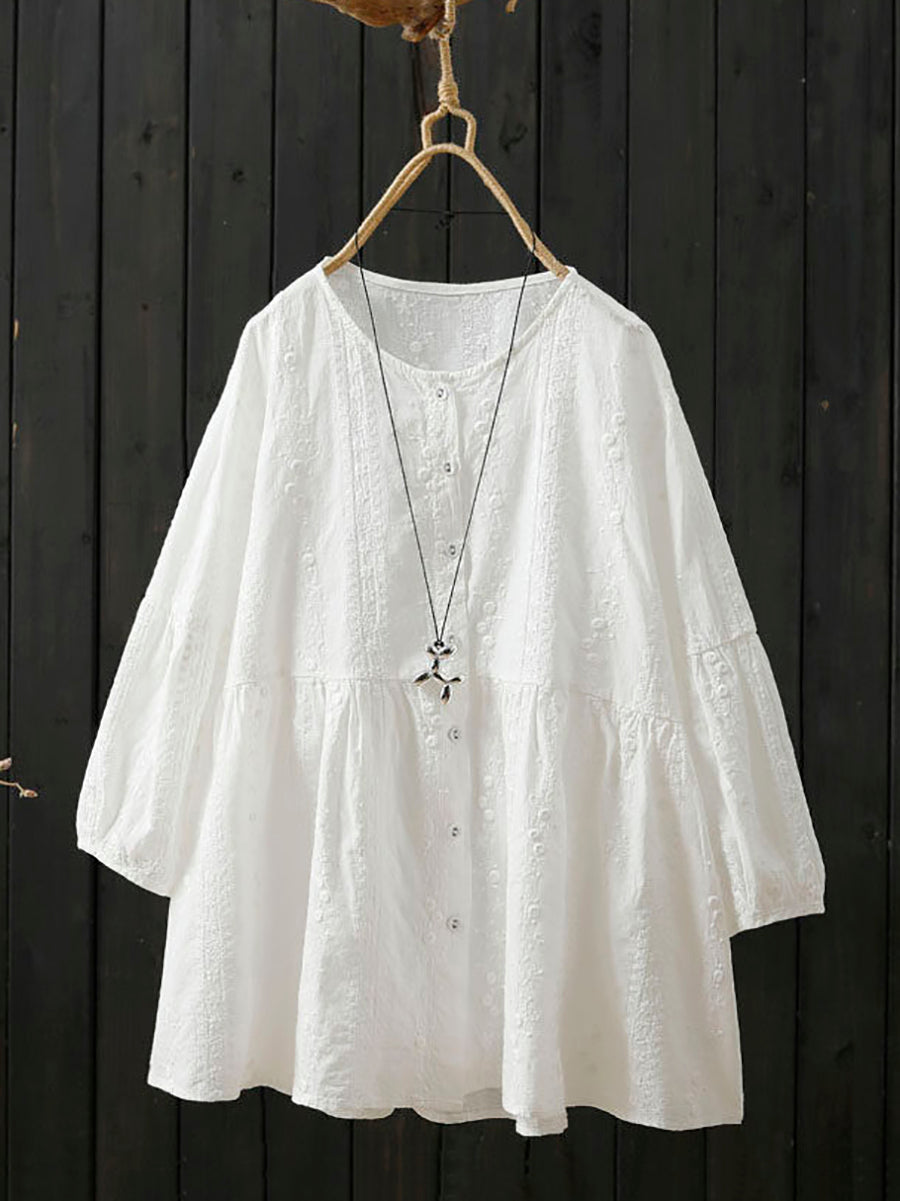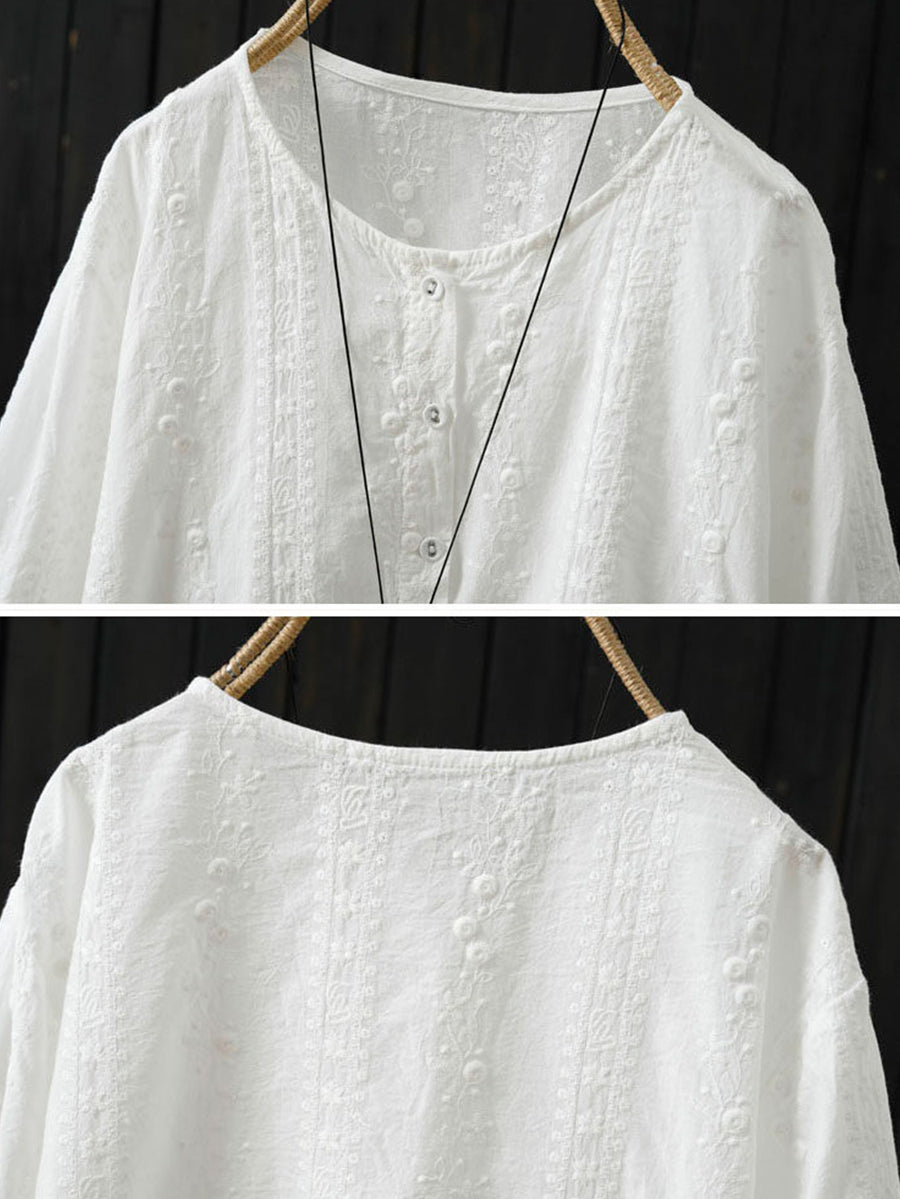 Women Summer Artsy Embroidery O-Neck 100%Cotton Blouse