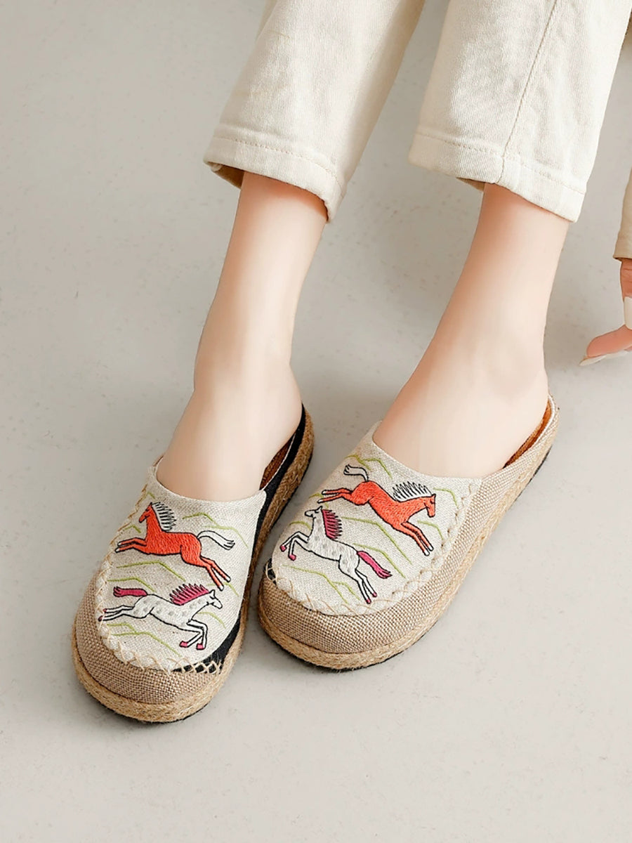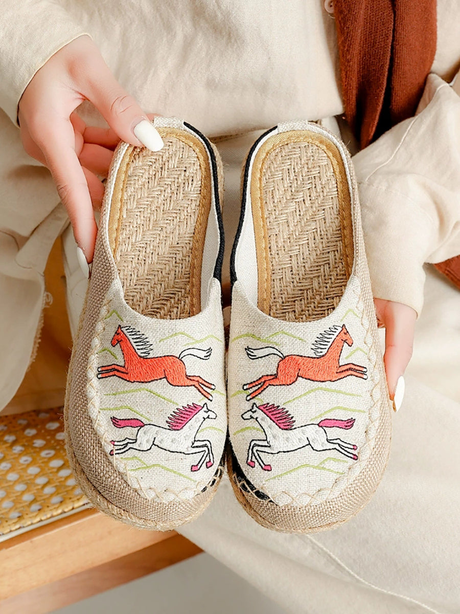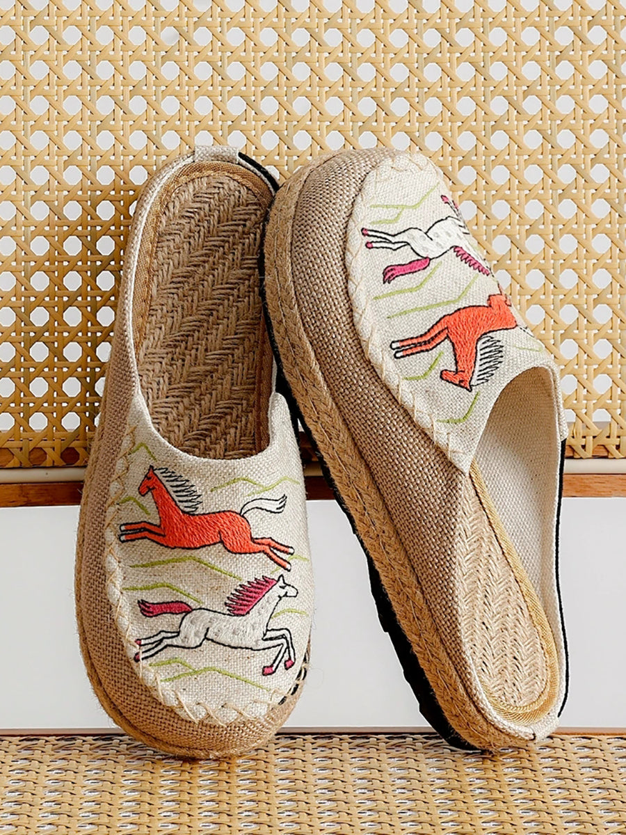 Women Summer Artsy Horse Canvas Linen Slippers