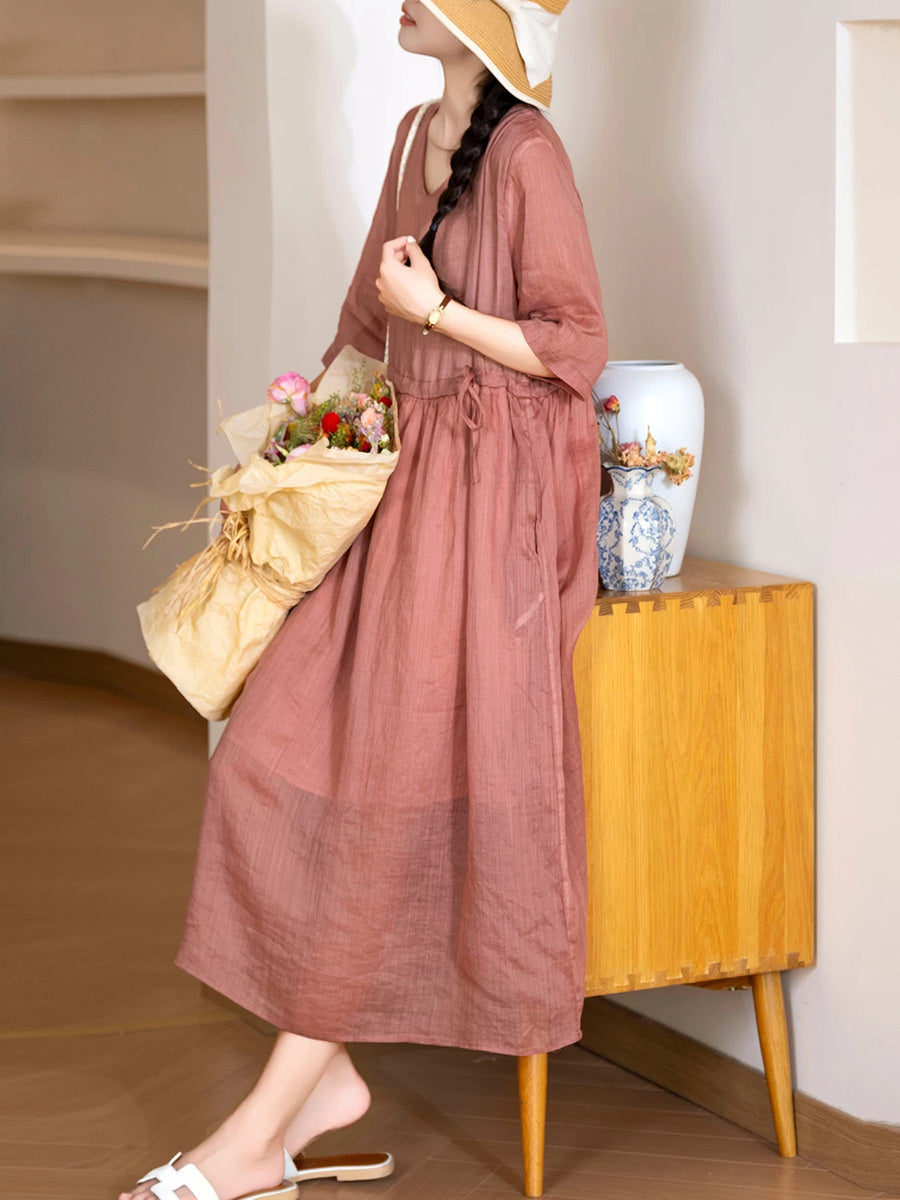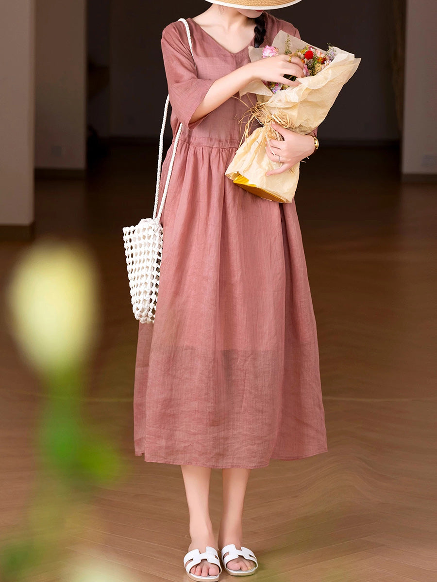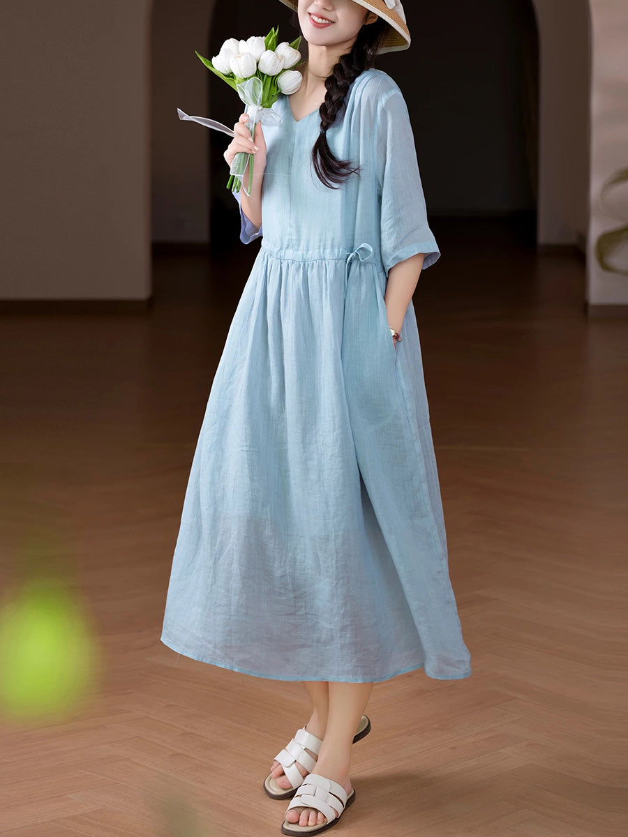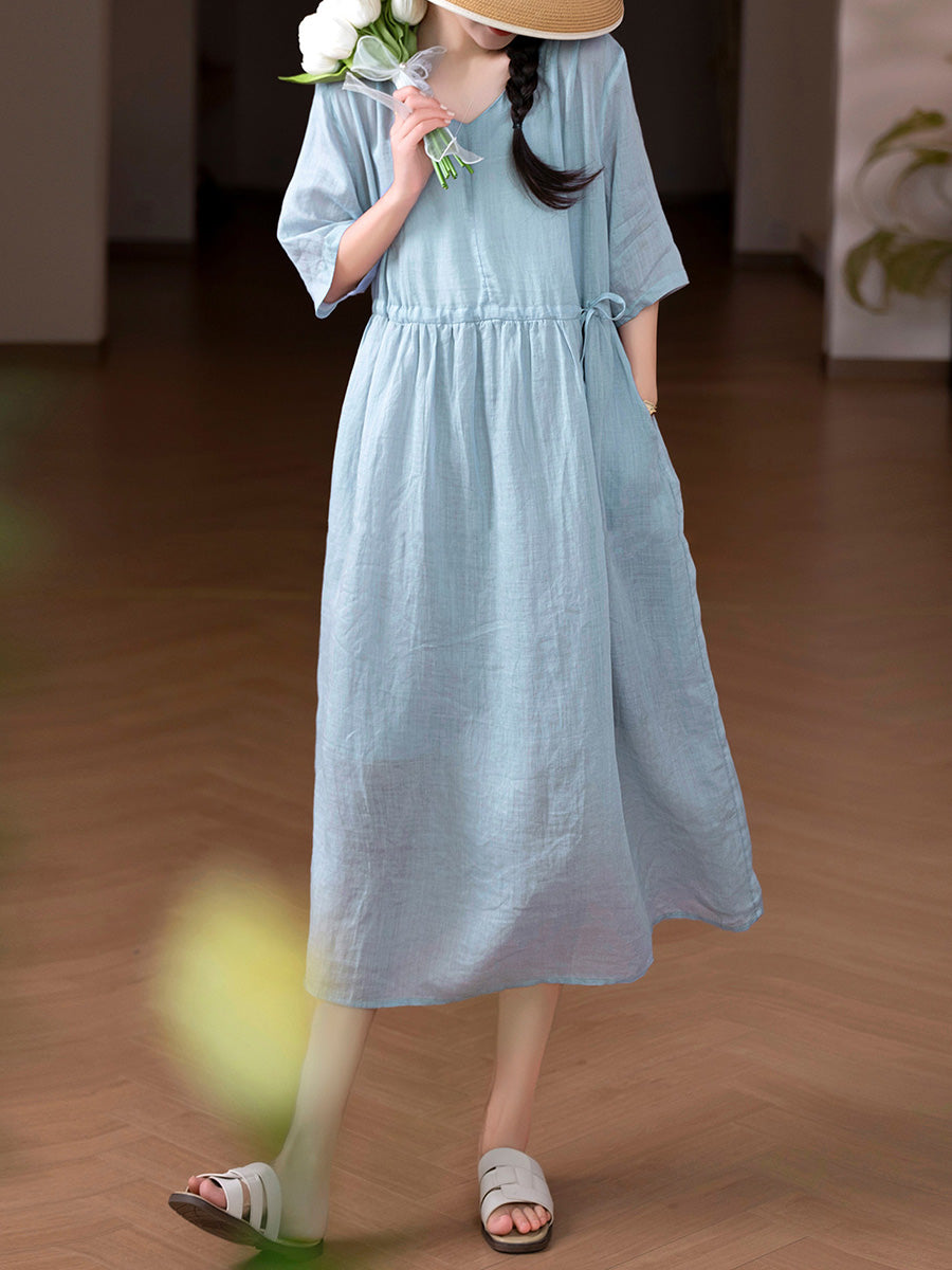 Women Summer Artsy Pure Color 100%Ramie O-Neck Dress
