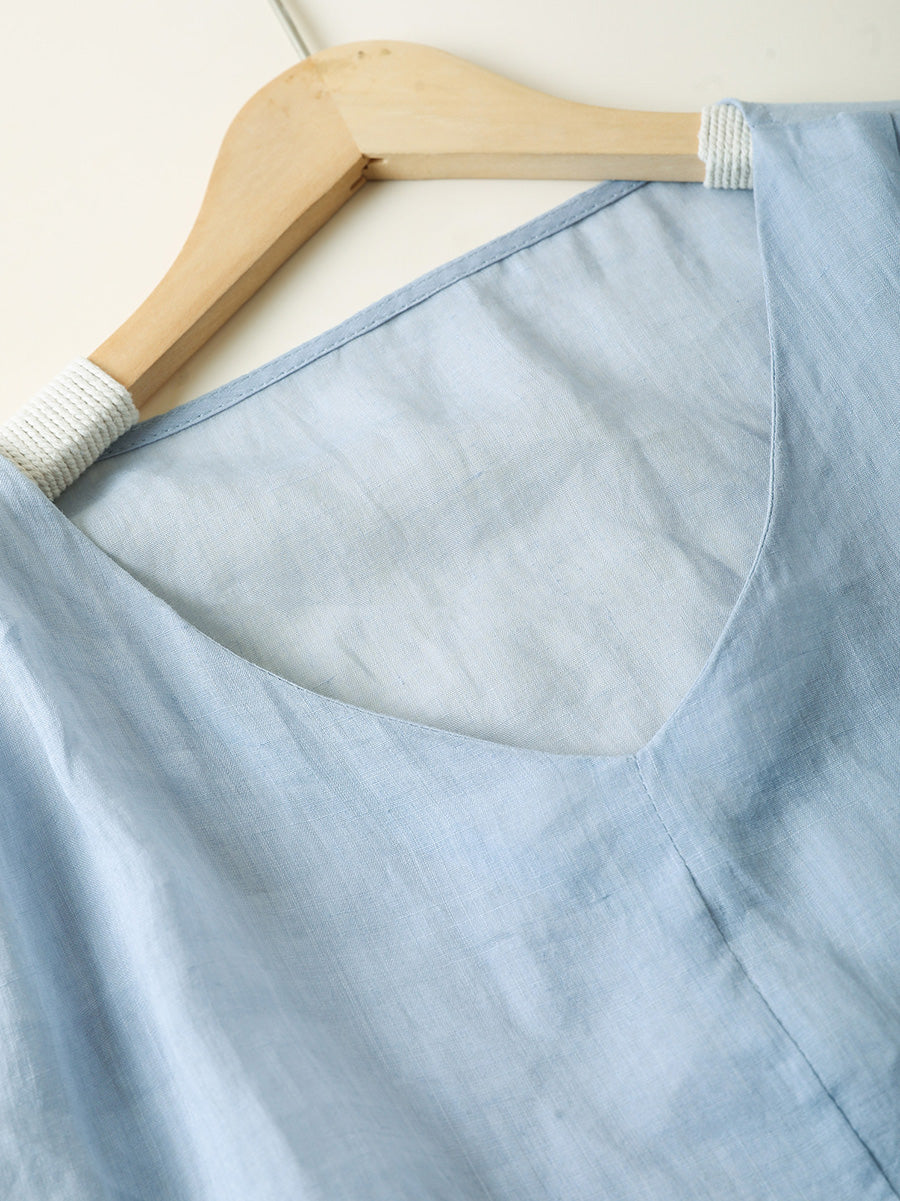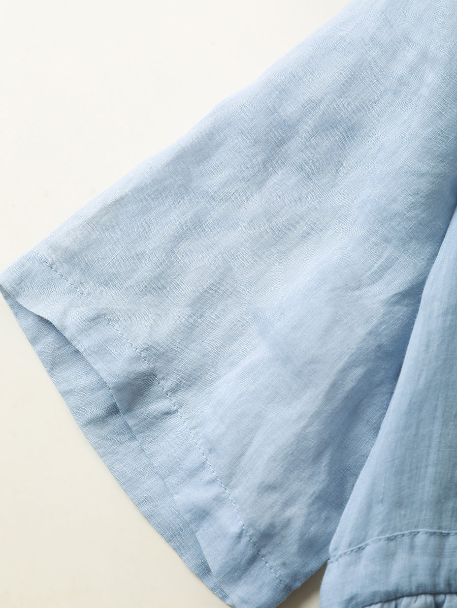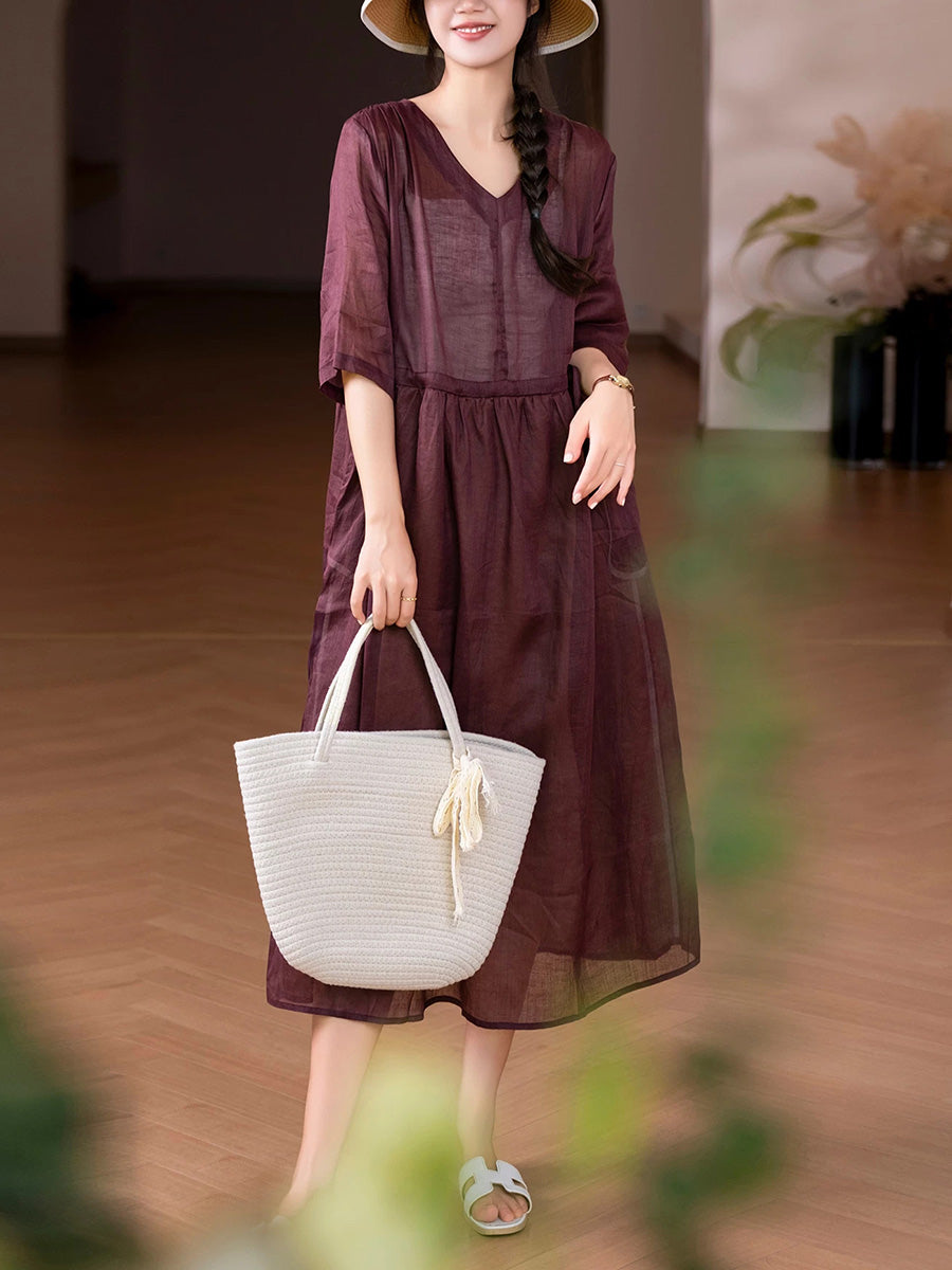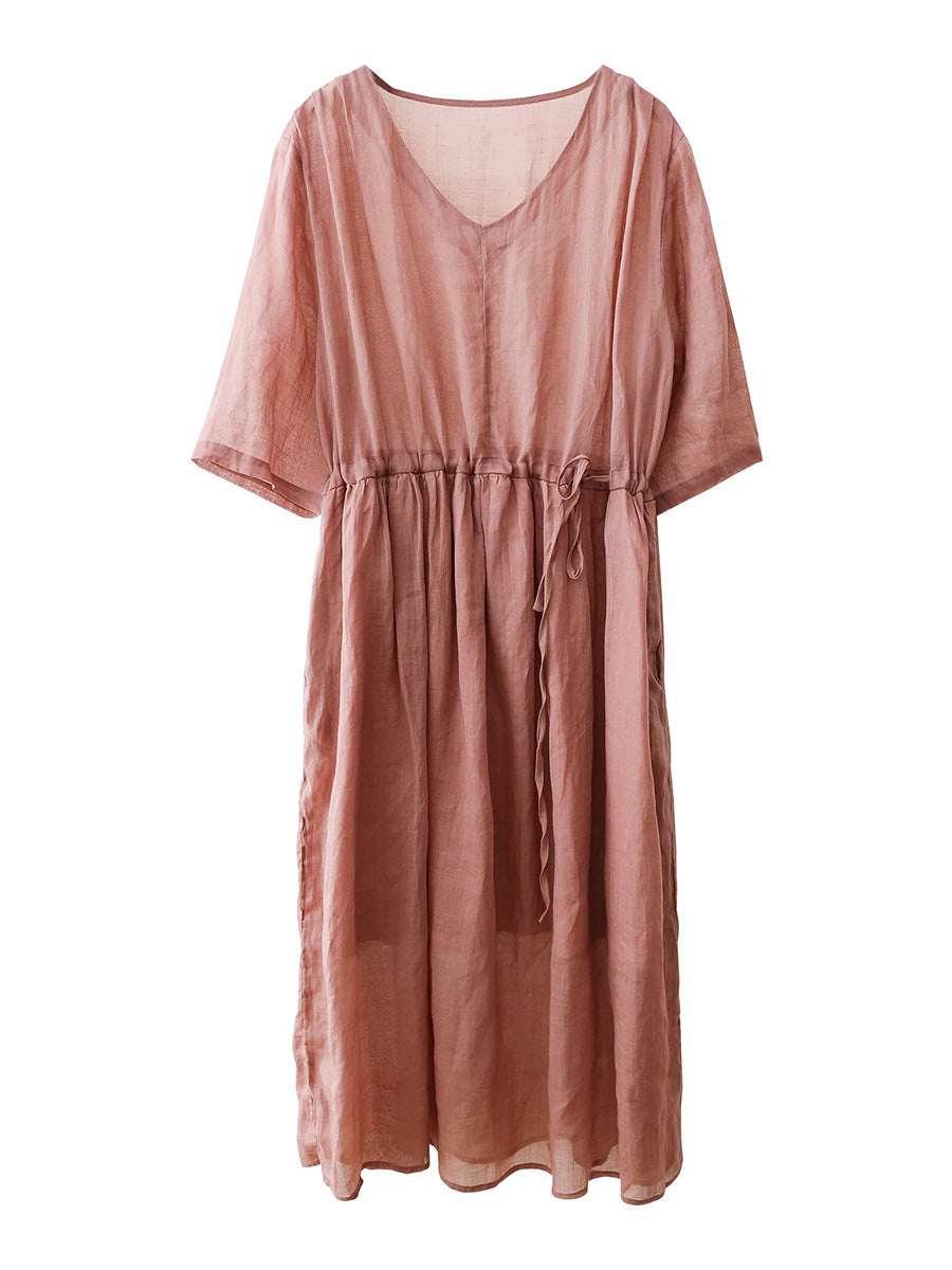 Women Summer Artsy Pure Color 100%Ramie O-Neck Dress