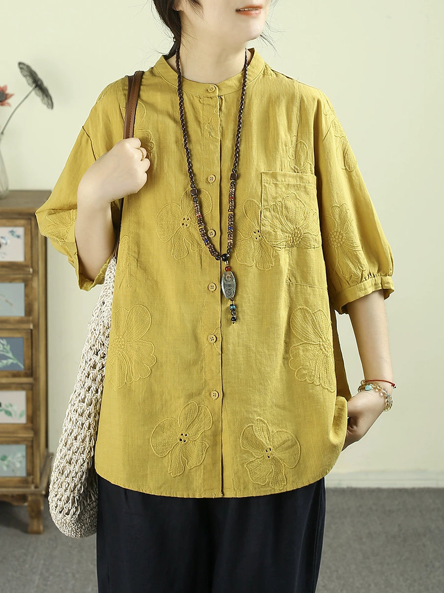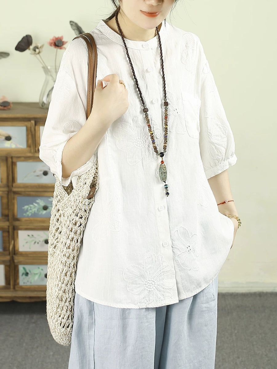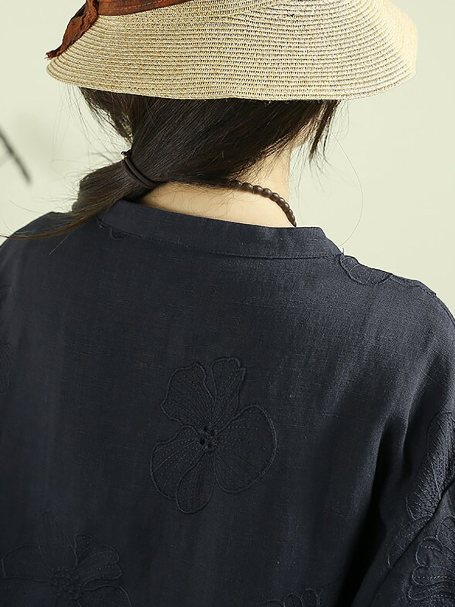 Women Summer Artsy Flower Embroidery 100%Linen Shirt