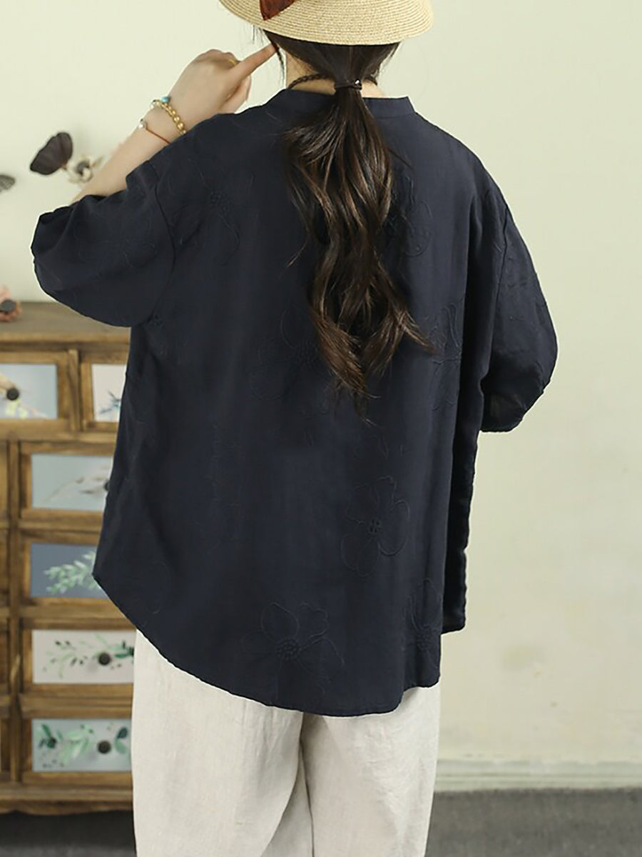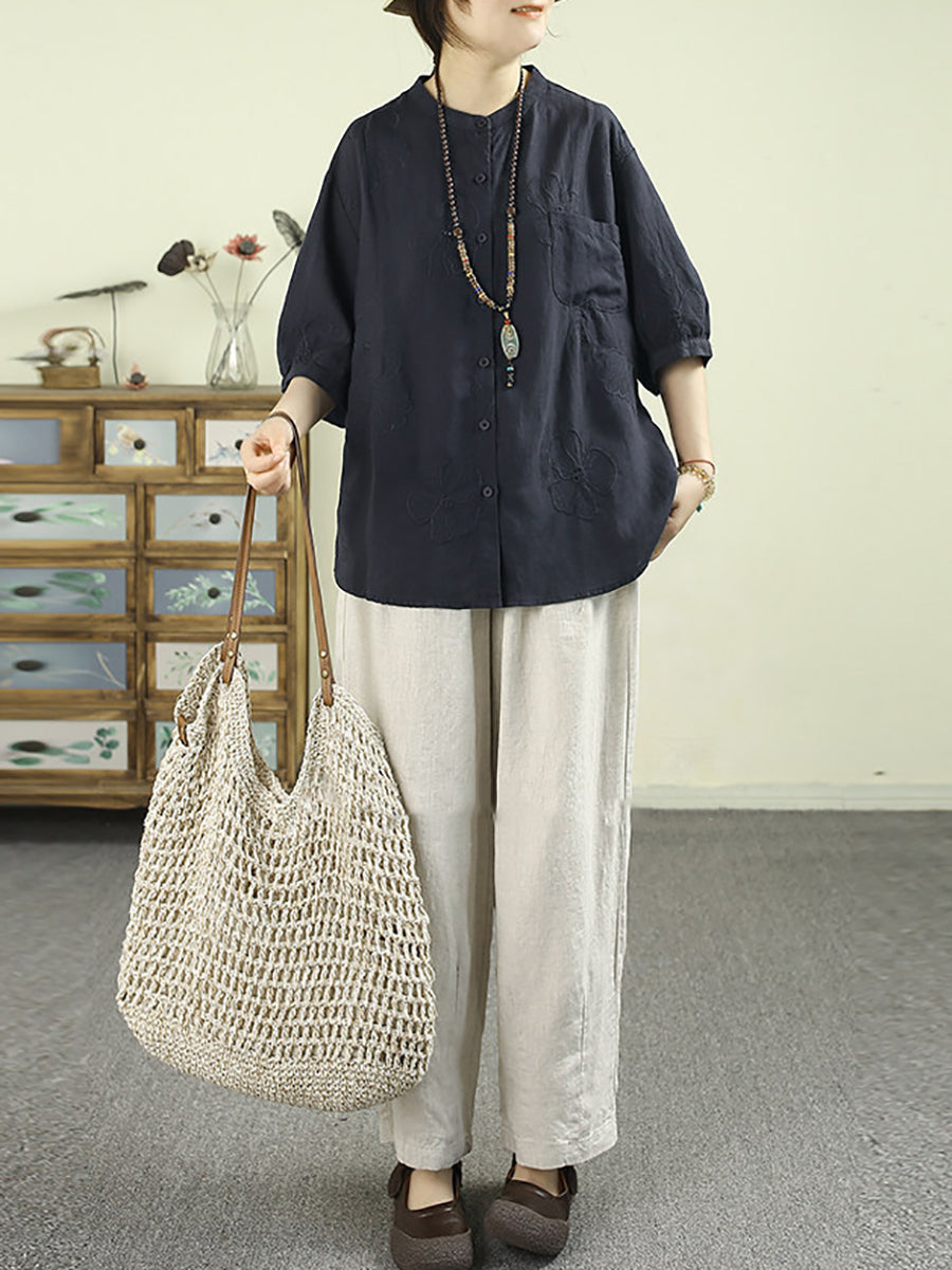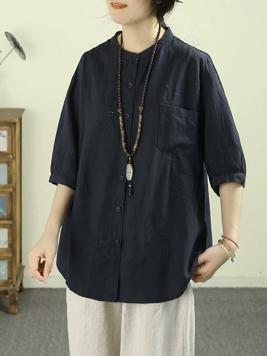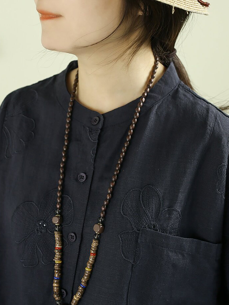 Women Summer Artsy Flower Embroidery 100%Linen Shirt