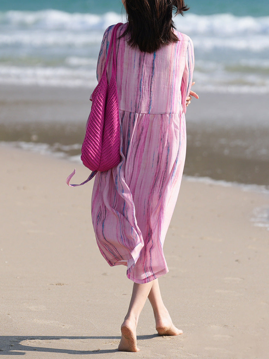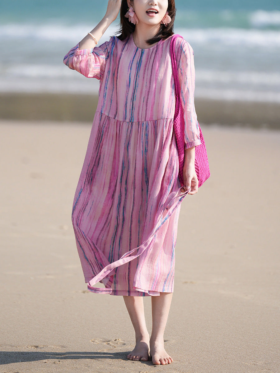 Women Summer Artsy Stripe 100%Ramie O-Neck Dress