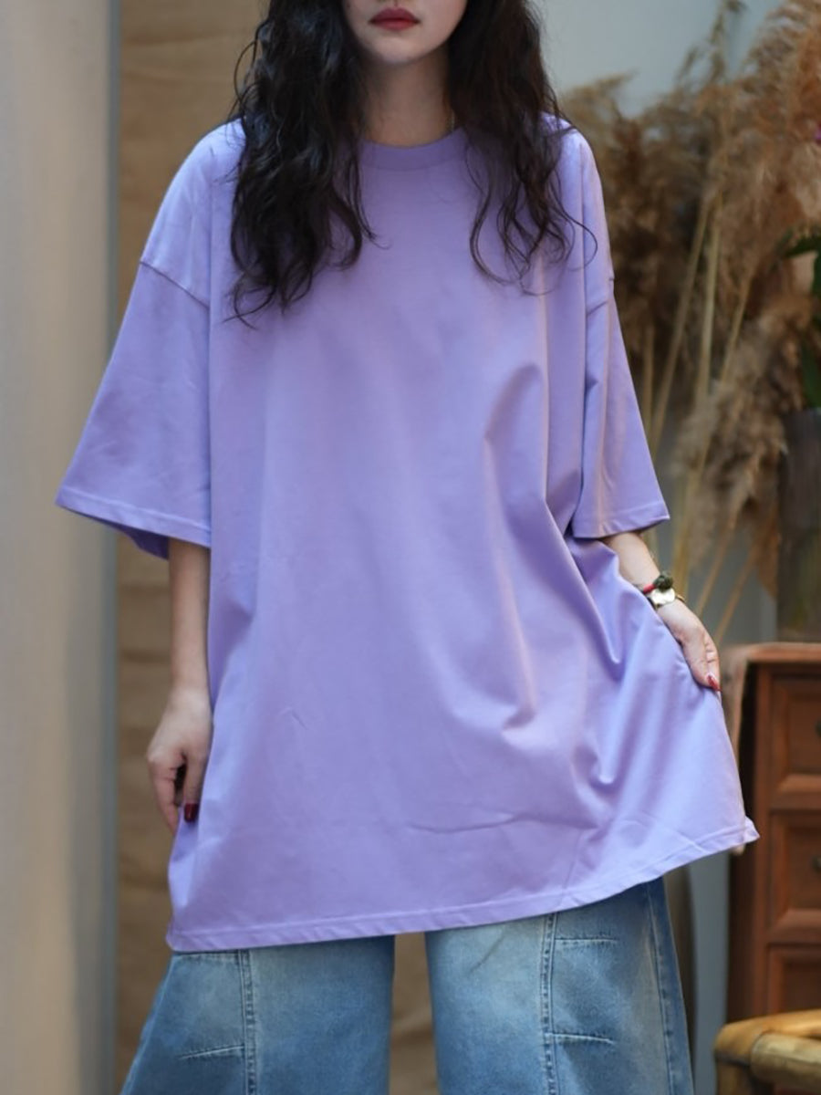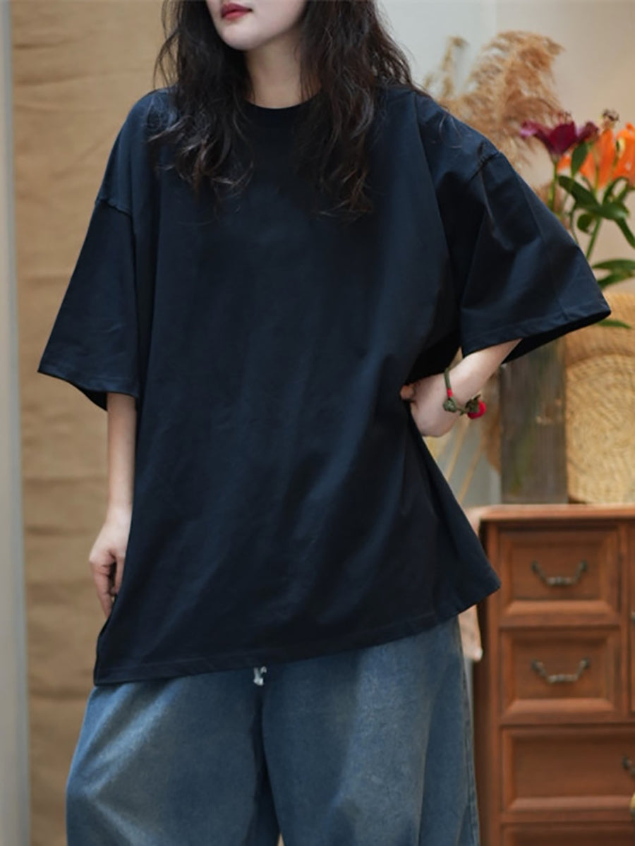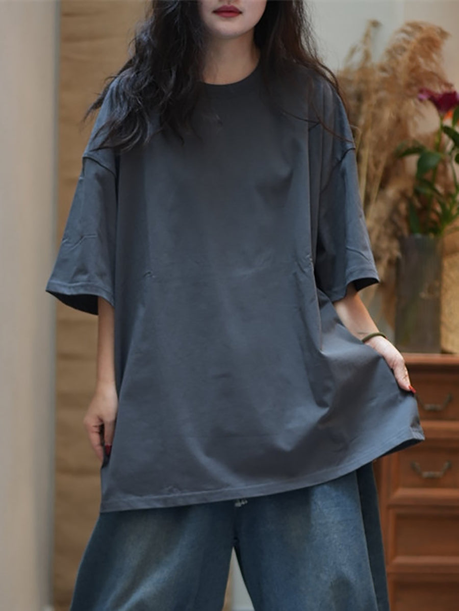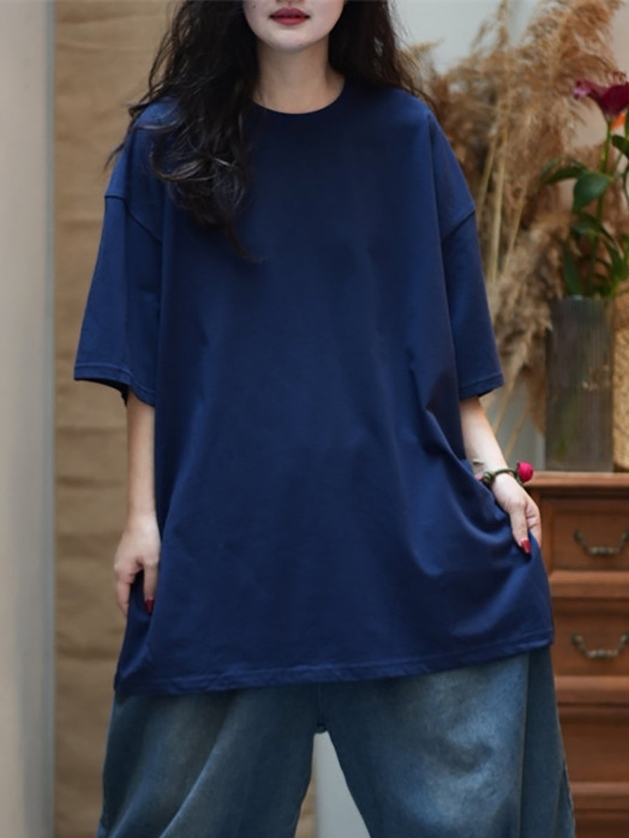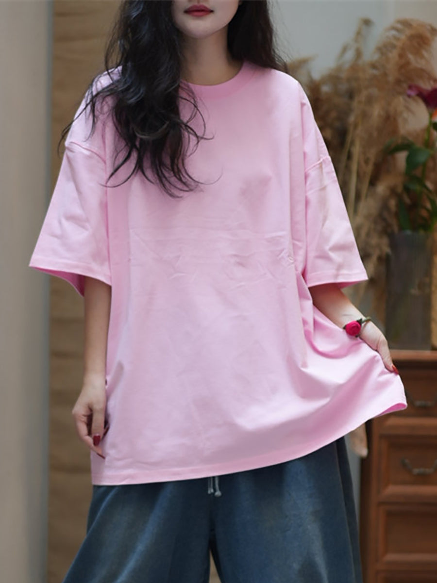 Women Summer Casual Pure Color Cotton O-Neck Shirt