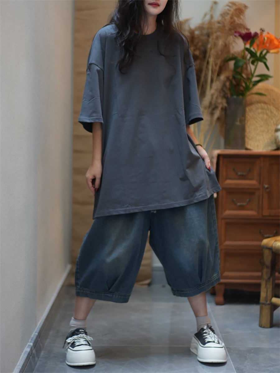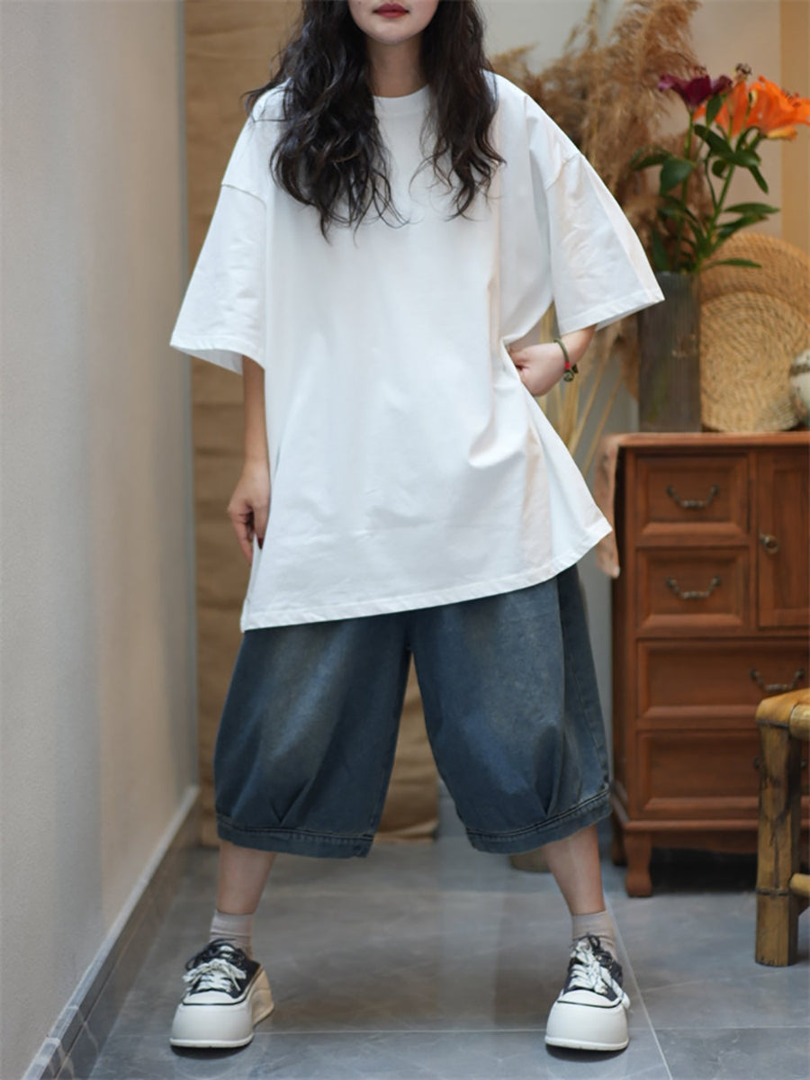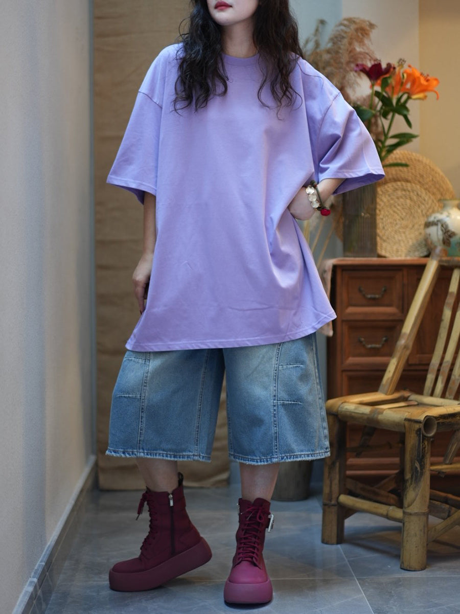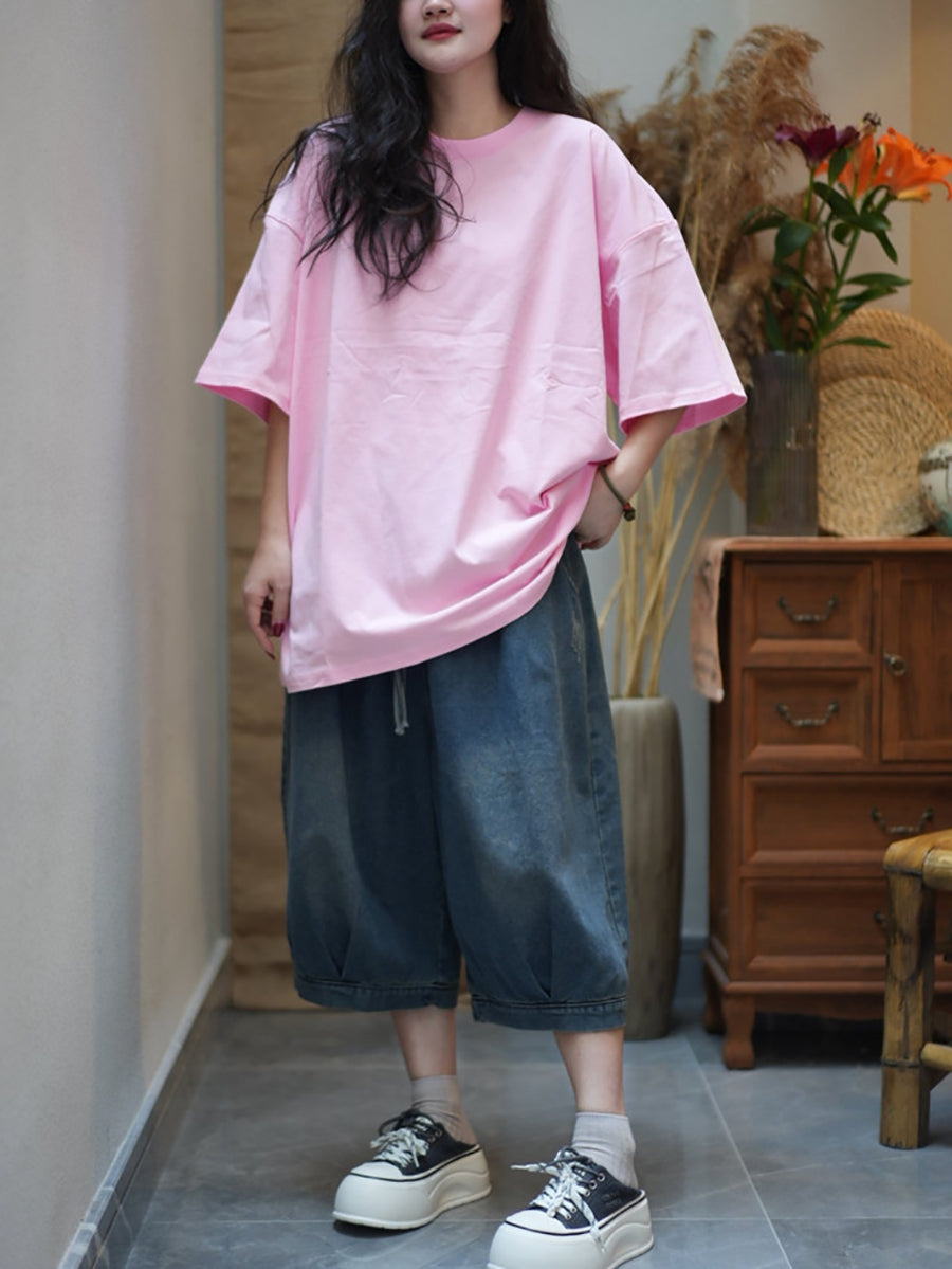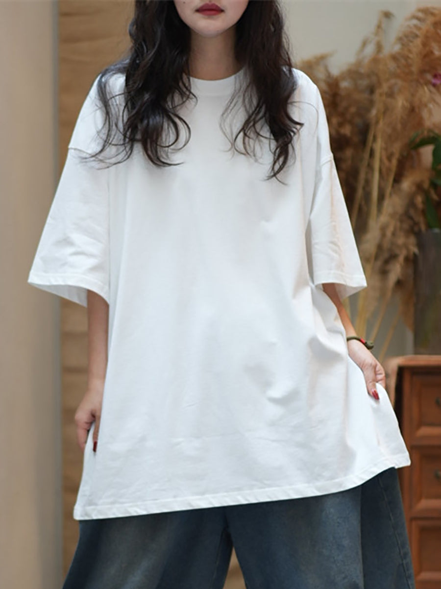 Women Summer Casual Pure Color Cotton O-Neck Shirt