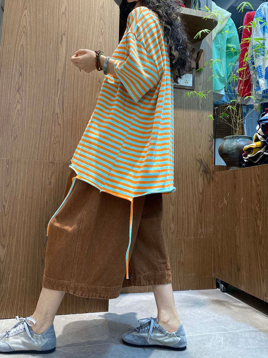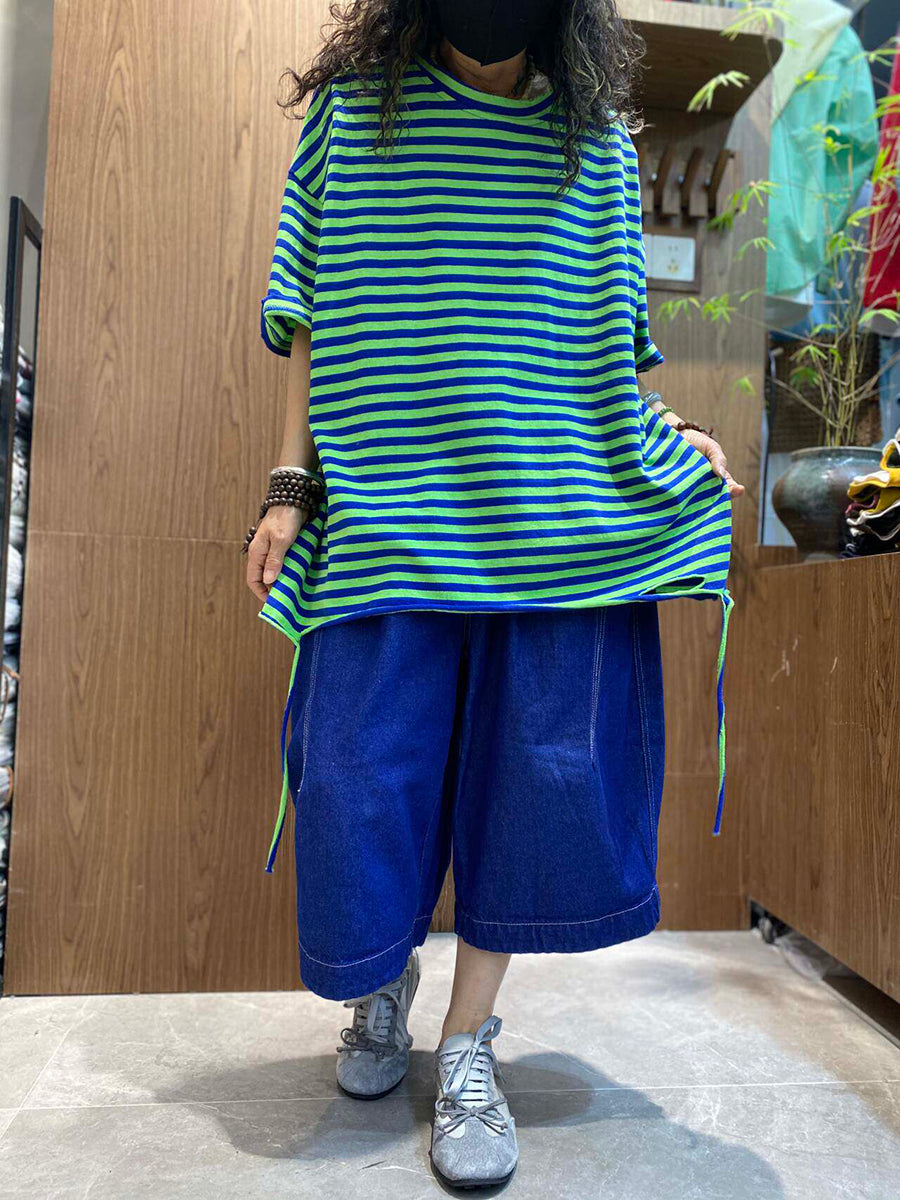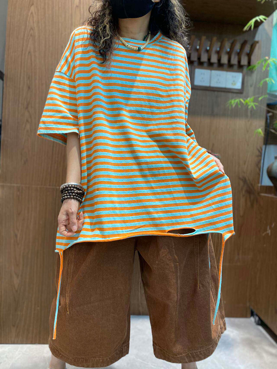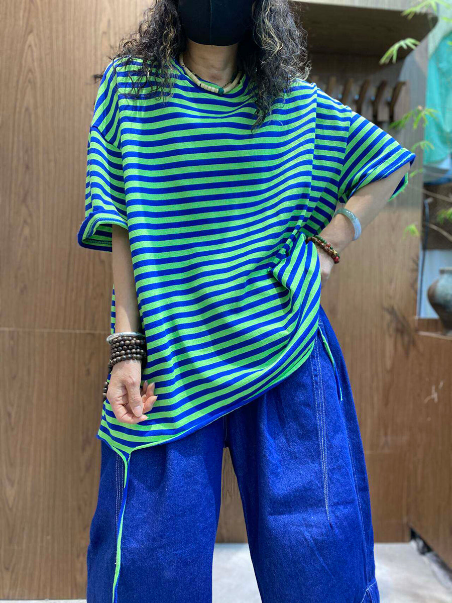 Women Summer Casual Stripe O-Neck Cotton Shirt
