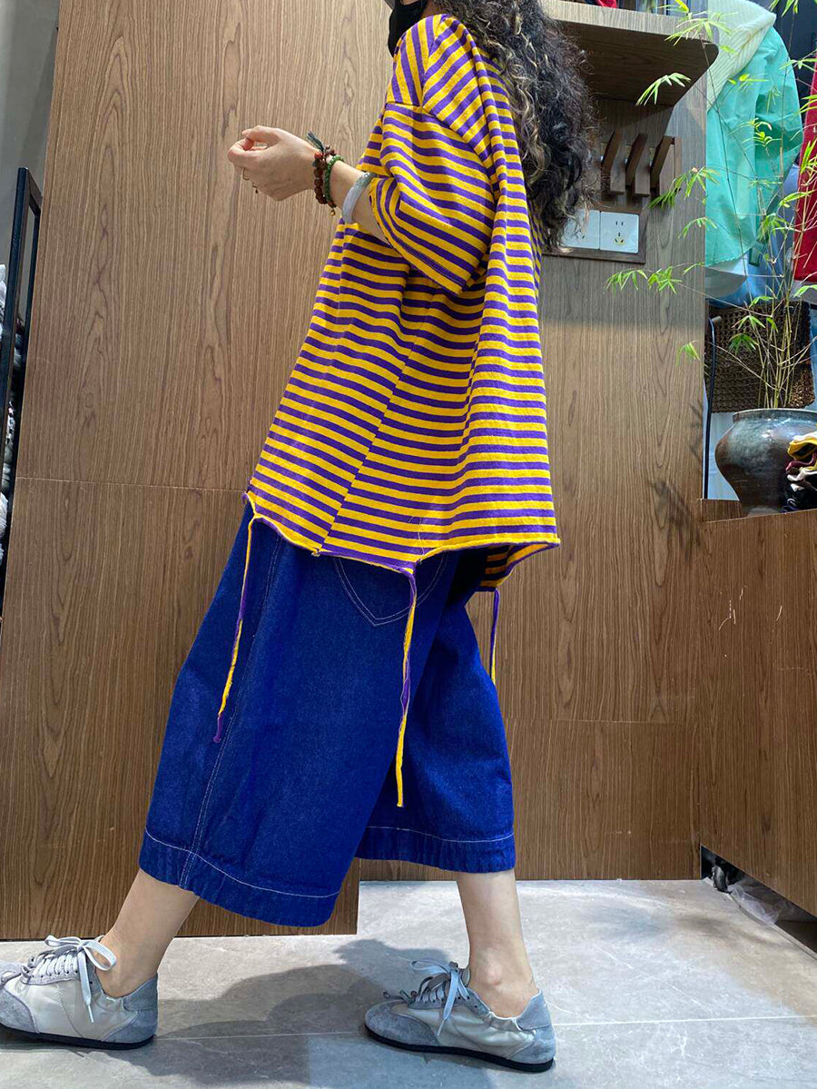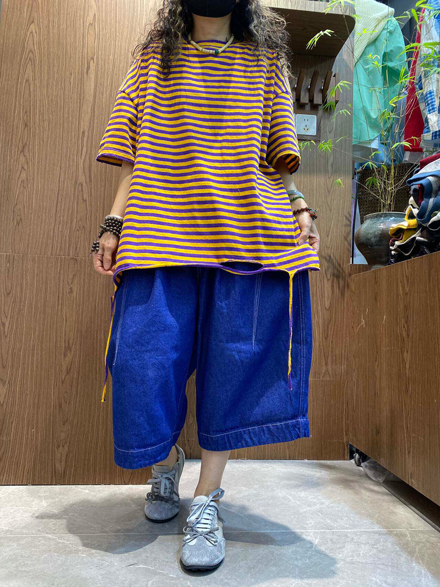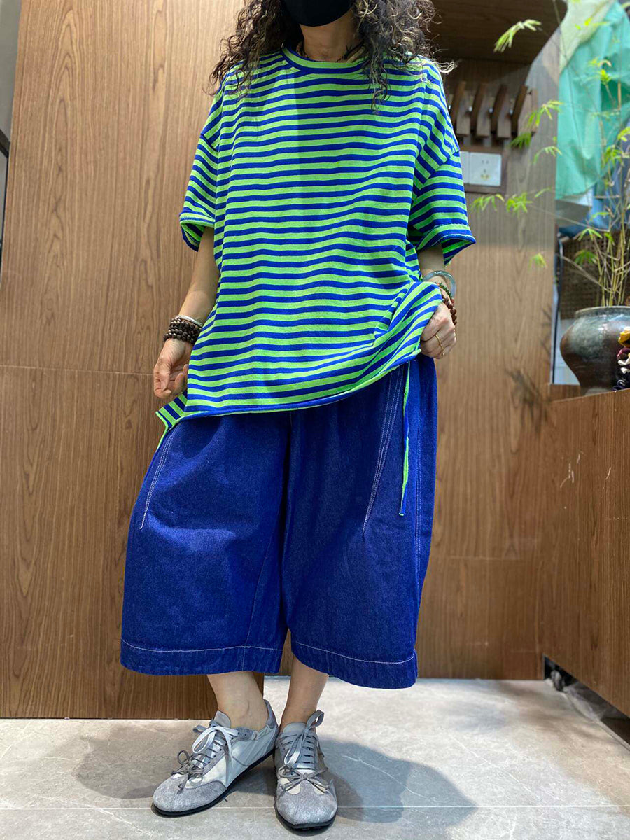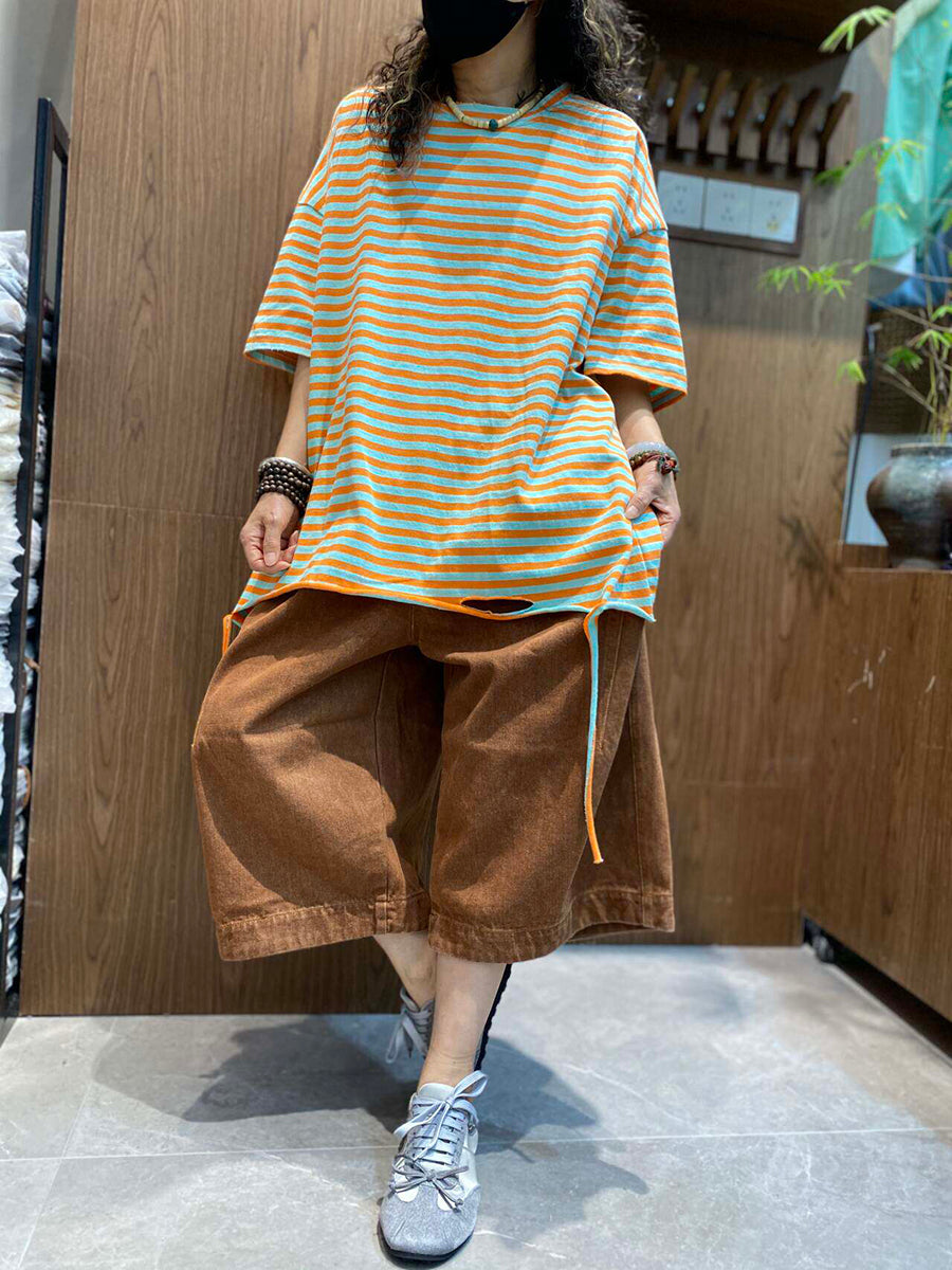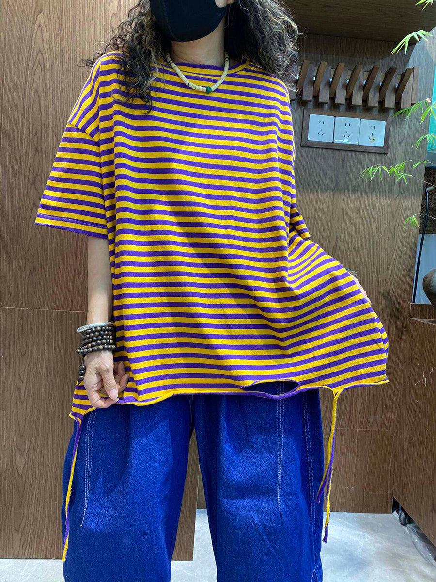 Women Summer Casual Stripe O-Neck Cotton Shirt