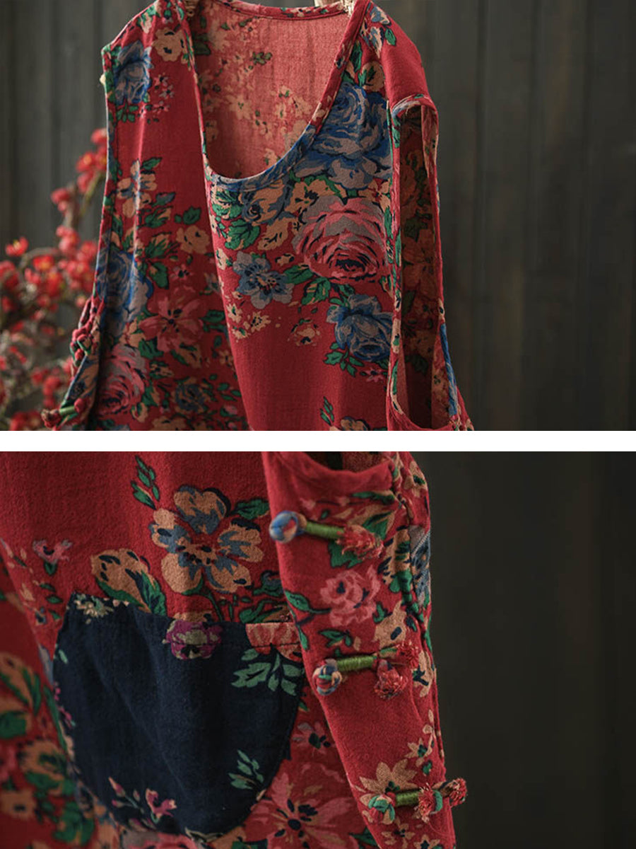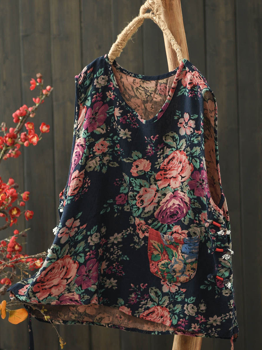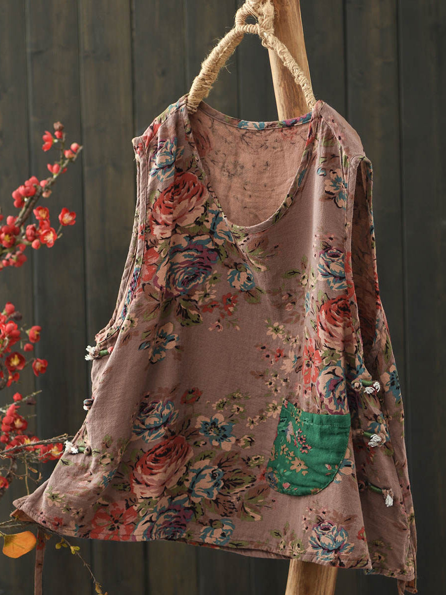 Women Summer Ethnic Flower O-Neck Cotton Vest