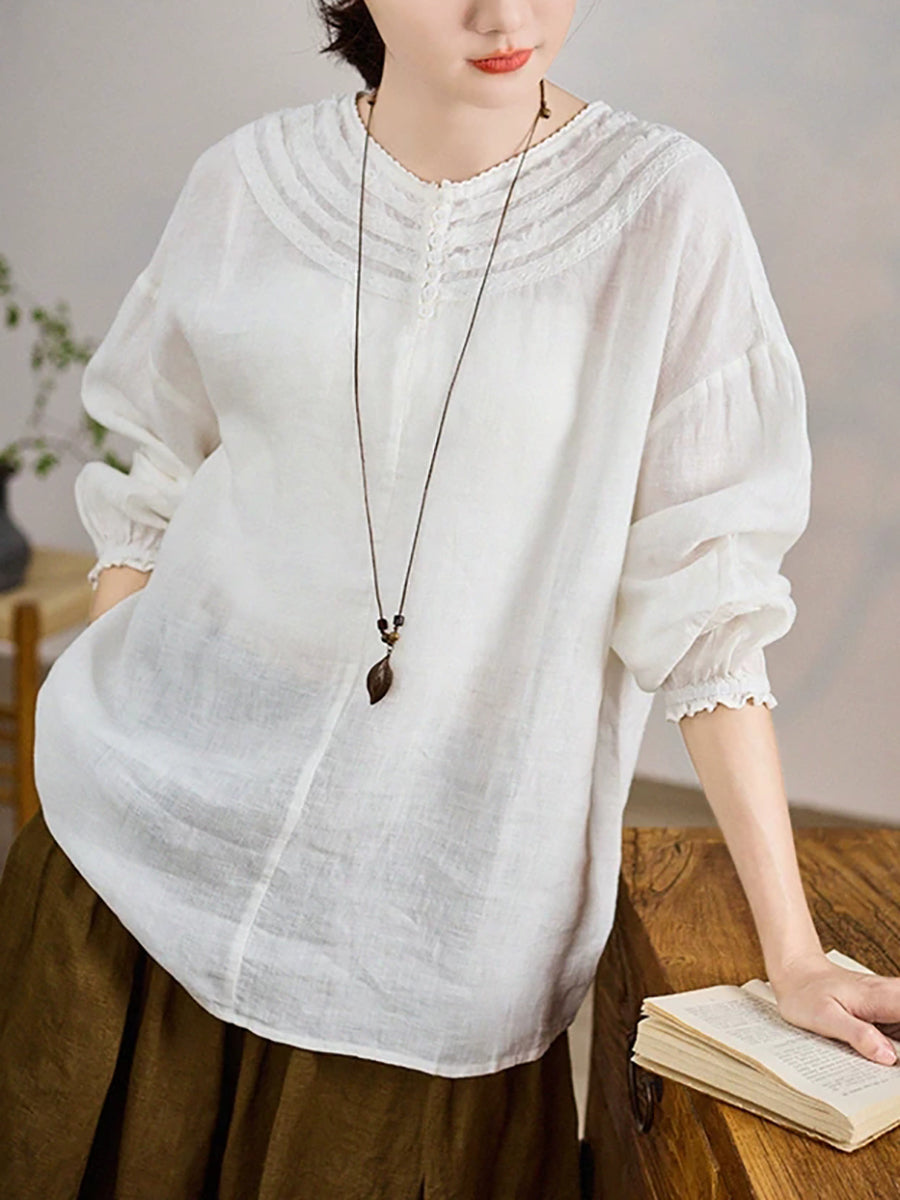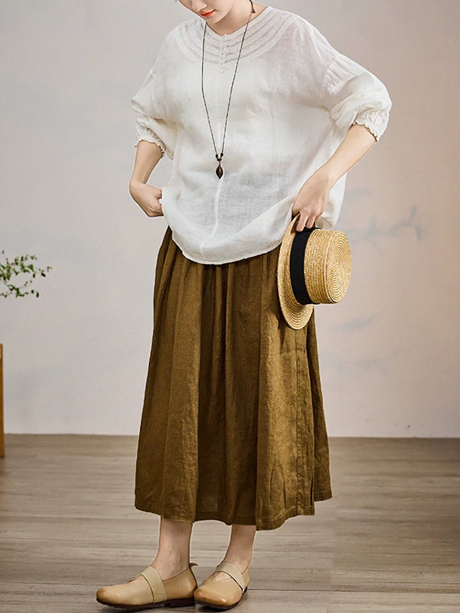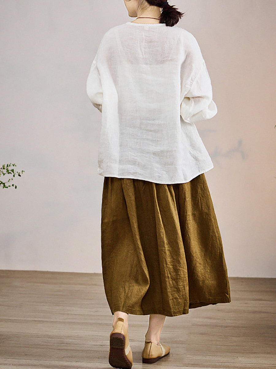 Women Summer Pure Color O-Neck 100%Linen Blouse