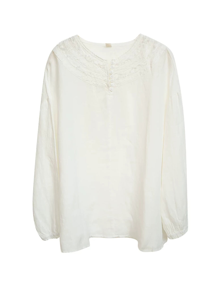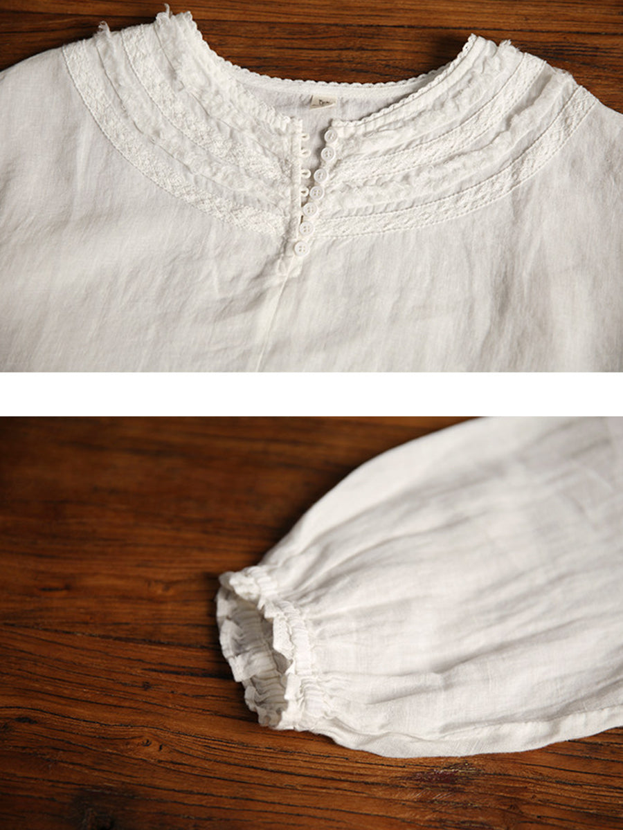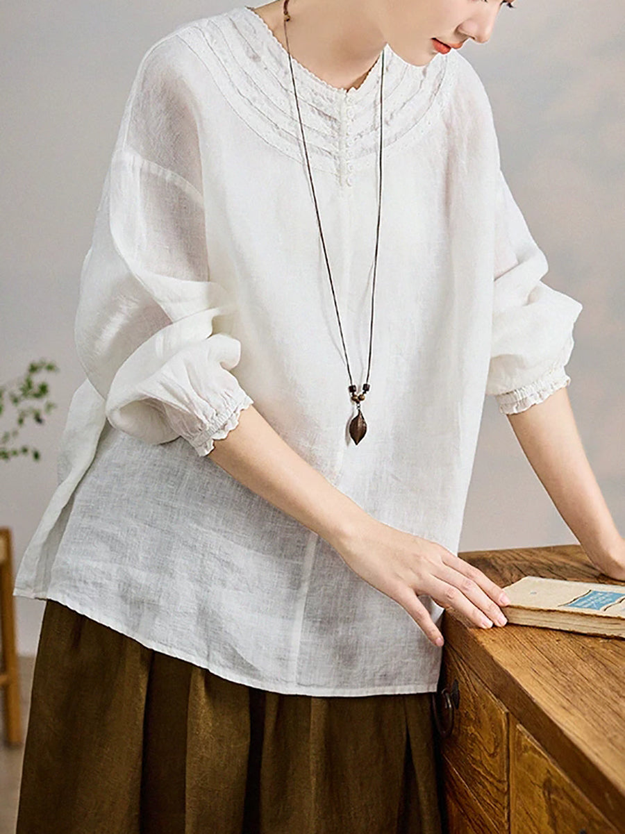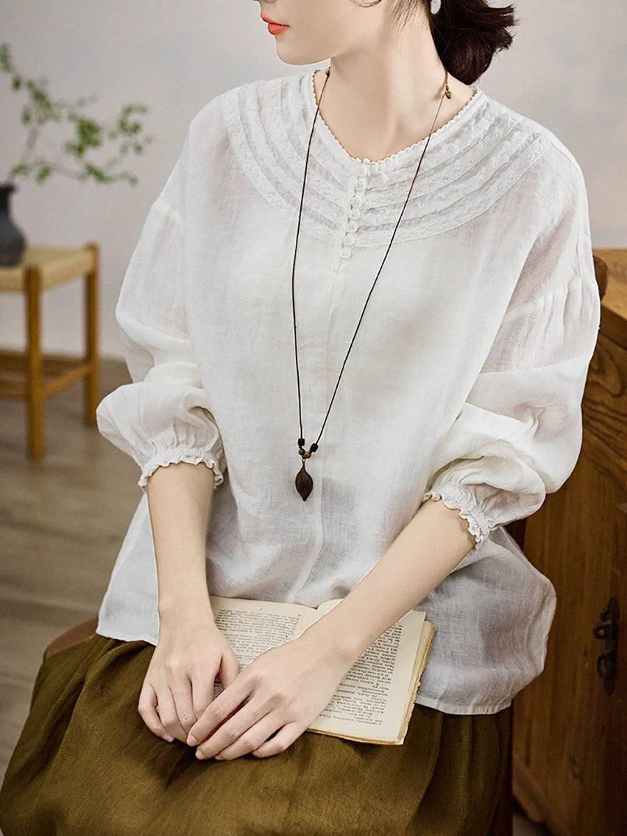 Women Summer Pure Color O-Neck 100%Linen Blouse