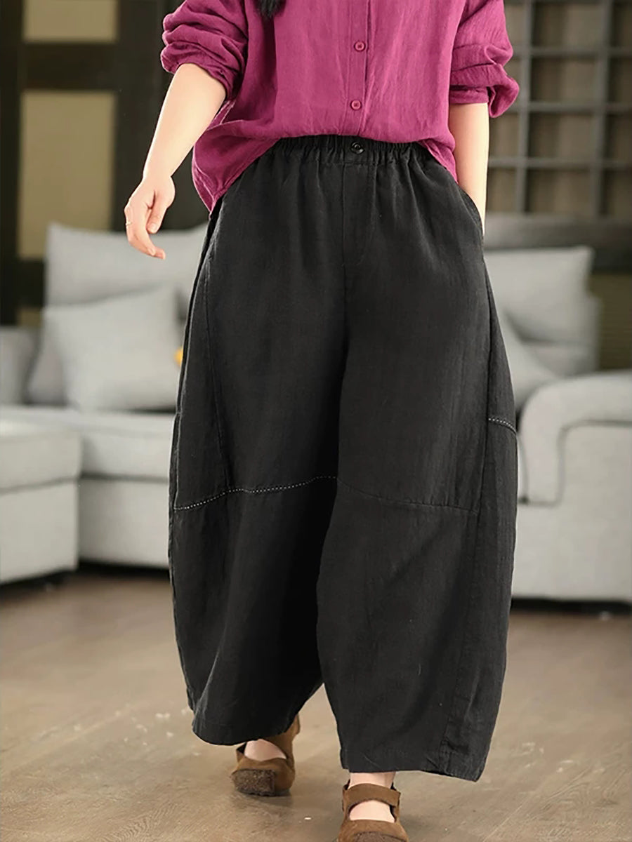Women Summer Retro Pure Color 100%Linen Wide-leg Pants
