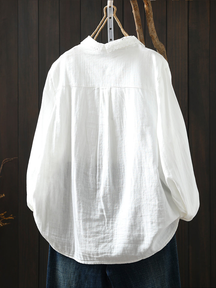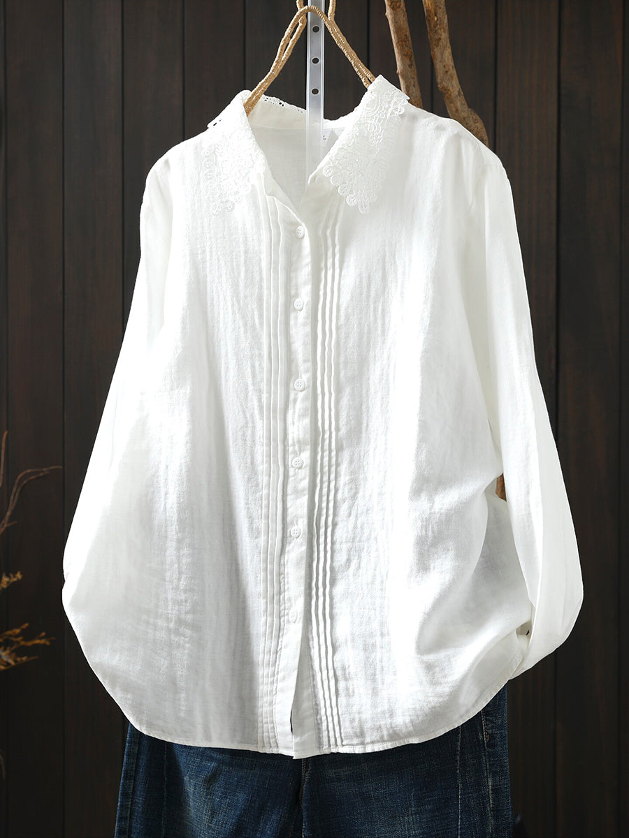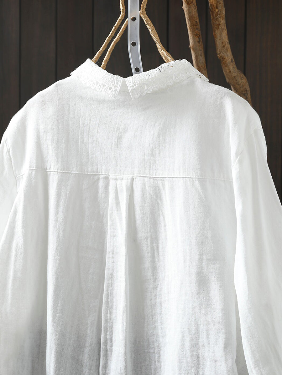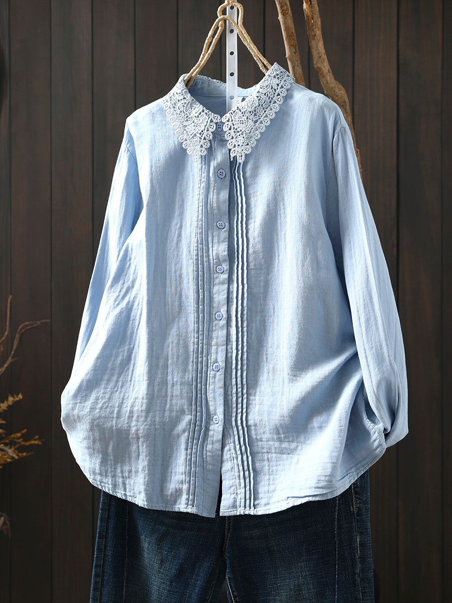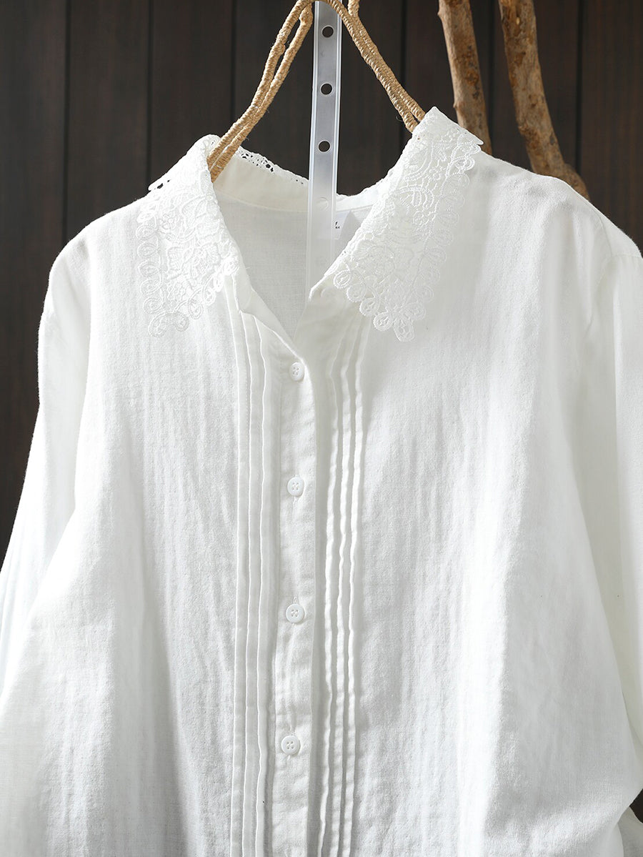 Women Summer Shirred Lace Collar 100%Cotton Shirt