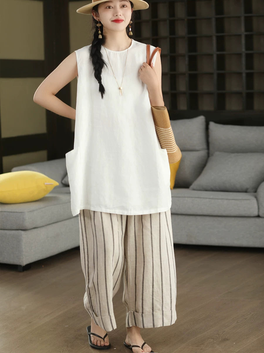 Women Summer Vintage 100% Hemp Linen Striped Wide Leg Pants