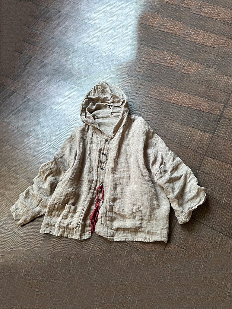 Plus Size Women Summer Vintage Linen Solid Button-up Hooded Shirt