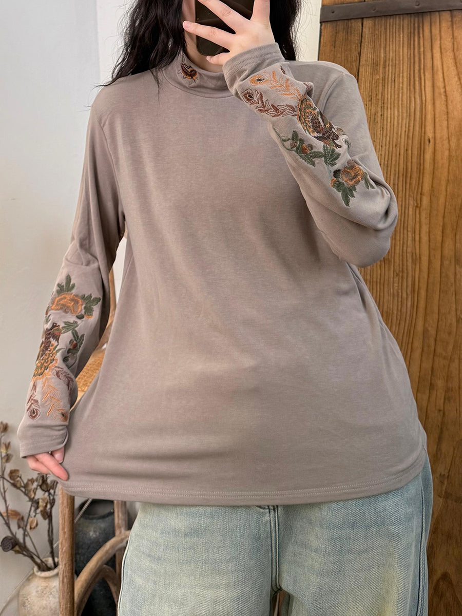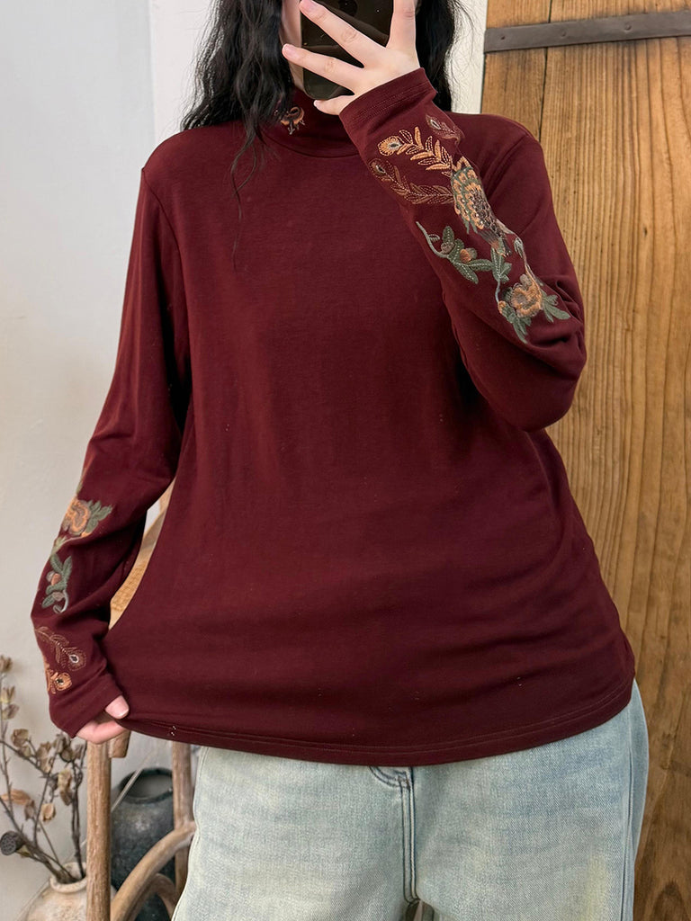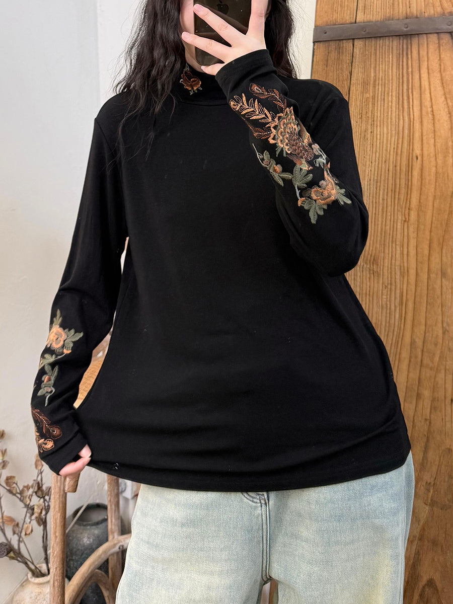 Women Vintage Autumn Embroidery Half-Turtleneck Blouse