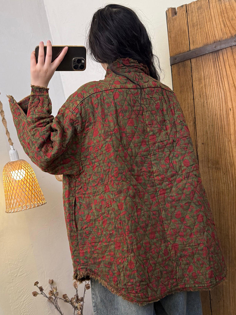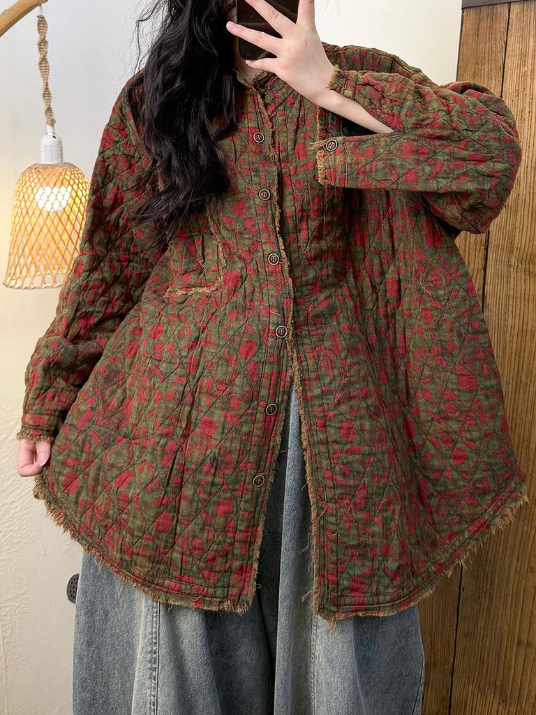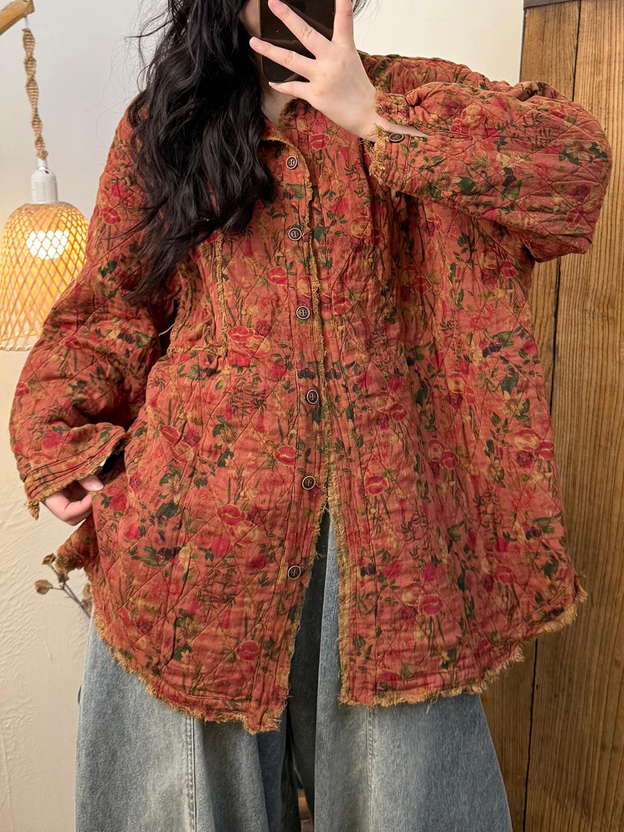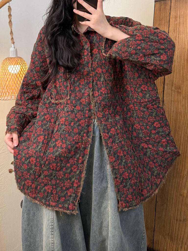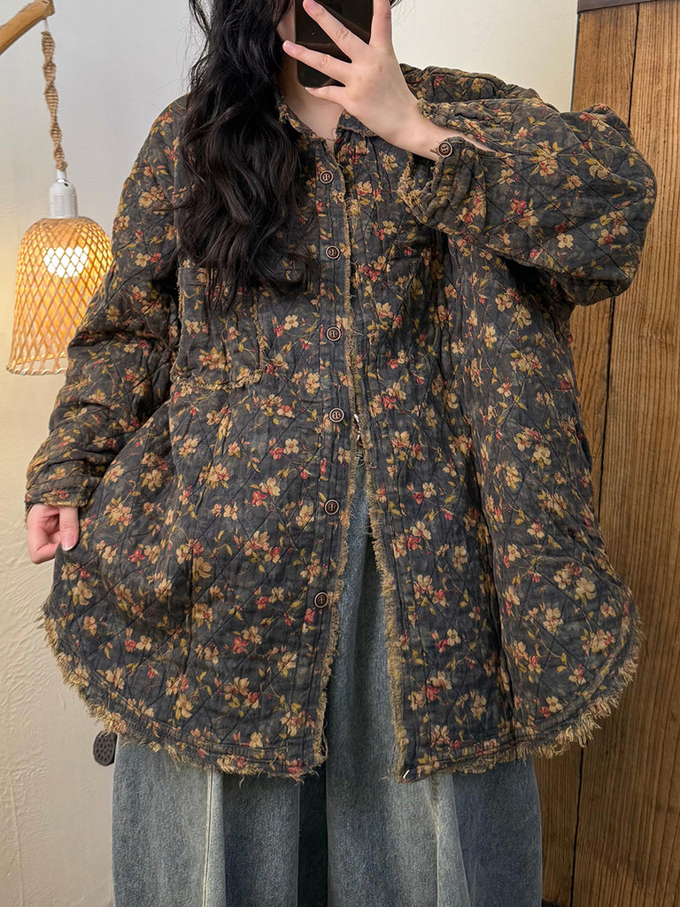 Women Vintage Autumn Floral Turn-down Collar Cotton Jacket