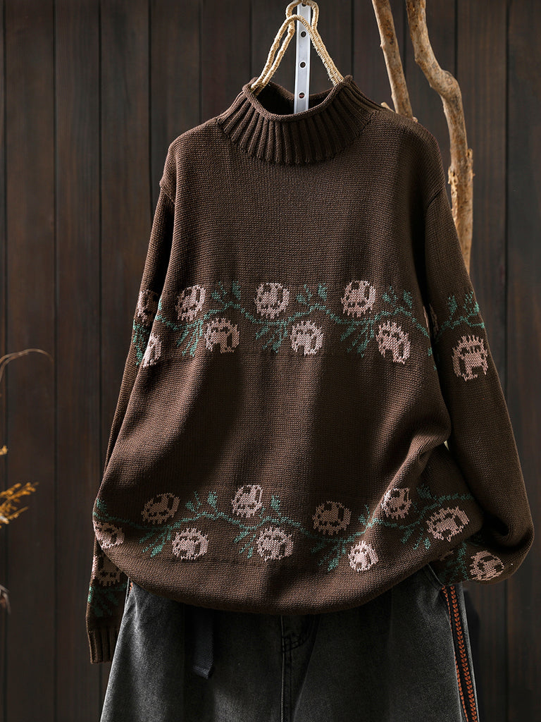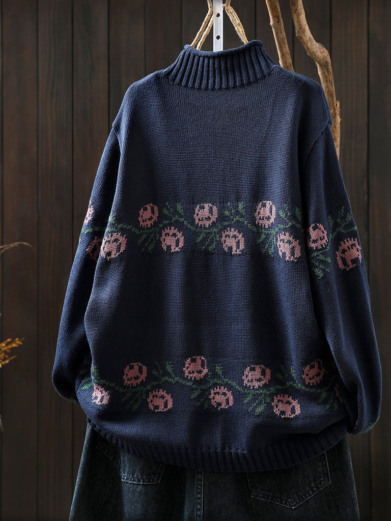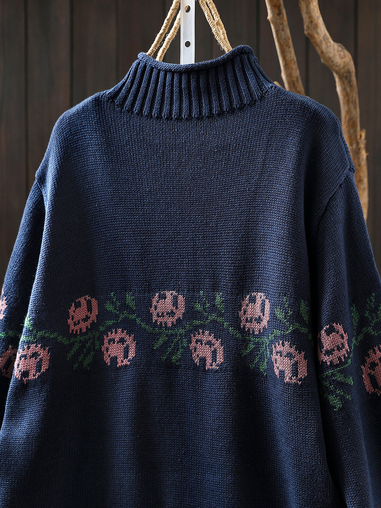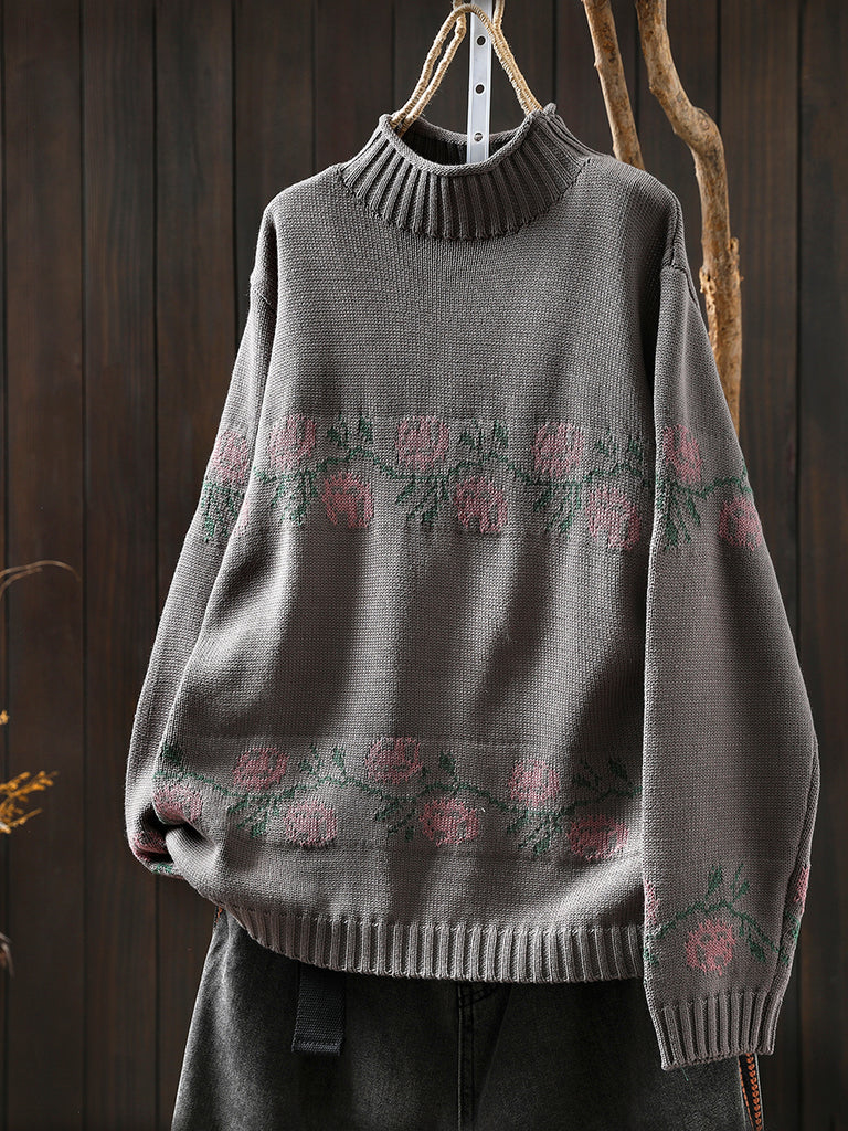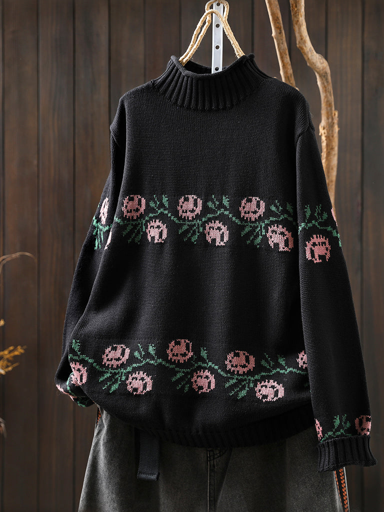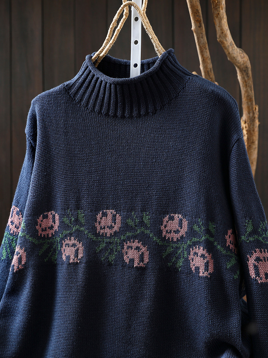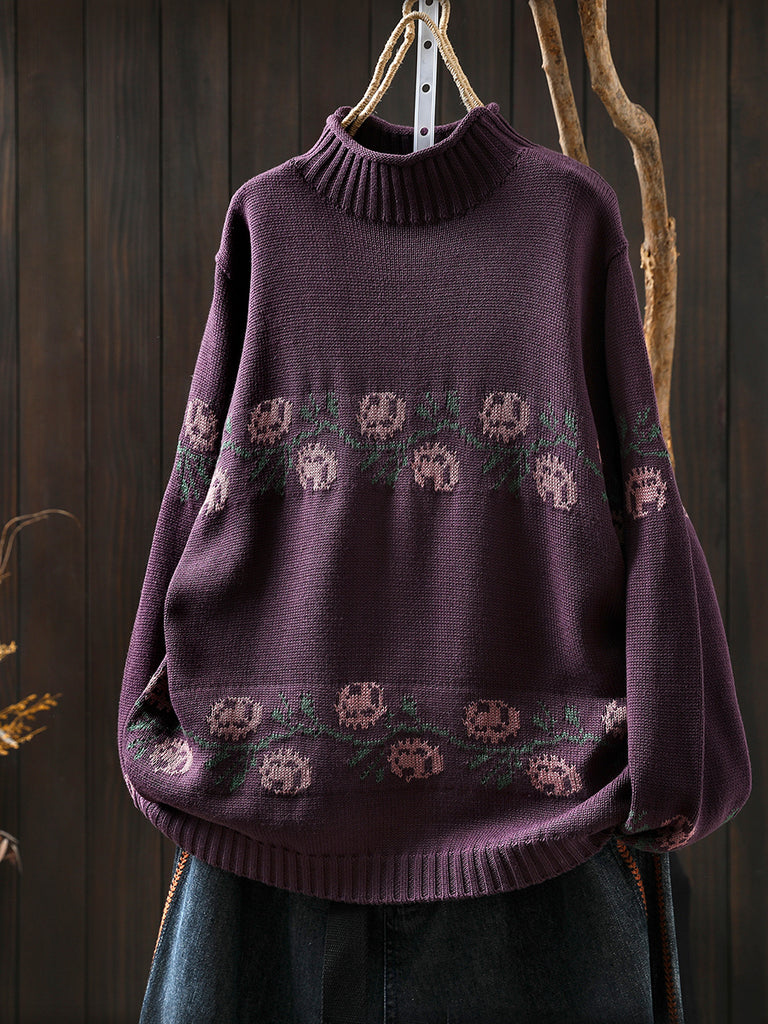 Women Vintage Autumn Flower Half-Turtleneck Sweater