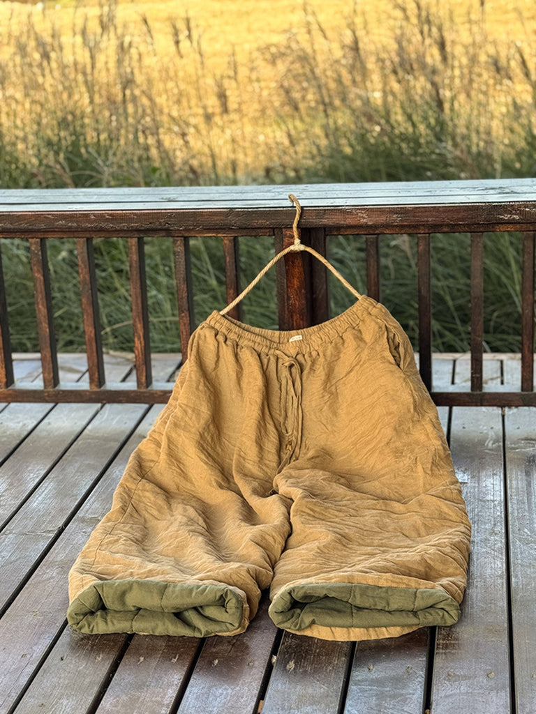 Plus Size Women Vintage Autumn Solid Ramie Padded Wide-leg Pants