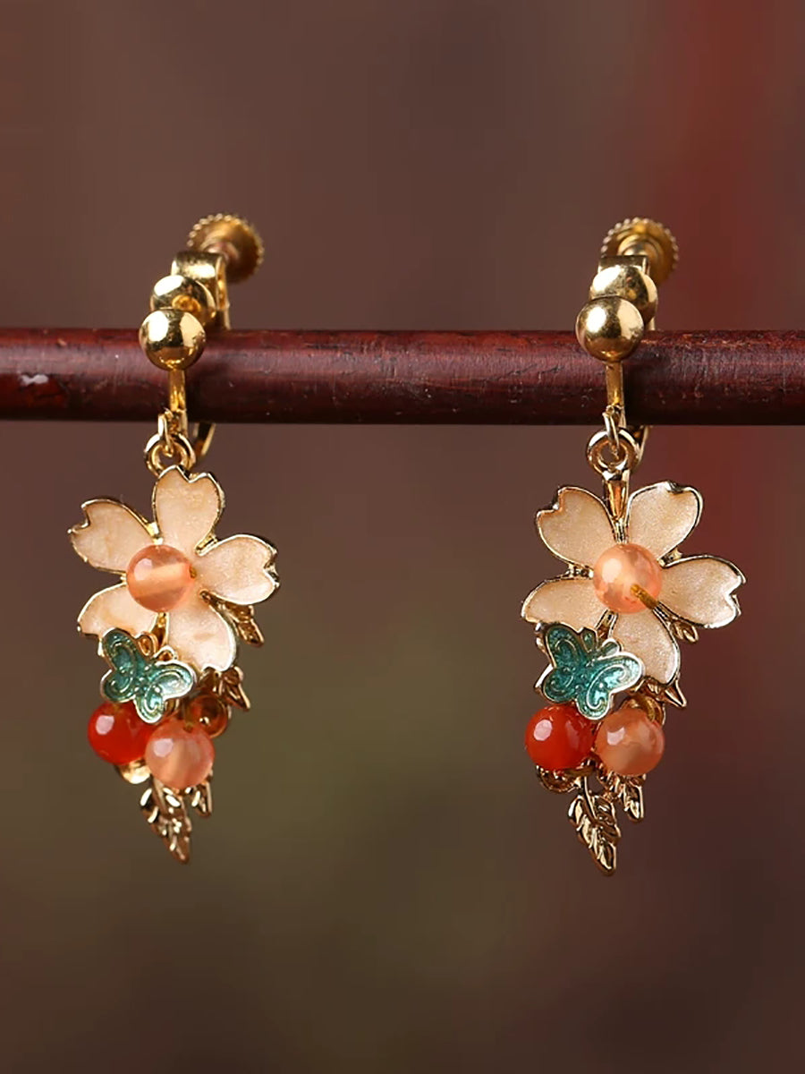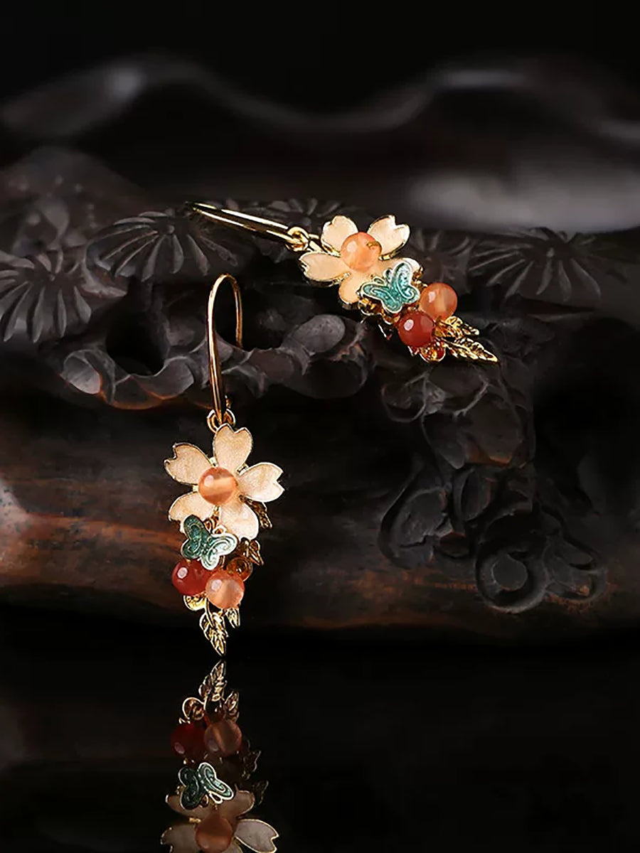 Women Vintage Cloisonne Flower Jade Earrings