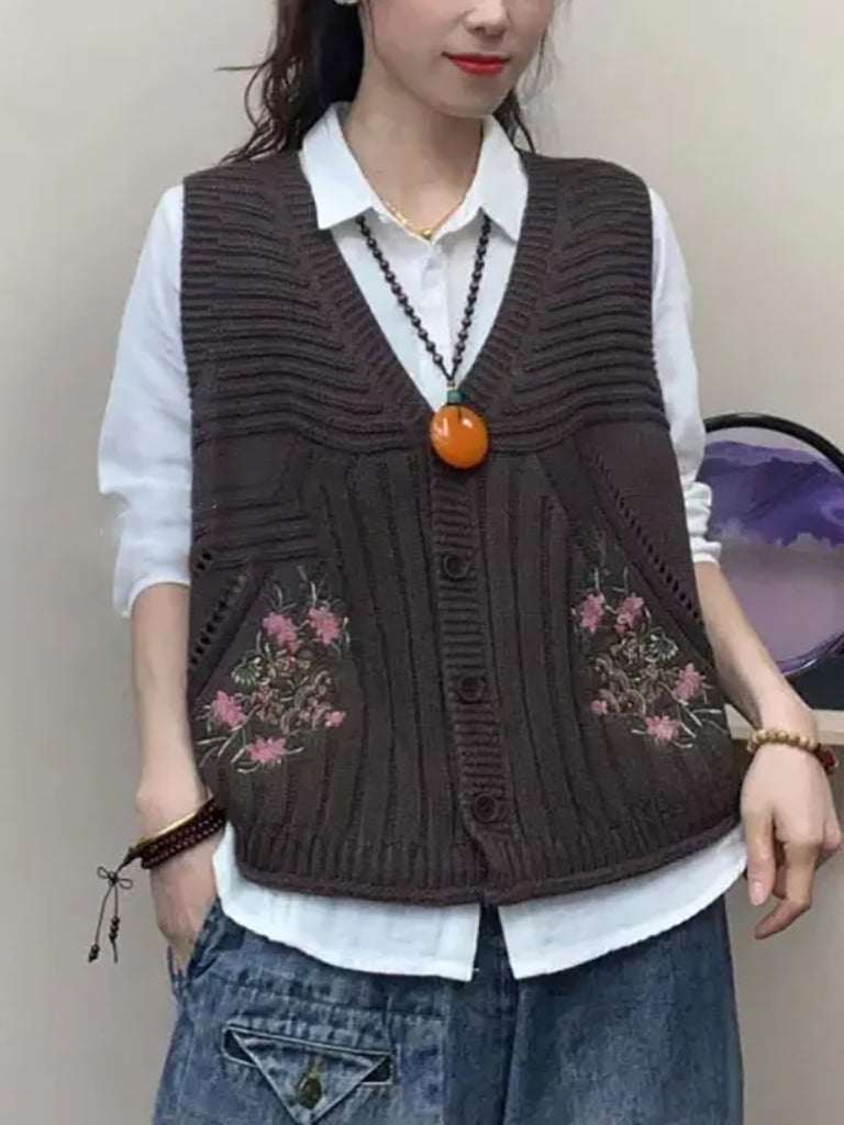Women Vintage Floral Embroidery V-neck Knitted Vest