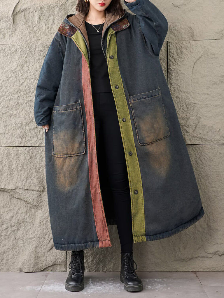 Crafted from cotton, this vintage-inspired padded coat features a spliced design and a hooded collar. It offers full-length, classic-style sleeves, making it an ideal outer layer for autumn and winter seasons.